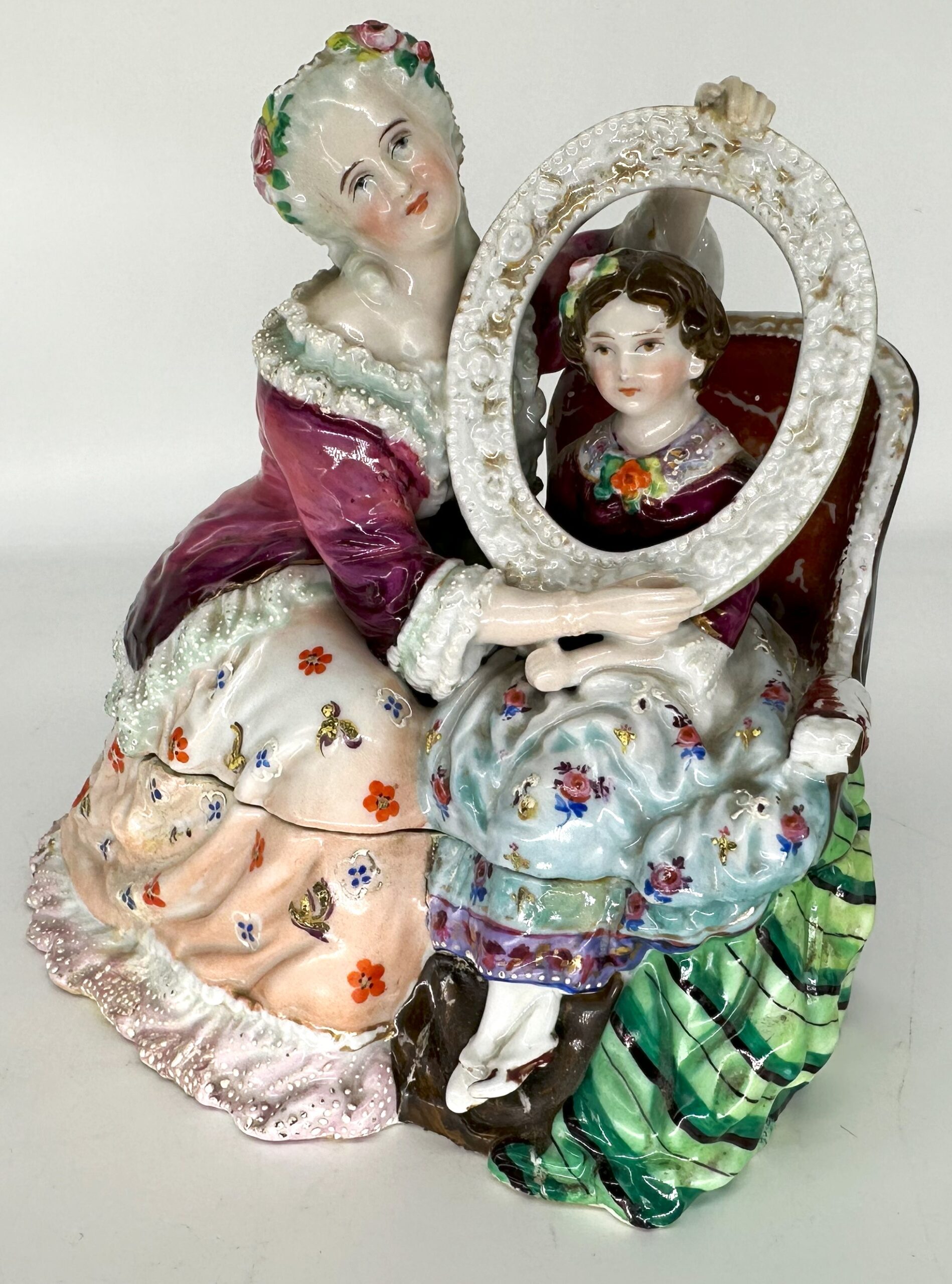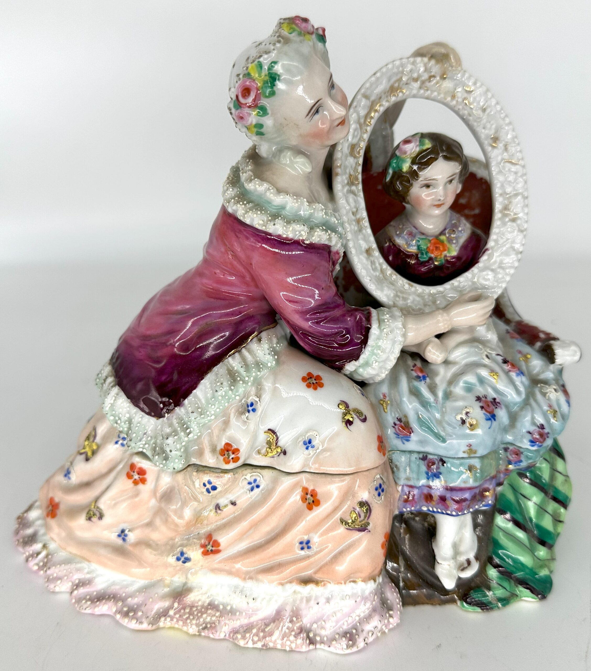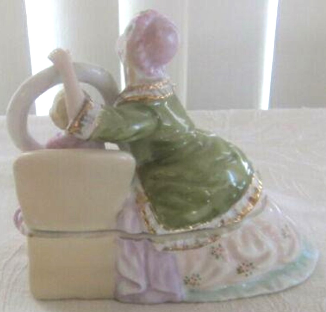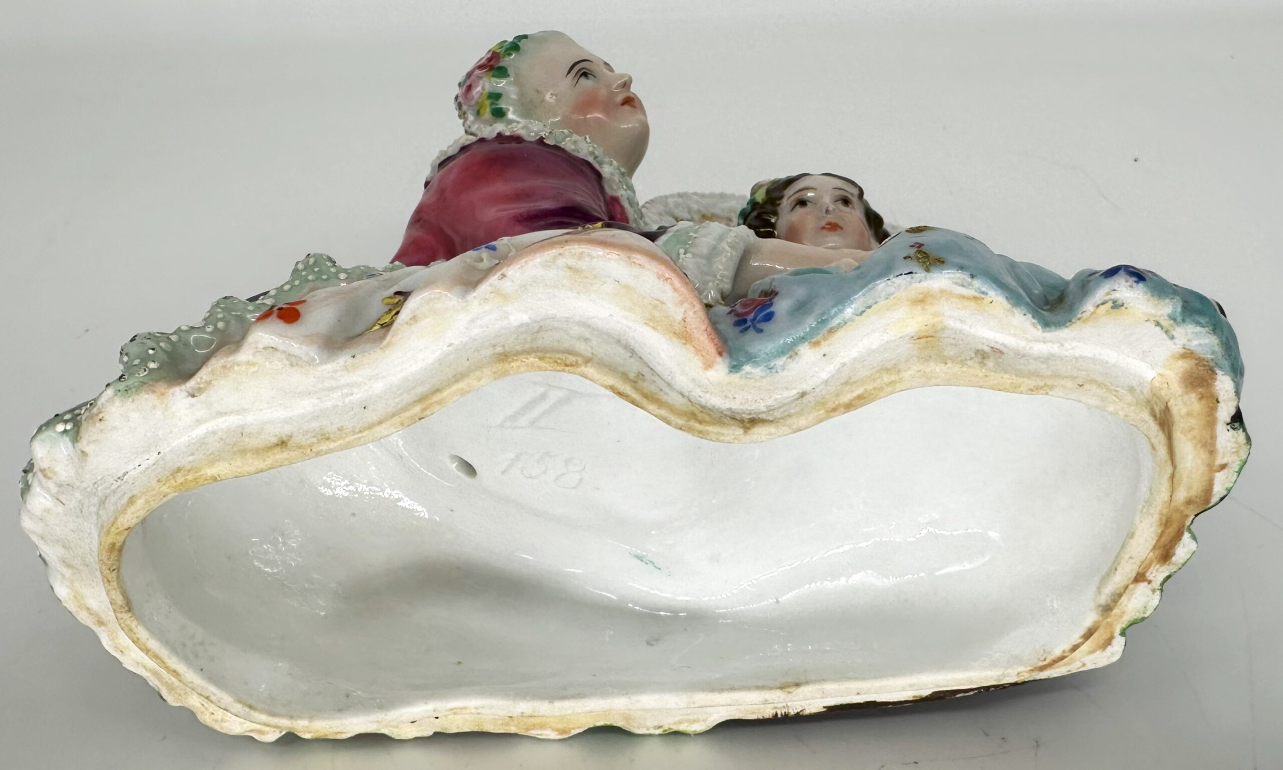 This inkstand features two porcelain figures – a mother and her daughter. The mother holds up an object (a picture frame? a mirror?) that frames the child’s face. The piece was crafted with amazing detail – note the beading, ruffles, lace, patterns on the clothing. The top lifts off to access the ink pot and sander underneath. Conta Boehme (Germany) made this inkstand.