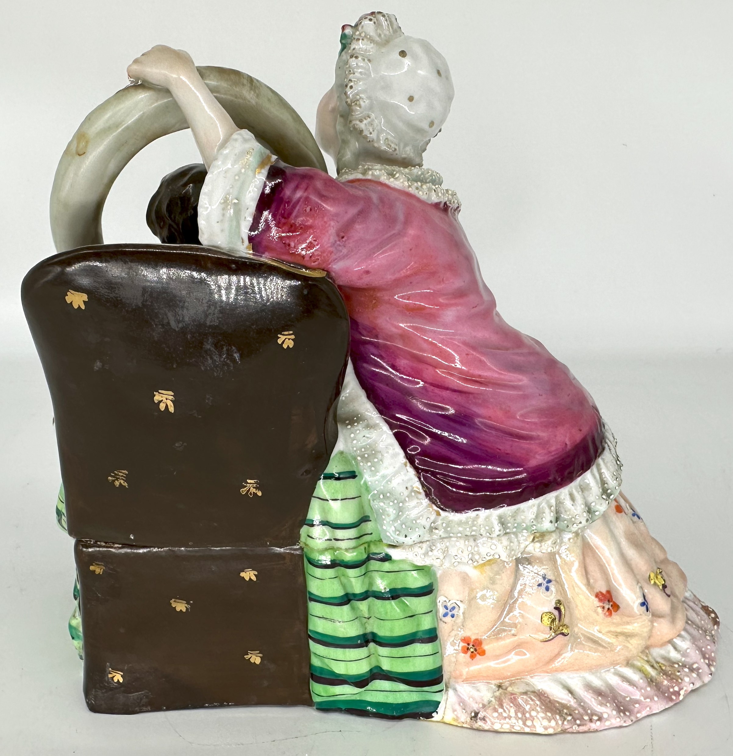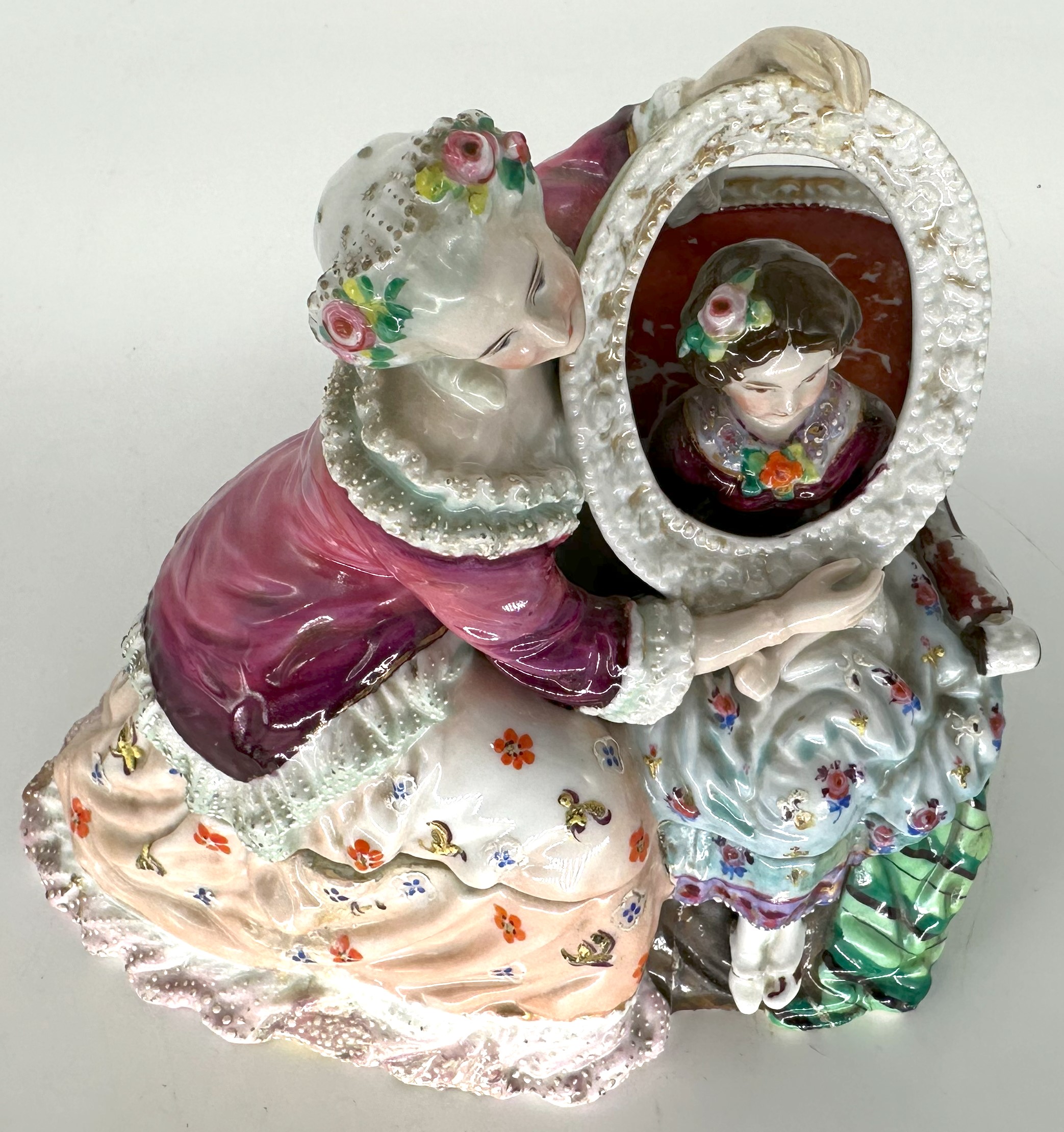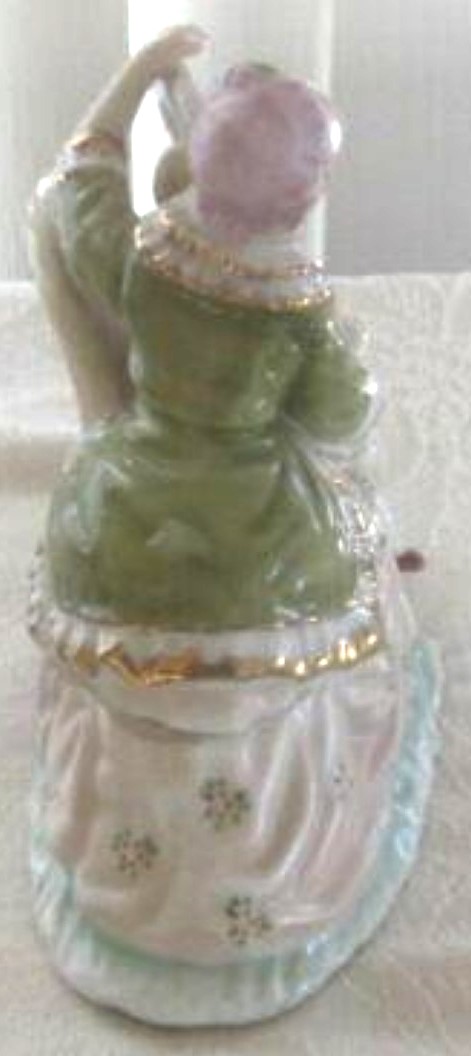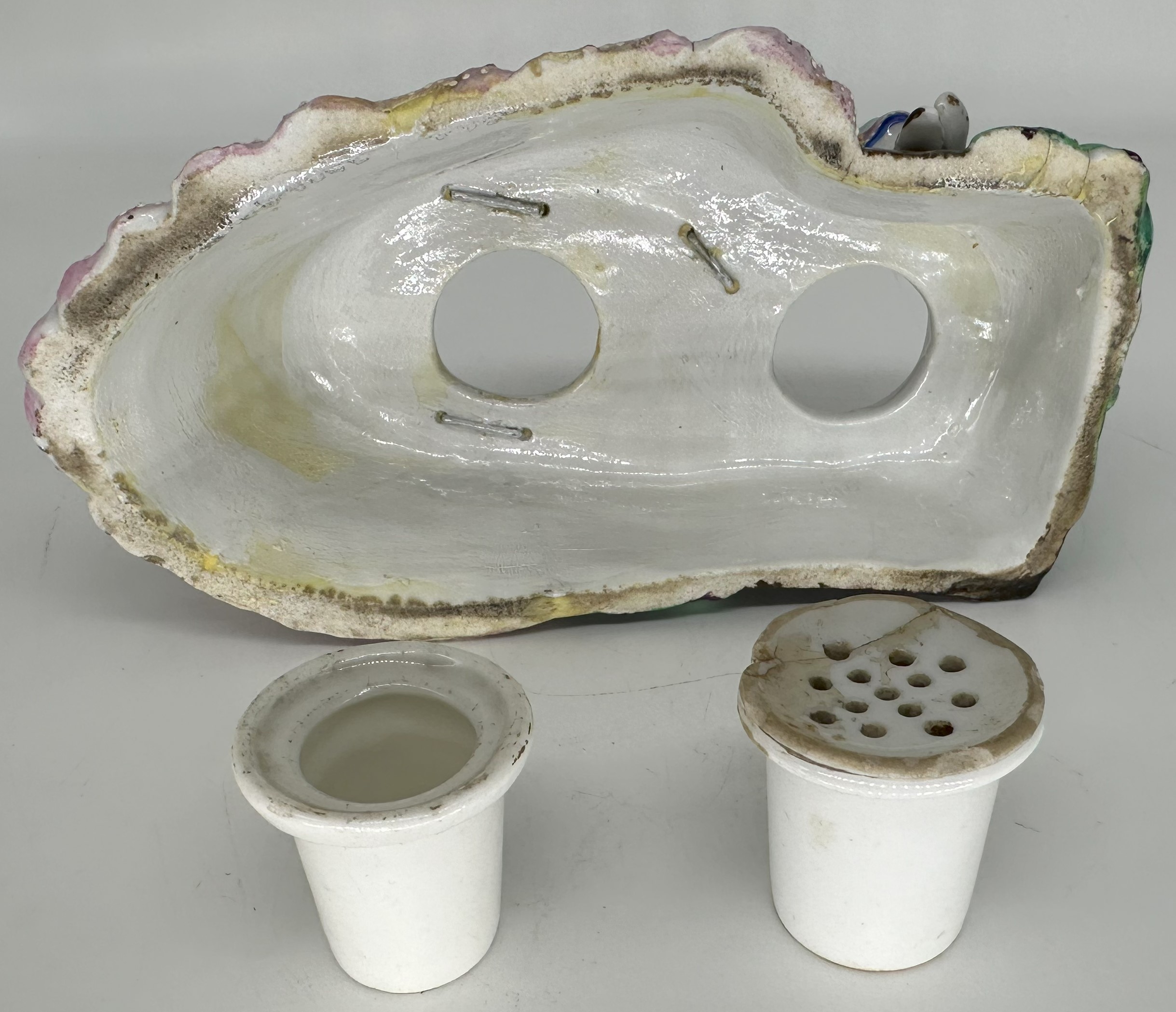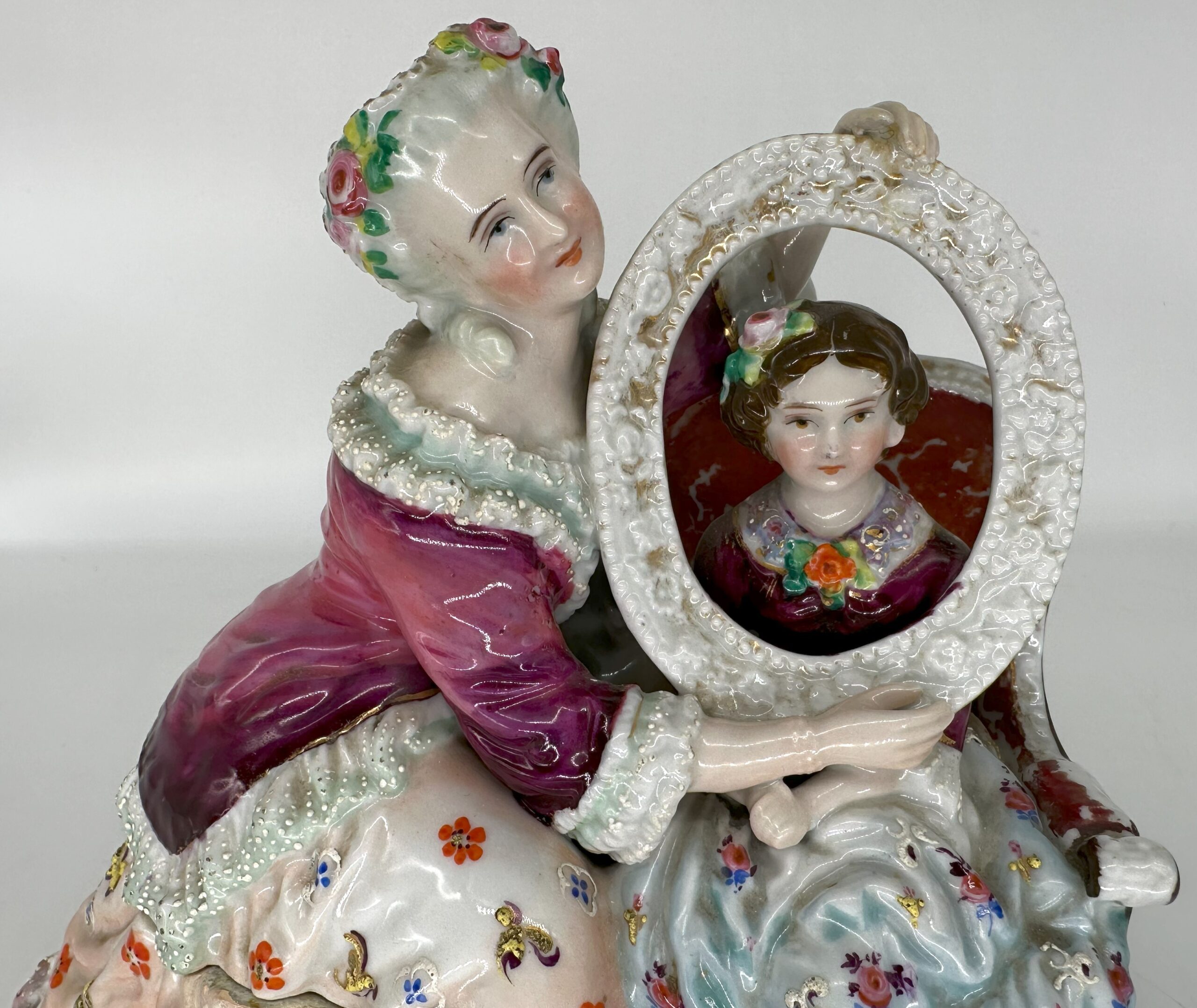 This inkstand features two porcelain figures – a mother and her daughter. The mother holds up an object (a picture frame? a mirror?) that frames the child’s face. The piece was crafted with amazing detail – note the beading, ruffles, lace, patterns on the clothing. The top lifts off to access the ink pot and sander underneath. Conta Boehme (Germany) made this inkstand.