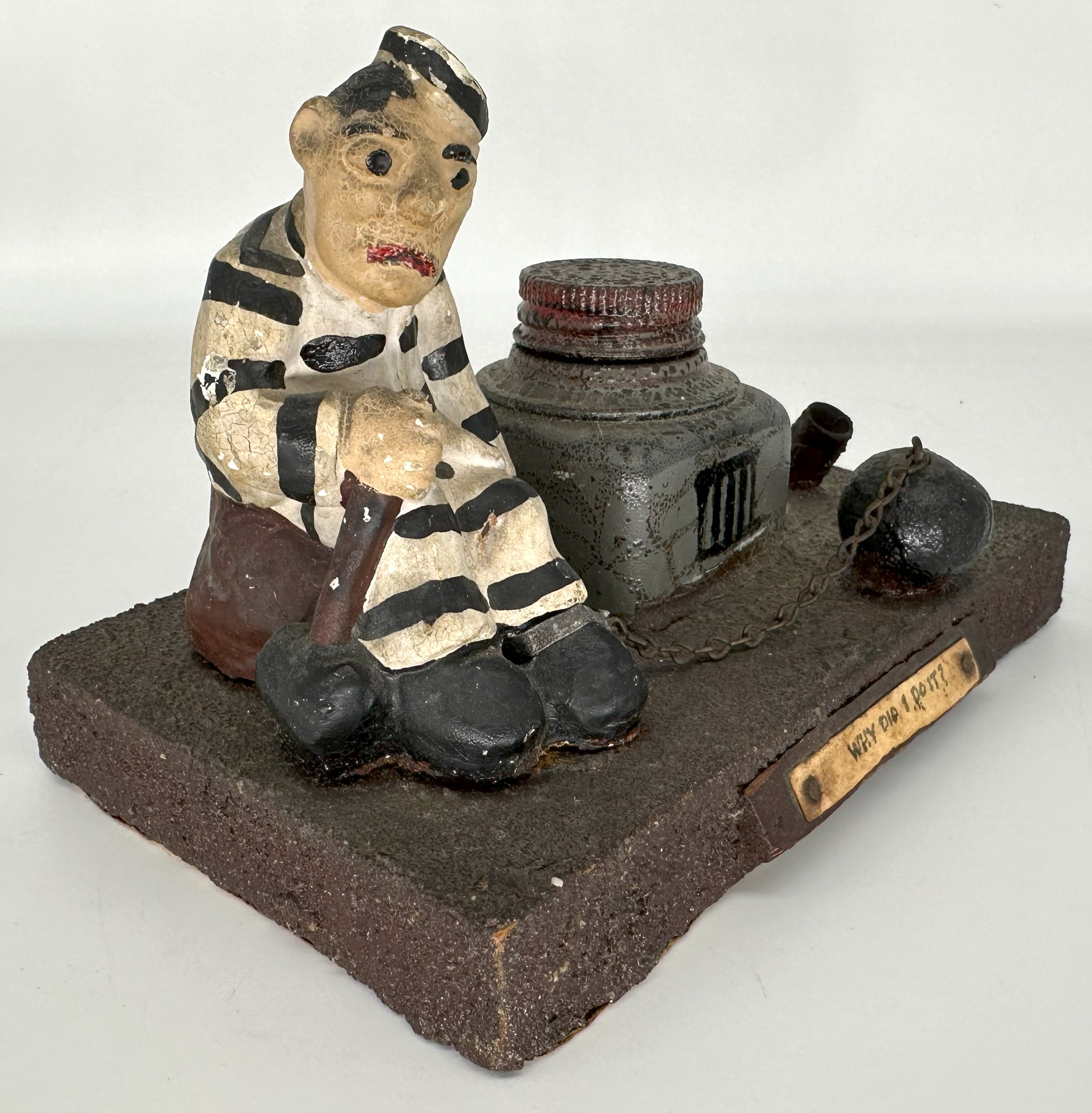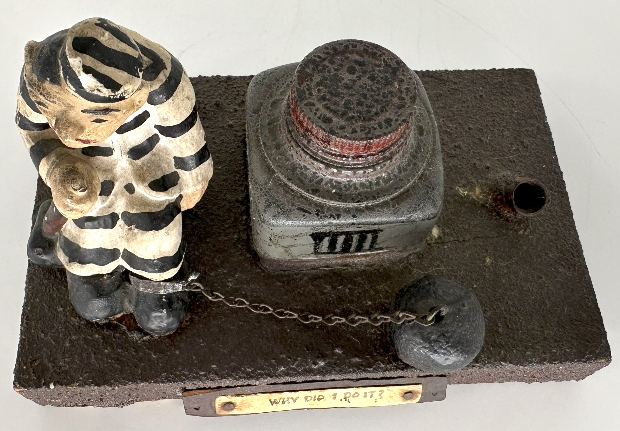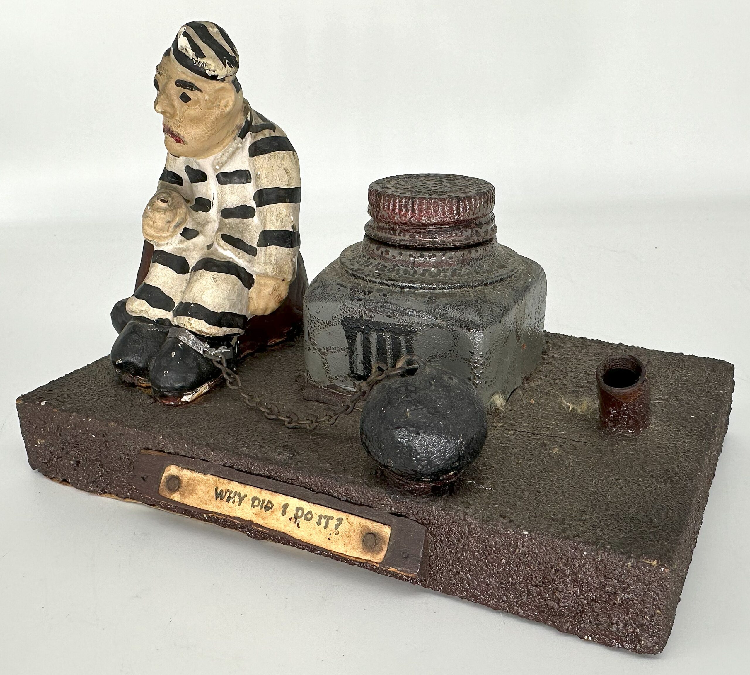 A hand-carved wooden prisoner, in traditional prison garb of black and white horizontal stripes, wears a ball & chain. He sits on a rock, sledgehammer in hand, next to an ink bottle – even the bottle has prison bars painted on it. There’s a pen holder at the other end. In the front is a handwritten plaque which asks, “Why Did I Do It?” A nice piece of folk art – one-of-a-kind.
