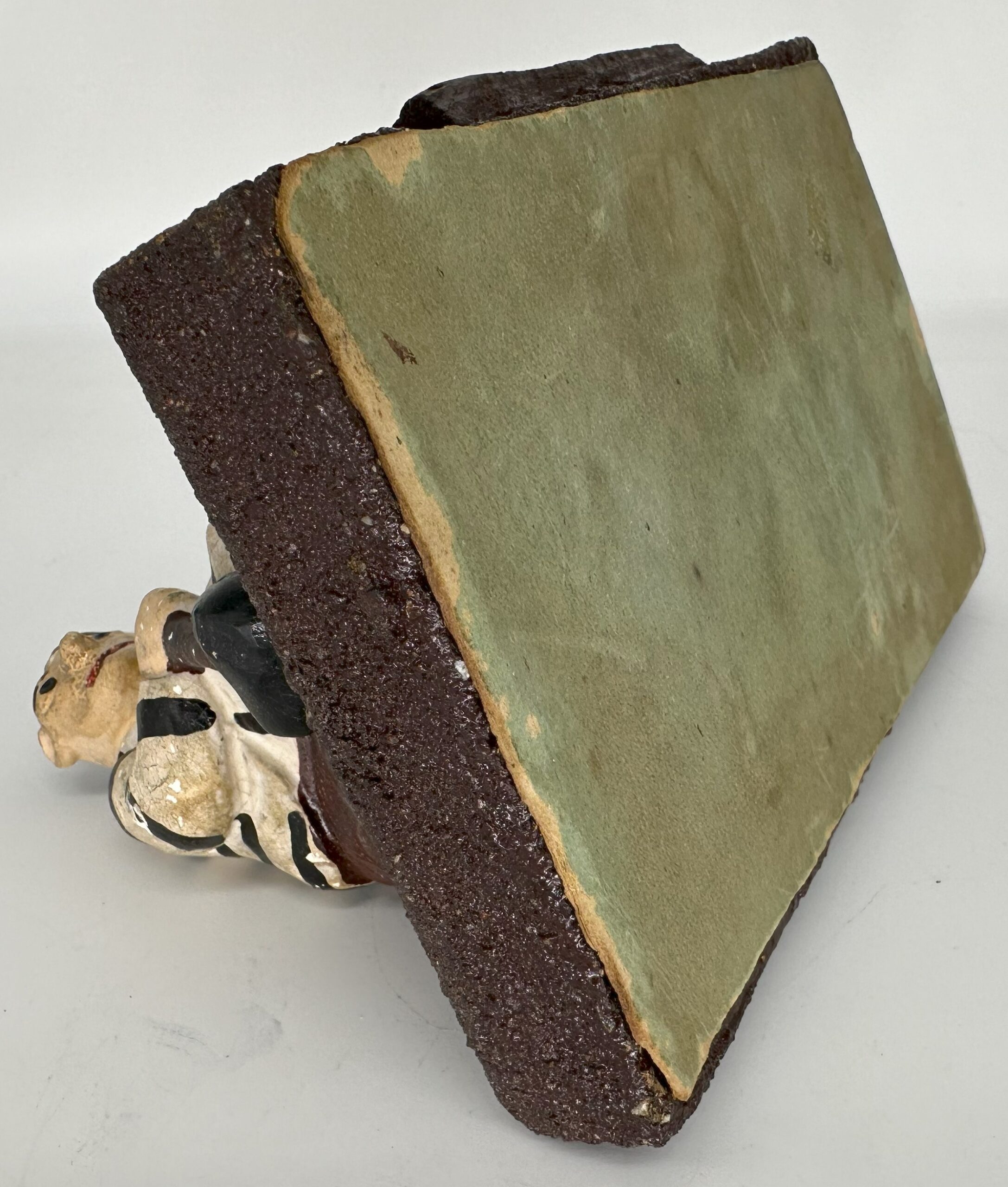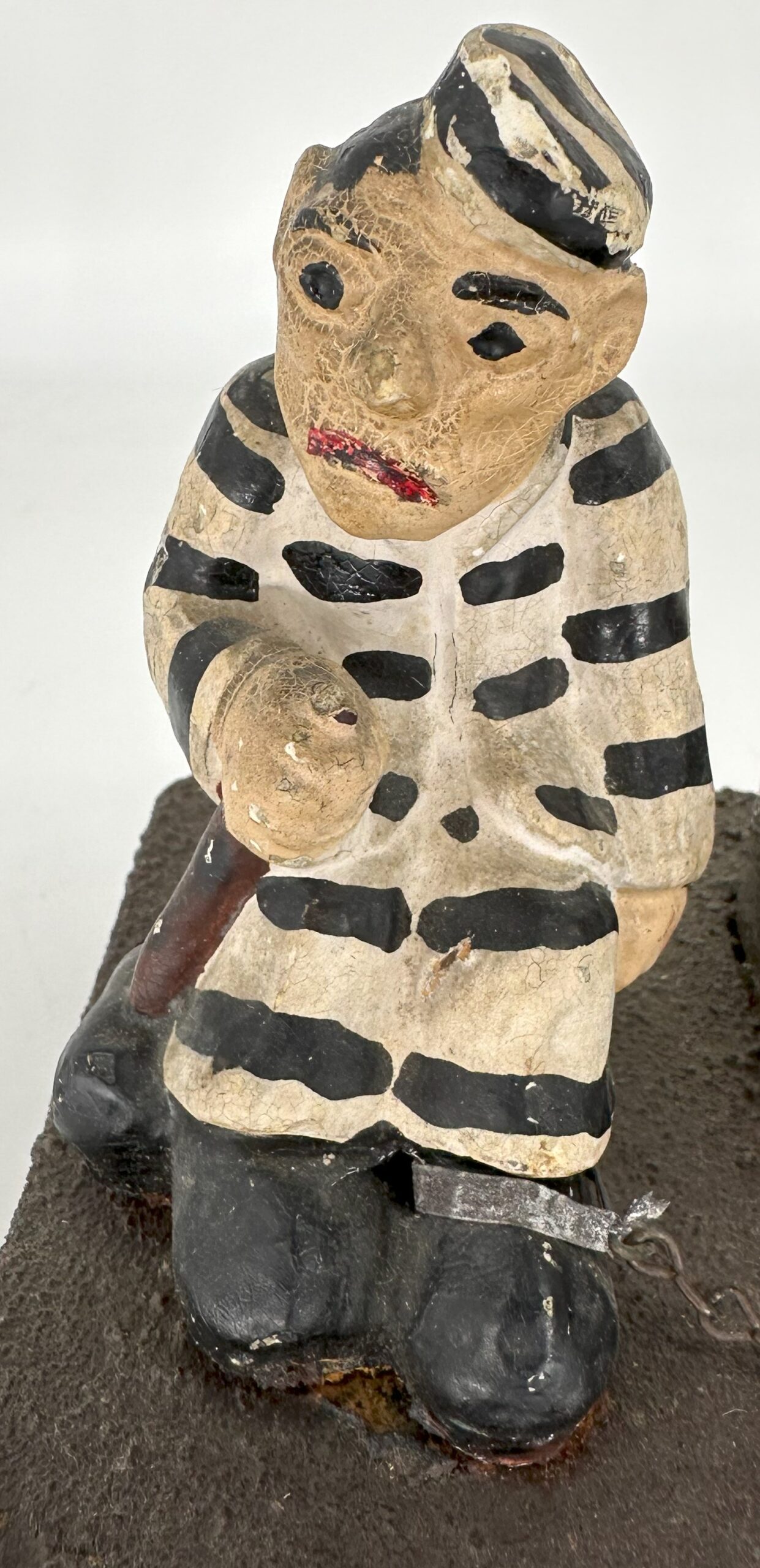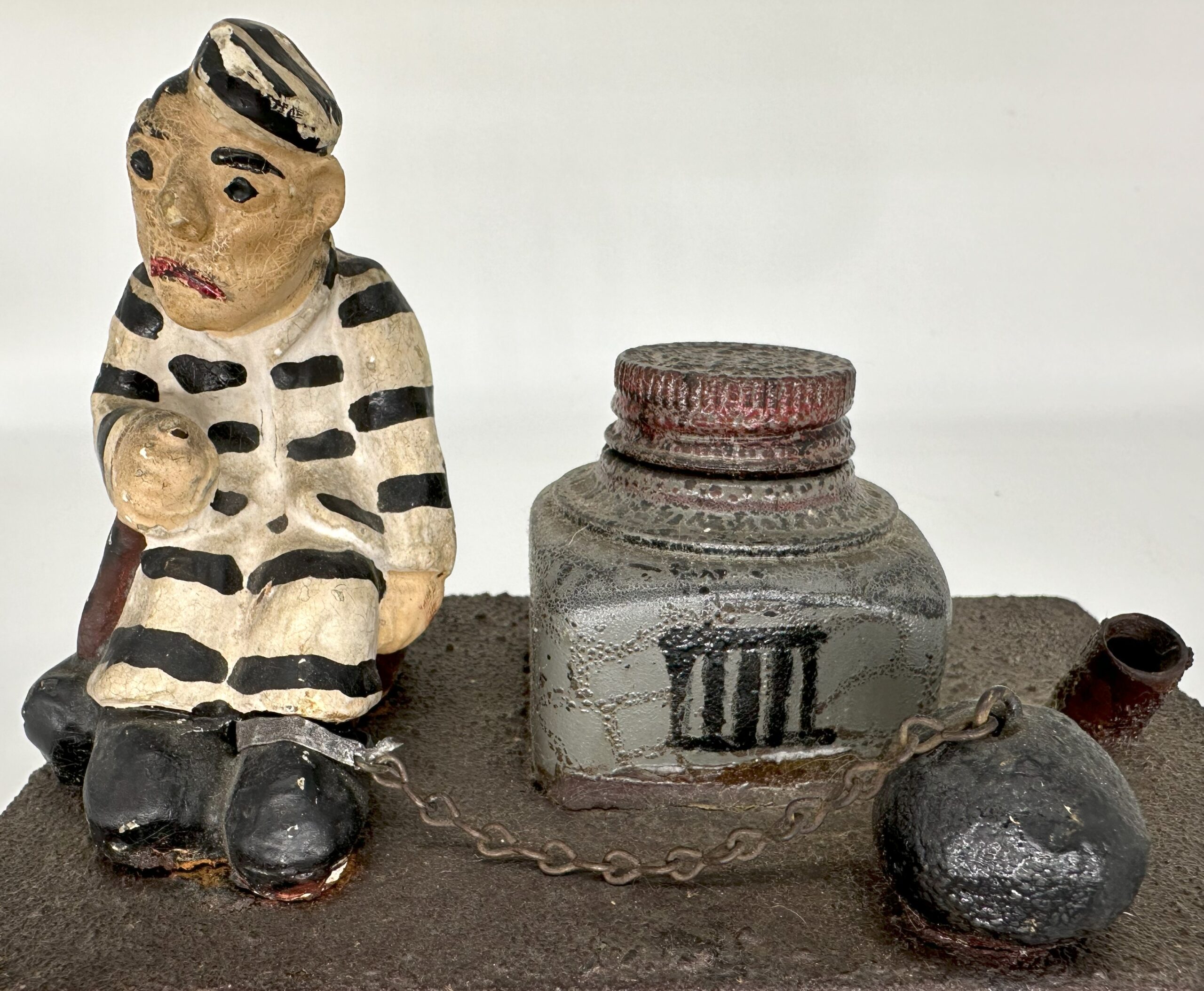A hand-carved wooden prisoner, in traditional prison garb of black and white horizontal stripes, wears a ball & chain. He sits on a rock, sledgehammer in hand, next to an ink bottle – even the bottle has prison bars painted on it. There’s a pen holder at the other end. In the front is a handwritten plaque which asks, “Why Did I Do It?” A nice piece of folk art – one-of-a-kind.