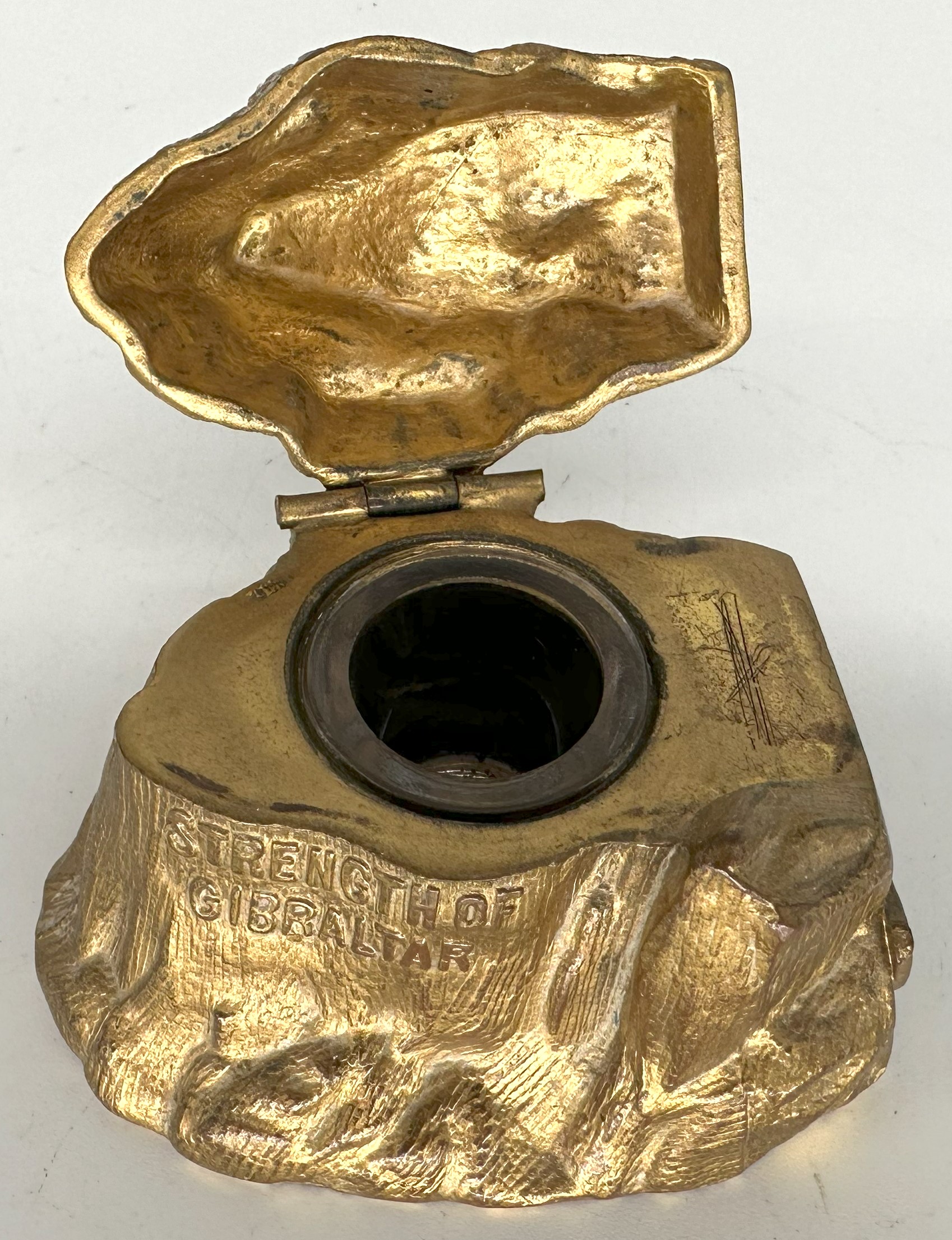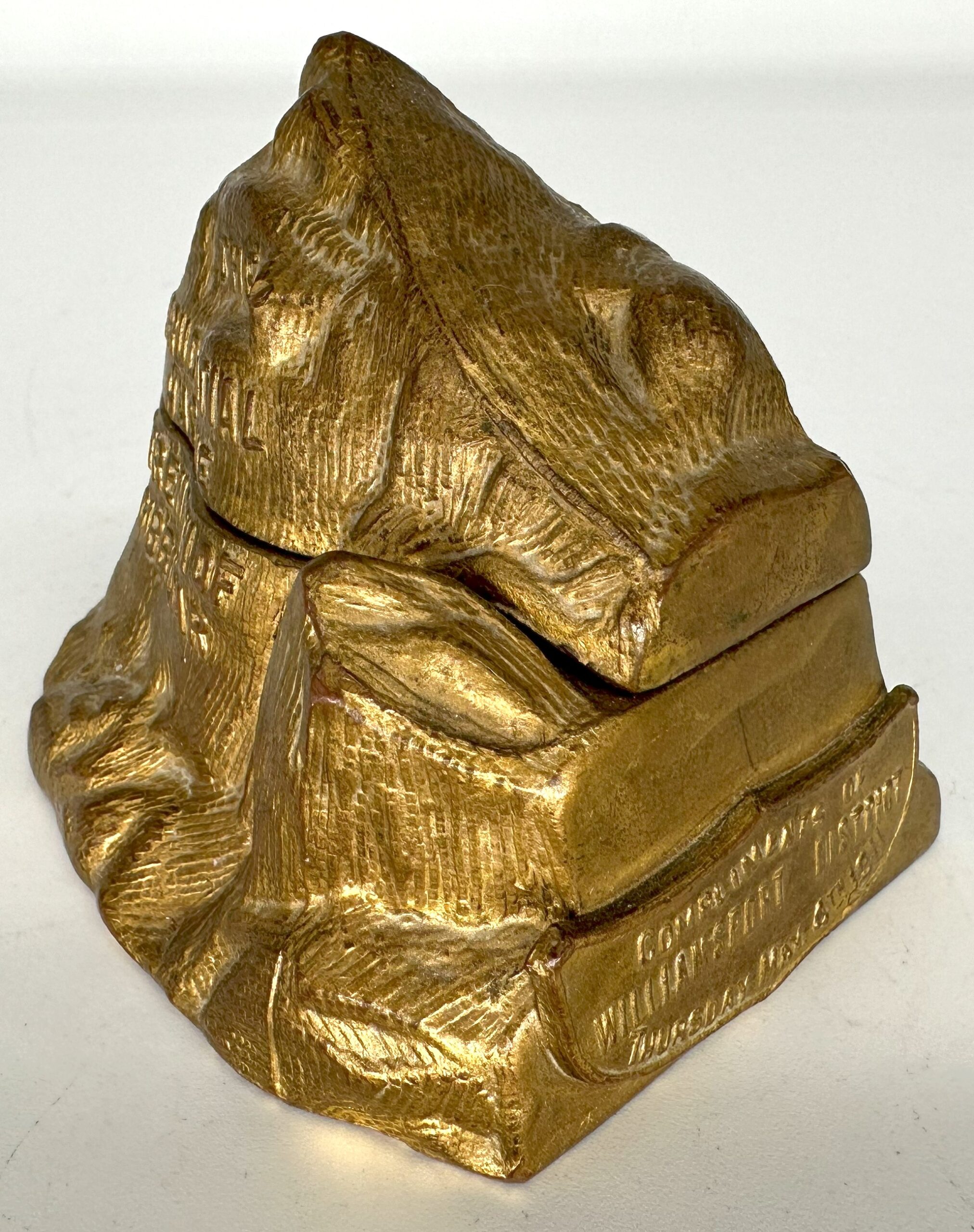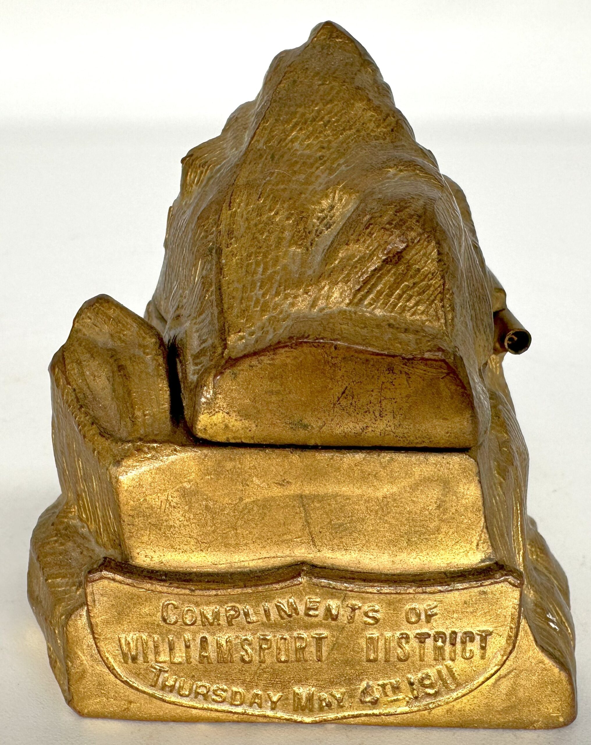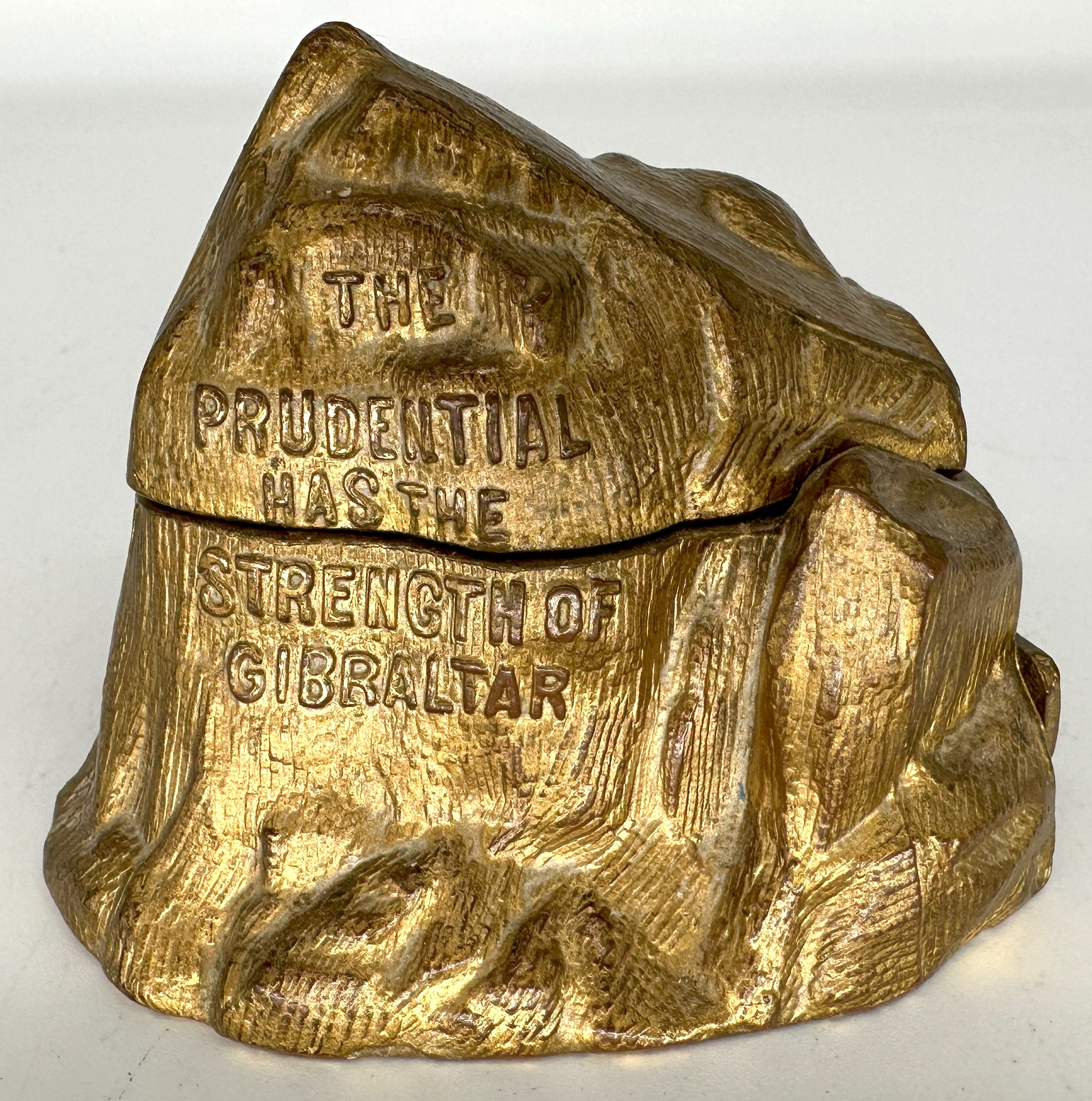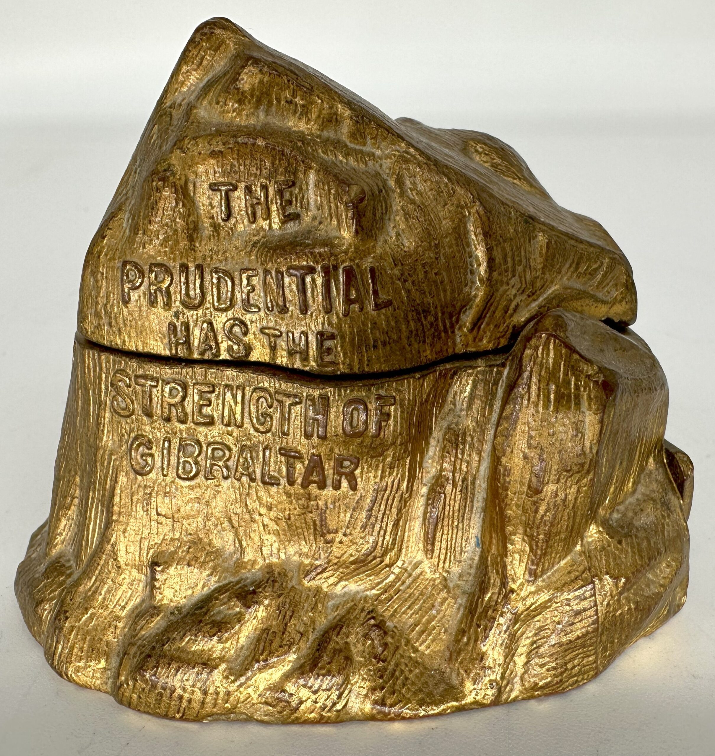 Long a symbol of strength for Prudential Insurance, this inkwell is in the form of the Rock of Gibraltar. On its front is embossed: “The Prudential Has the Strength of Gibraltar.” Impressed on the side: “Compliments of Williamsport District, Thursday May 4th, 1911”.