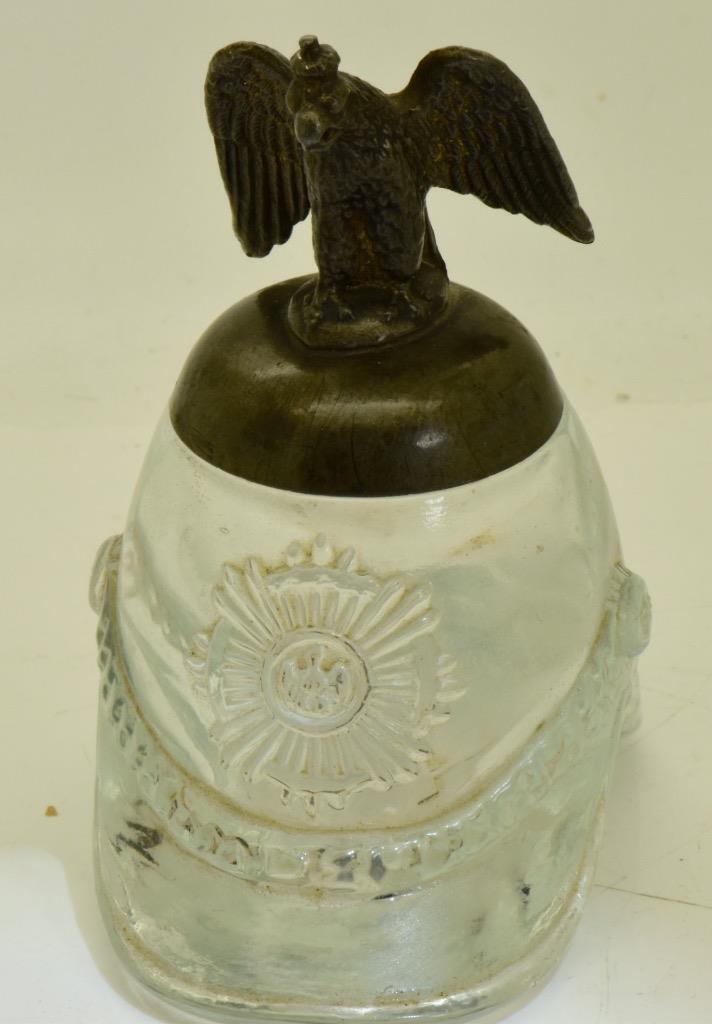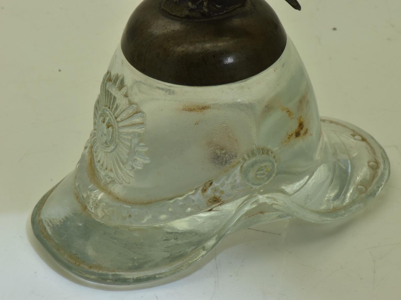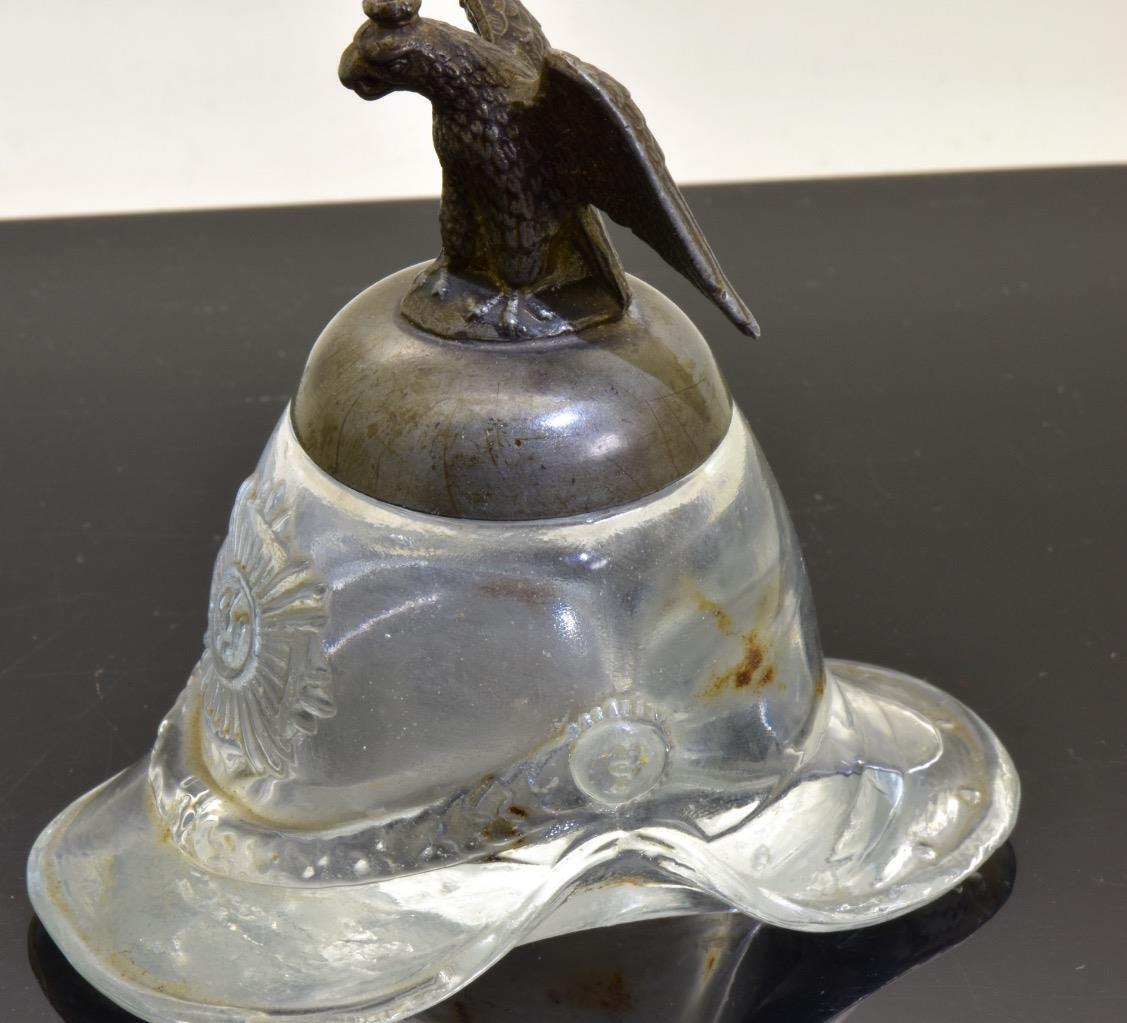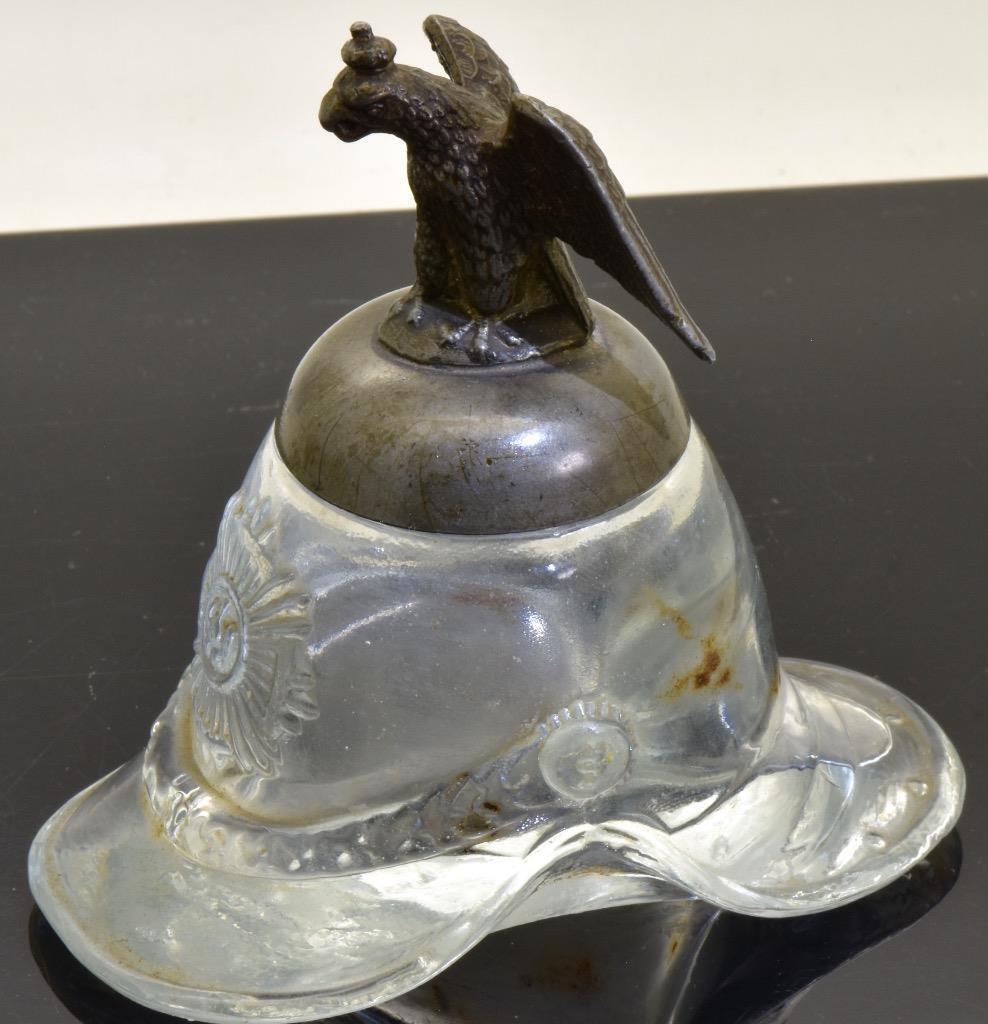 An inkwell modeled after the Prussian Garde du Corps / Garde Cuirassier 1867 helmet. The inkwell itself is molded glass and the eagle lid is made of metal. The Garde du Corps served as personal bodyguard of the king of Prussia and, after 1871, of the German Emperor. The unit was founded in 1740 by Frederick the Great. This piece dates from around 1890 to 1910.