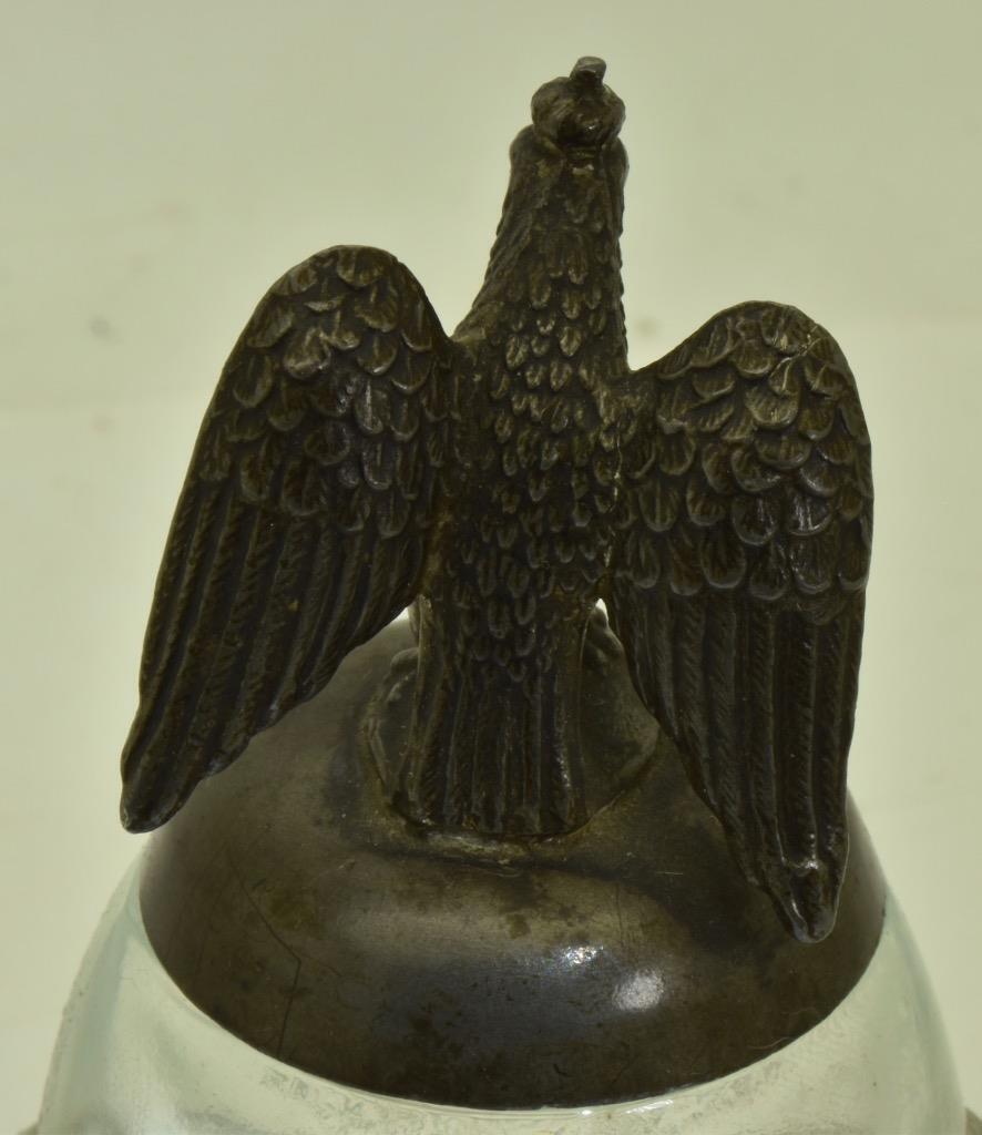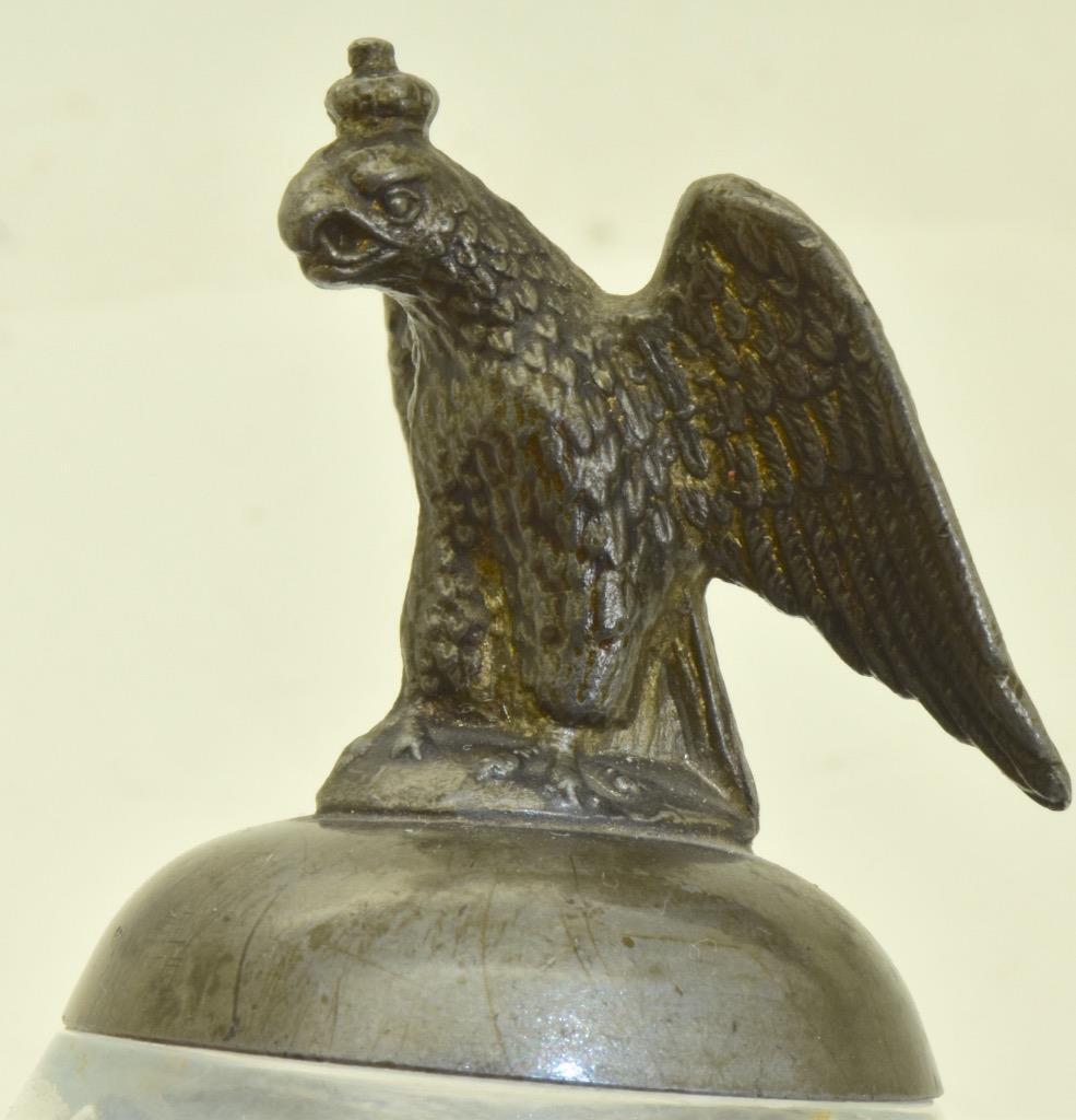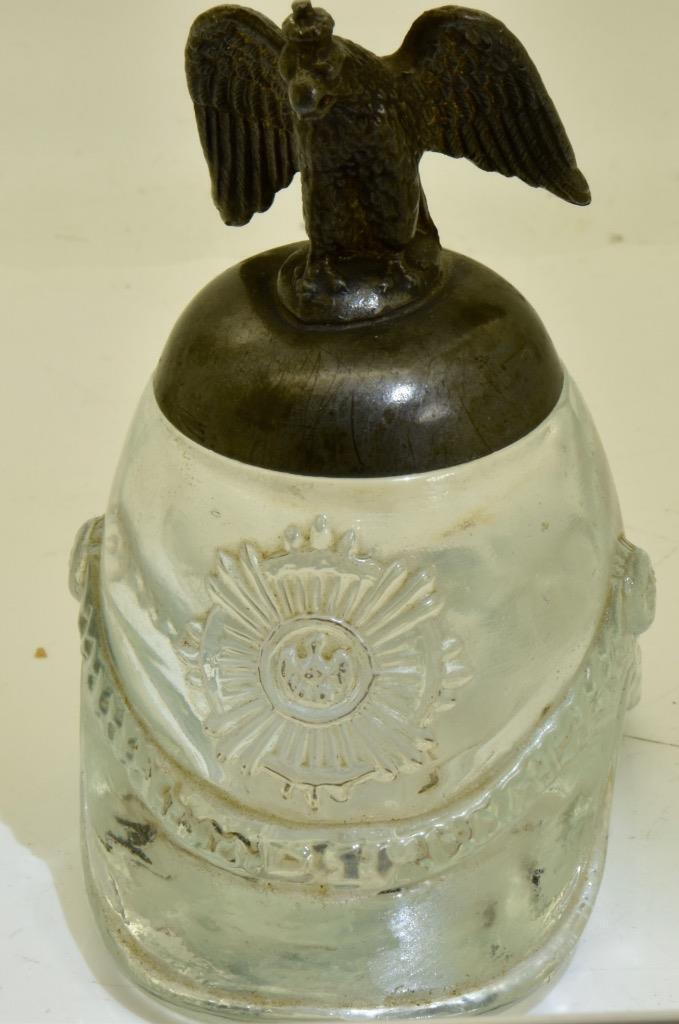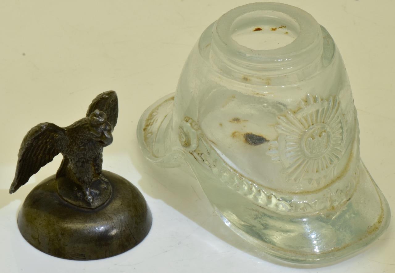 An inkwell modeled after the Prussian Garde du Corps / Garde Cuirassier 1867 helmet. The inkwell itself is molded glass and the eagle lid is made of metal. The Garde du Corps served as personal bodyguard of the king of Prussia and, after 1871, of the German Emperor. The unit was founded in 1740 by Frederick the Great. This piece dates from around 1890 to 1910.