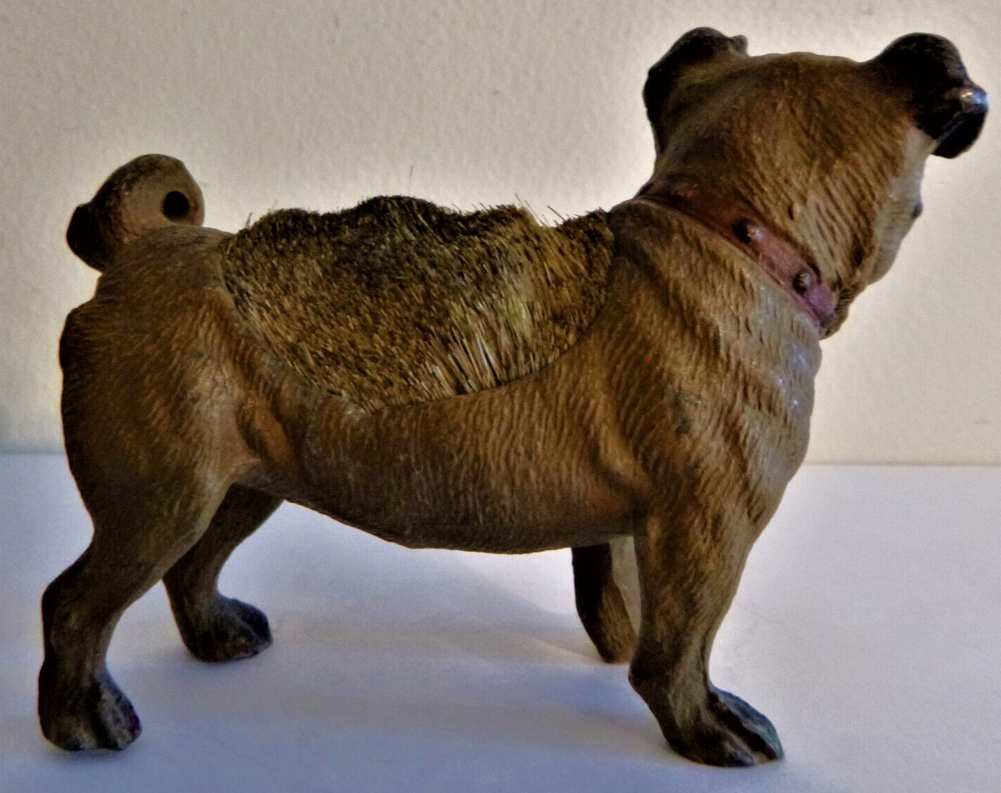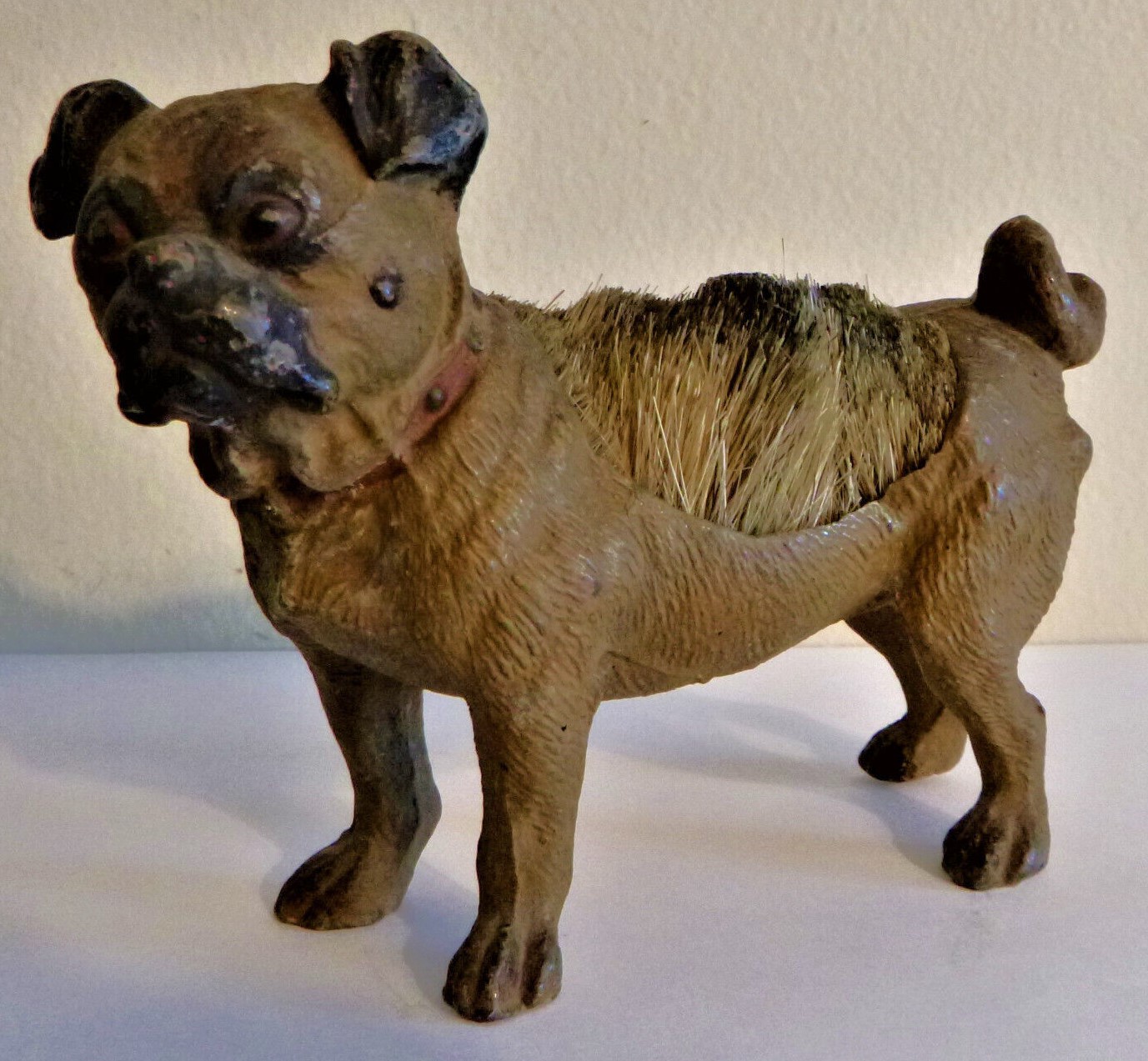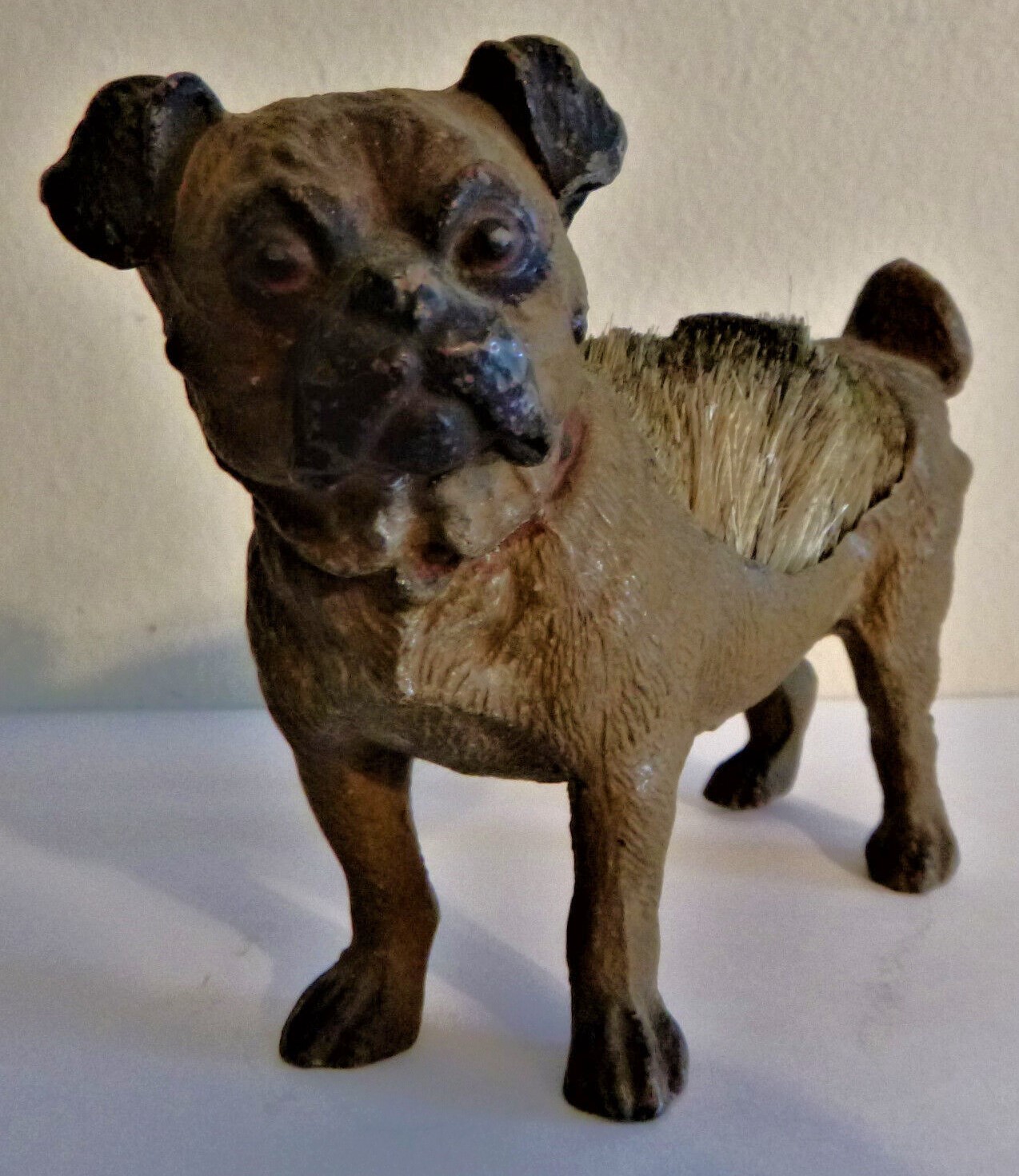 Cold-painted metal pen wipe in the form of a pug dog. Two examples shown. The second is marked “Geschutzt”.