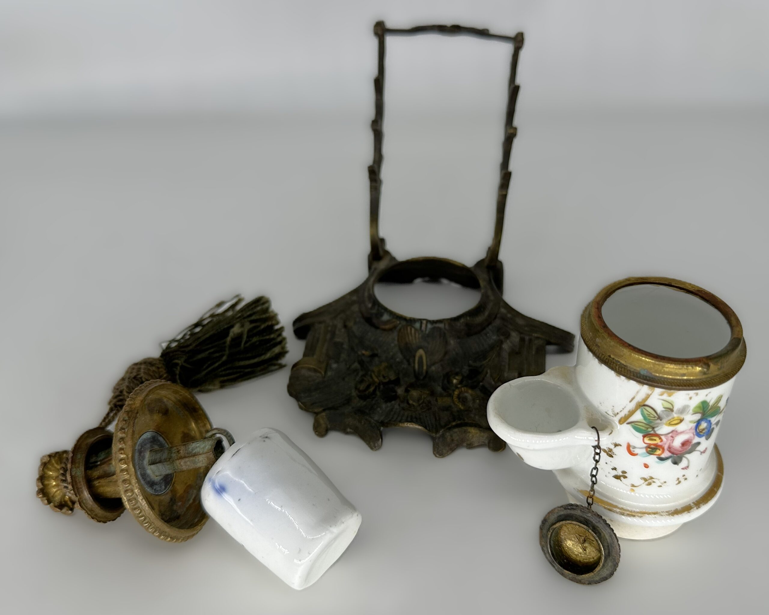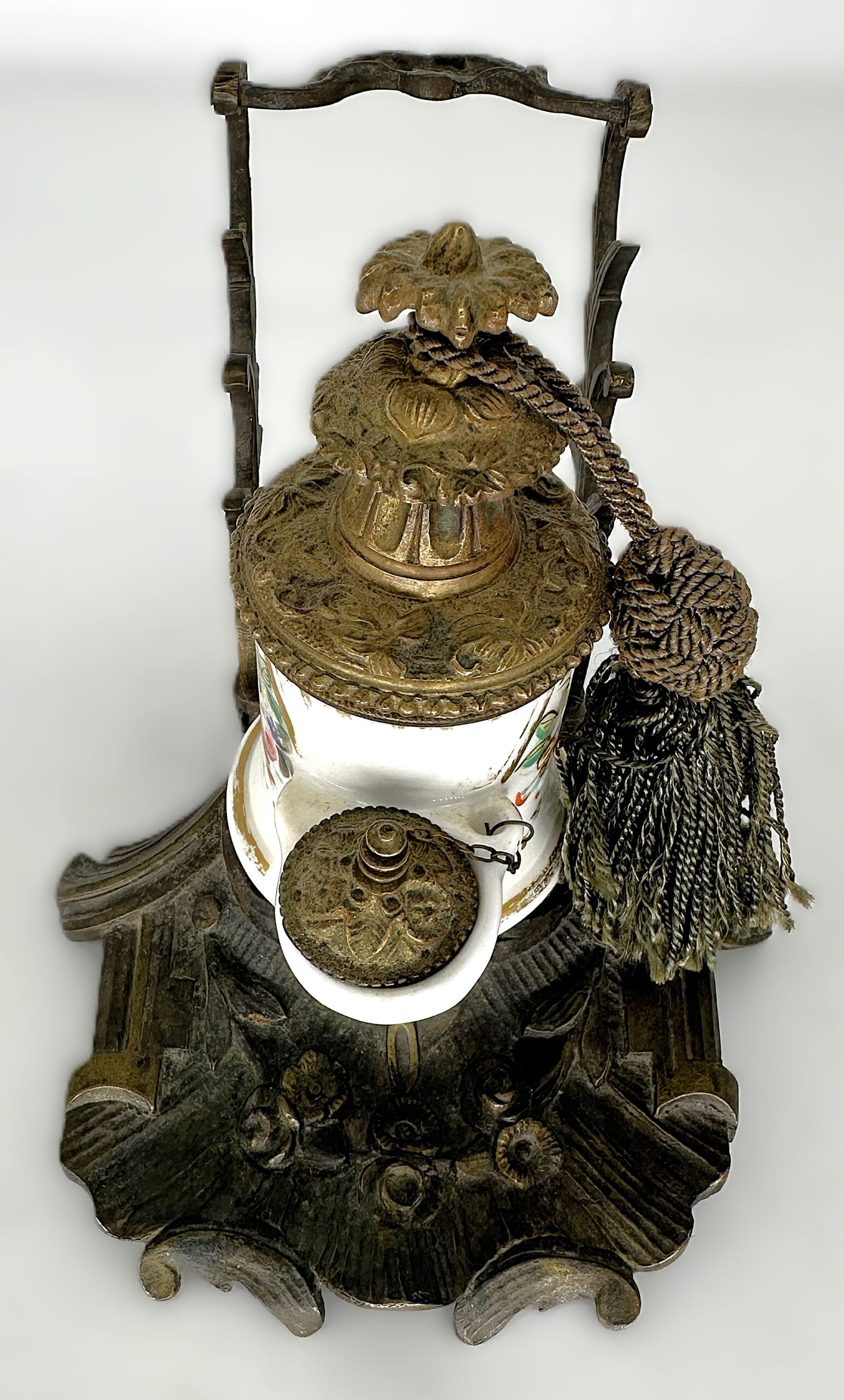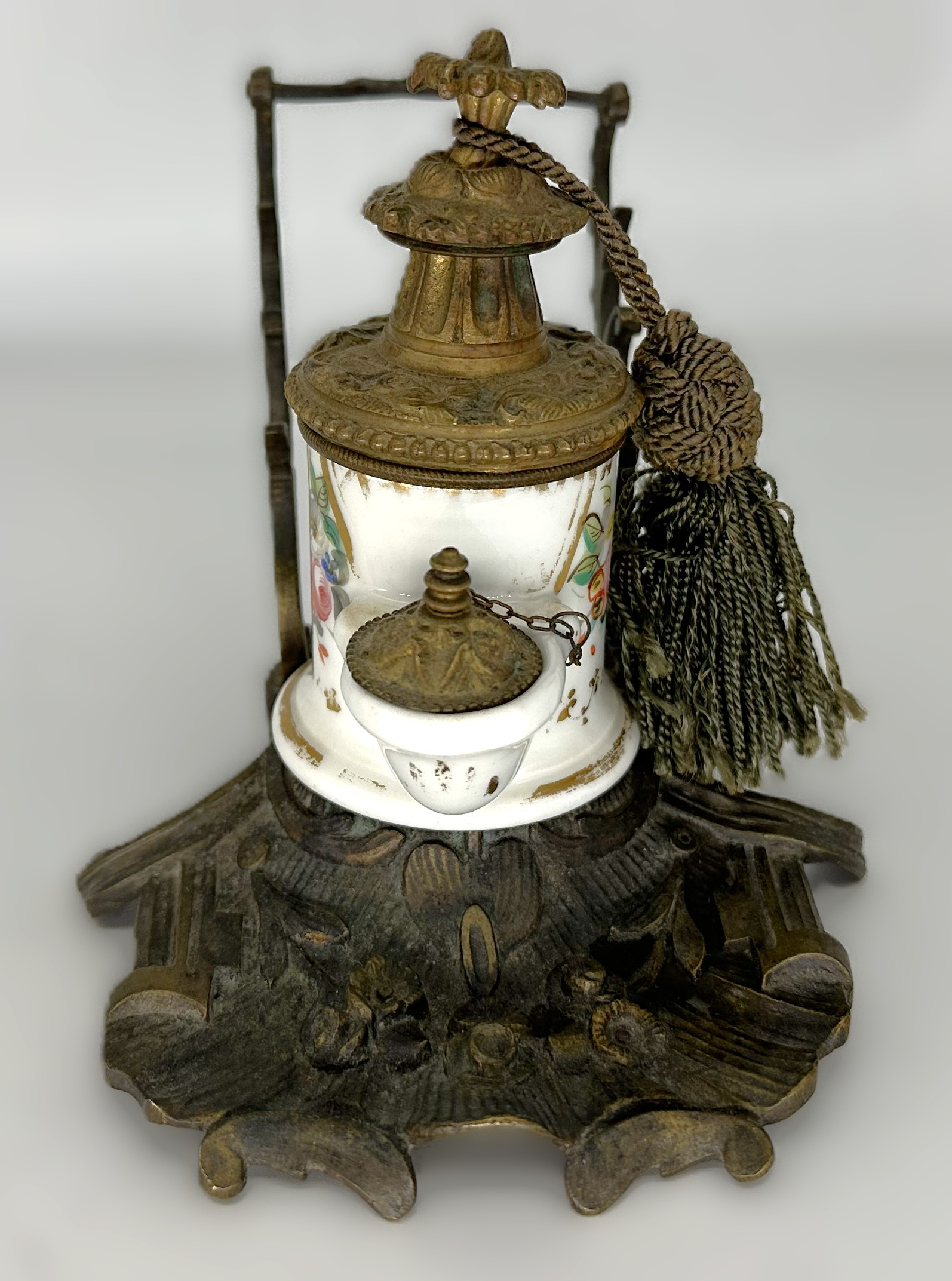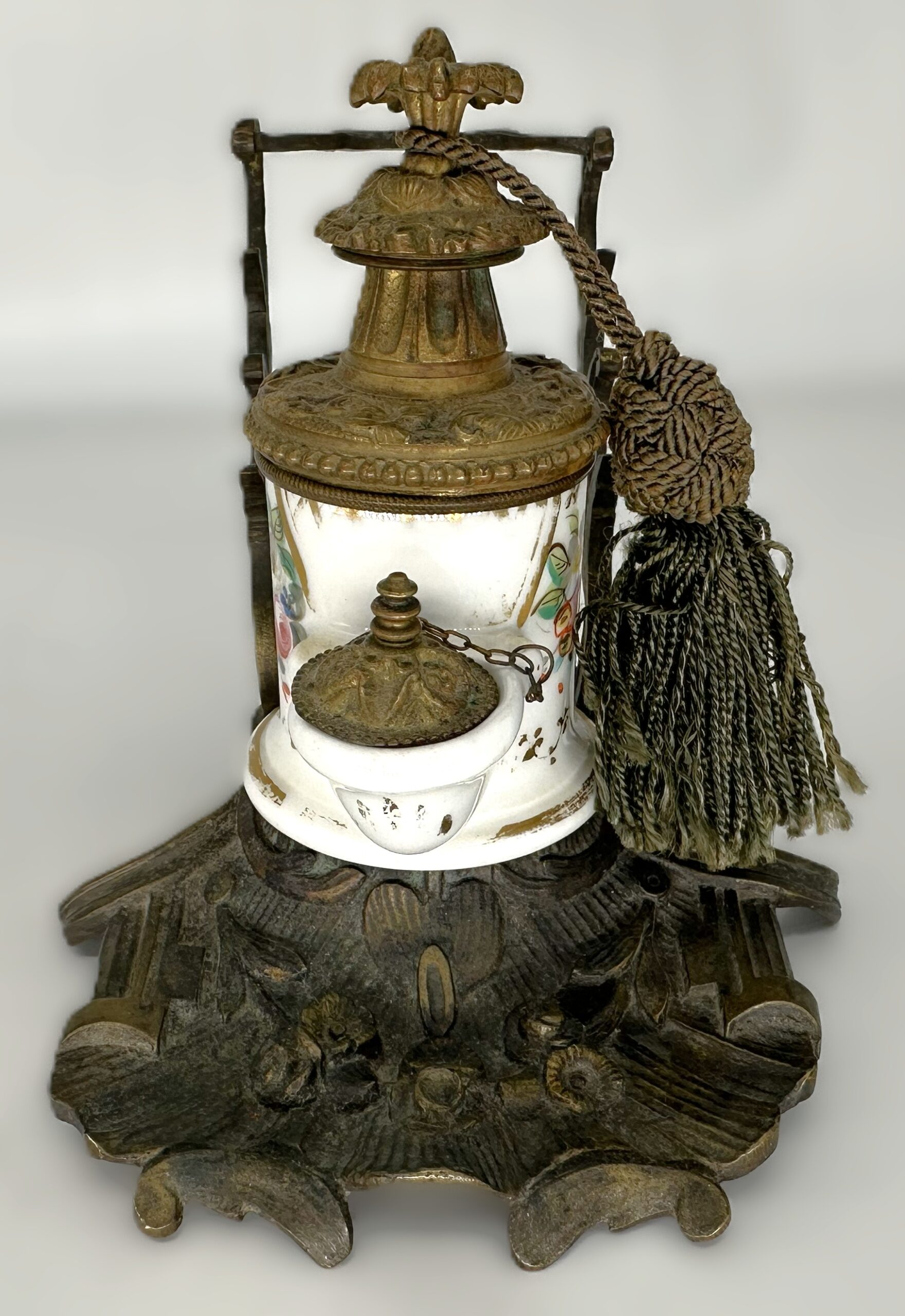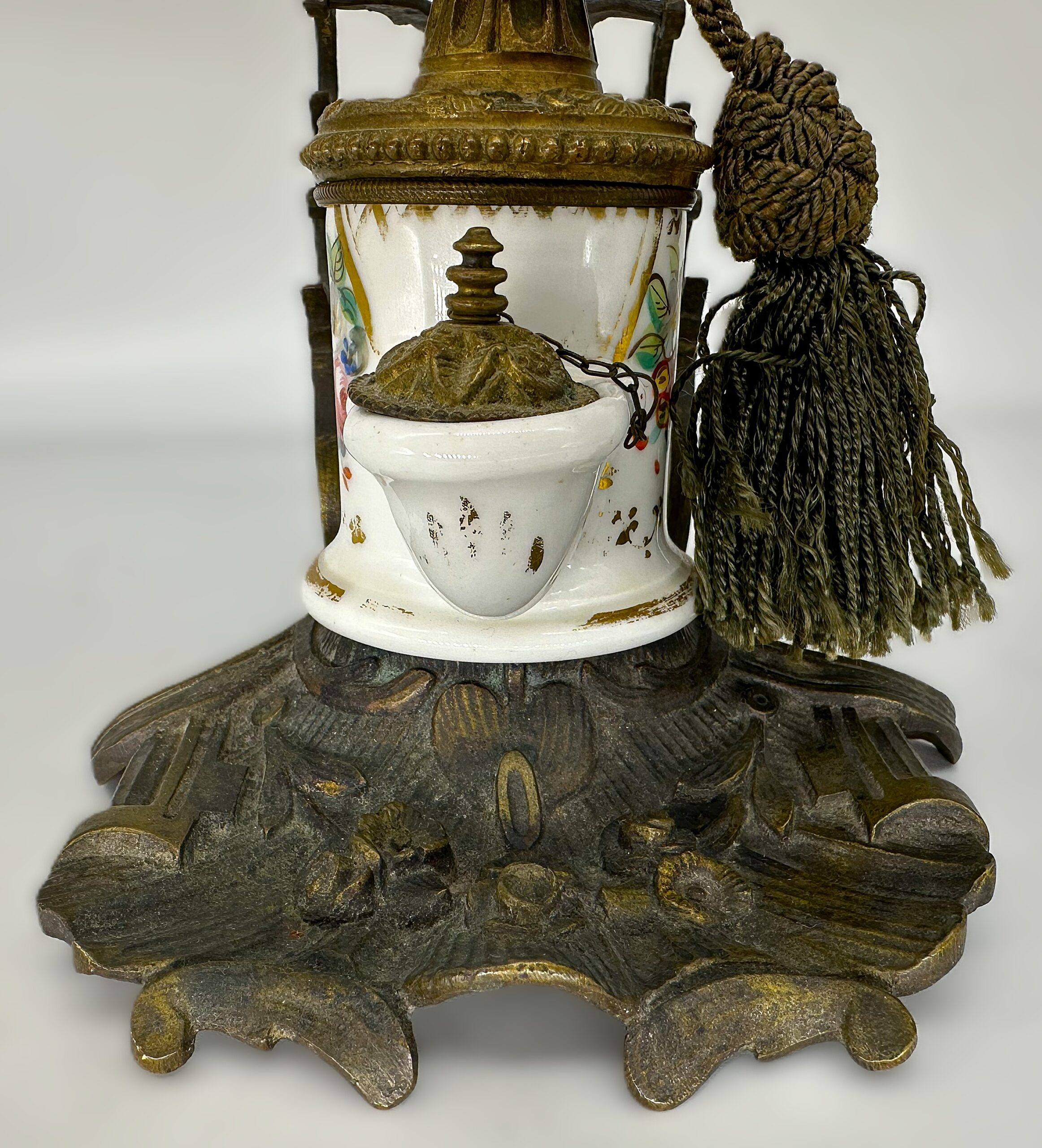 - The Tassel: While common on luxury “Palais Royal” desk sets to add a touch of opulence, the green silk tassel may be a later addition or a replacement.