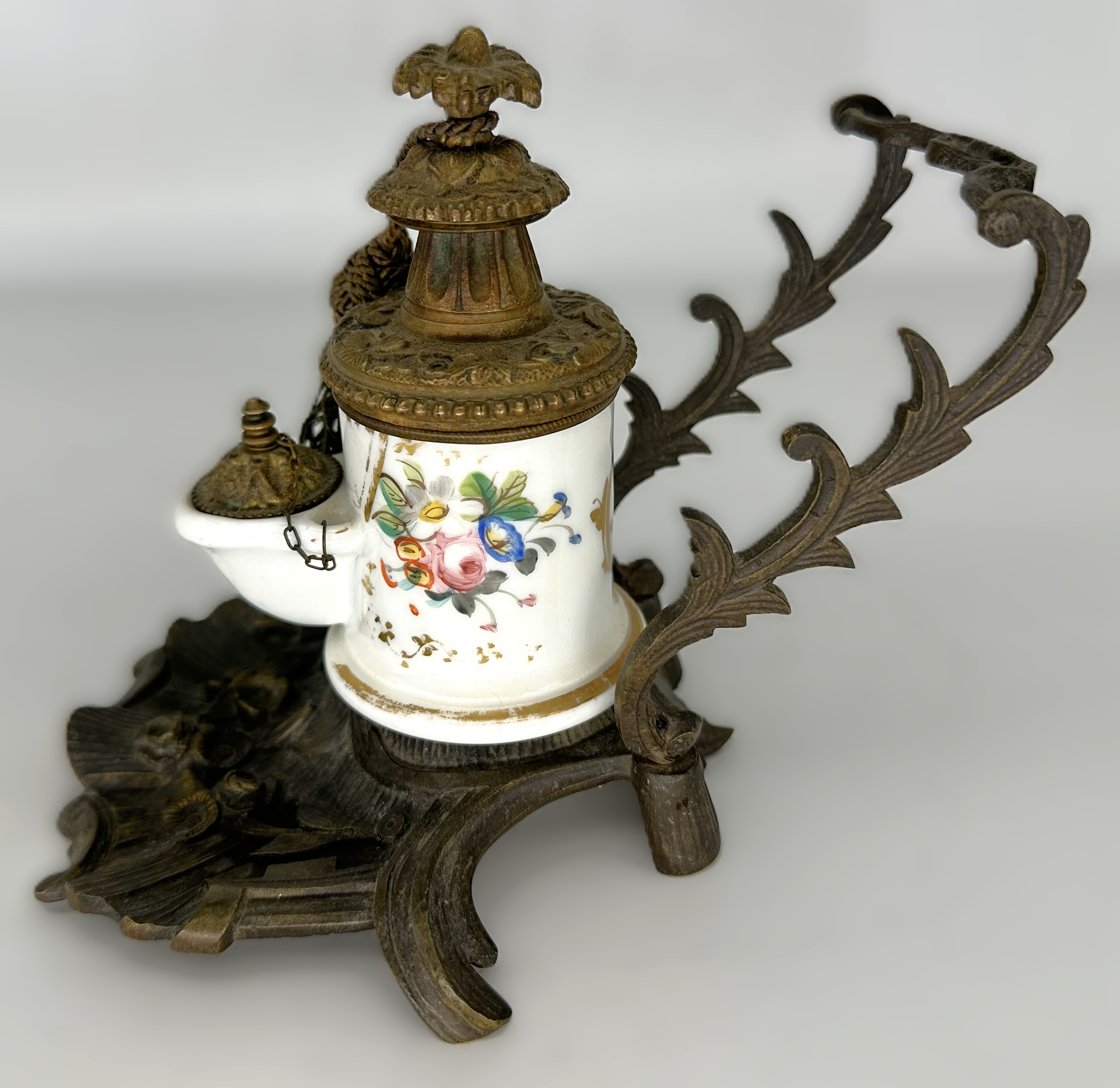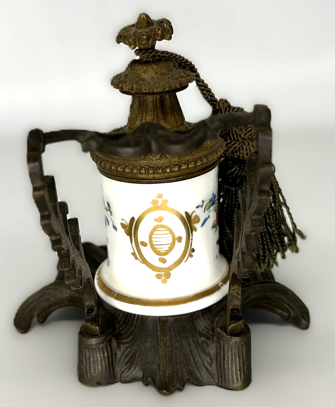 - Porcelain Reservoir: The central cylinder is made of white porcelain, featuring a hand-painted floral spray of roses and forget-me-nots on the front. The back of the cylinder displays a gilded crest within a laurel wreath.