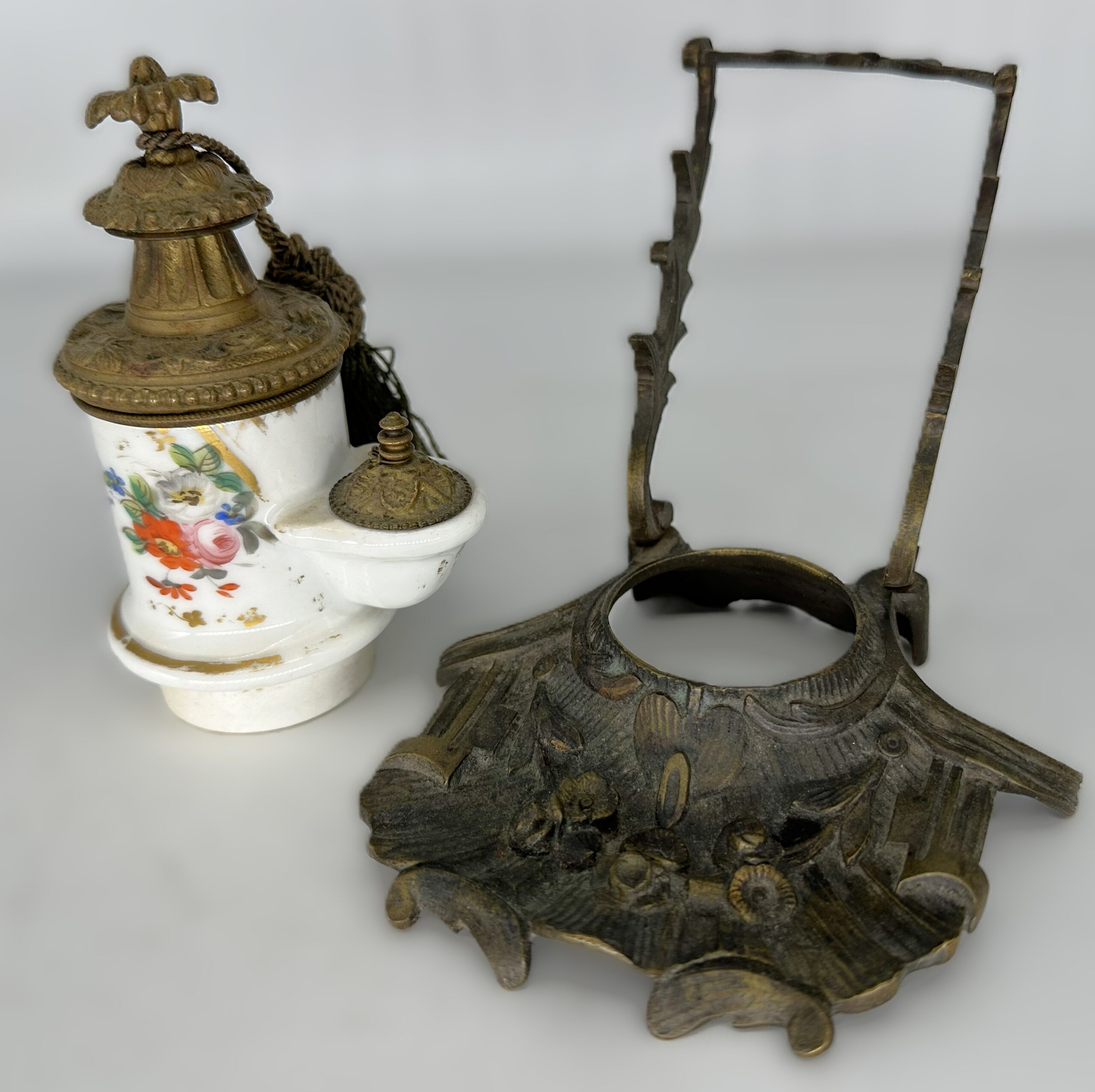 - Base and Rack: The inkwell sits in a bronze-finished metal base featuring Rococo-style scrolls and floral motifs. Rising from the base is a matching rack with four notches on each side to hold pens horizontally.