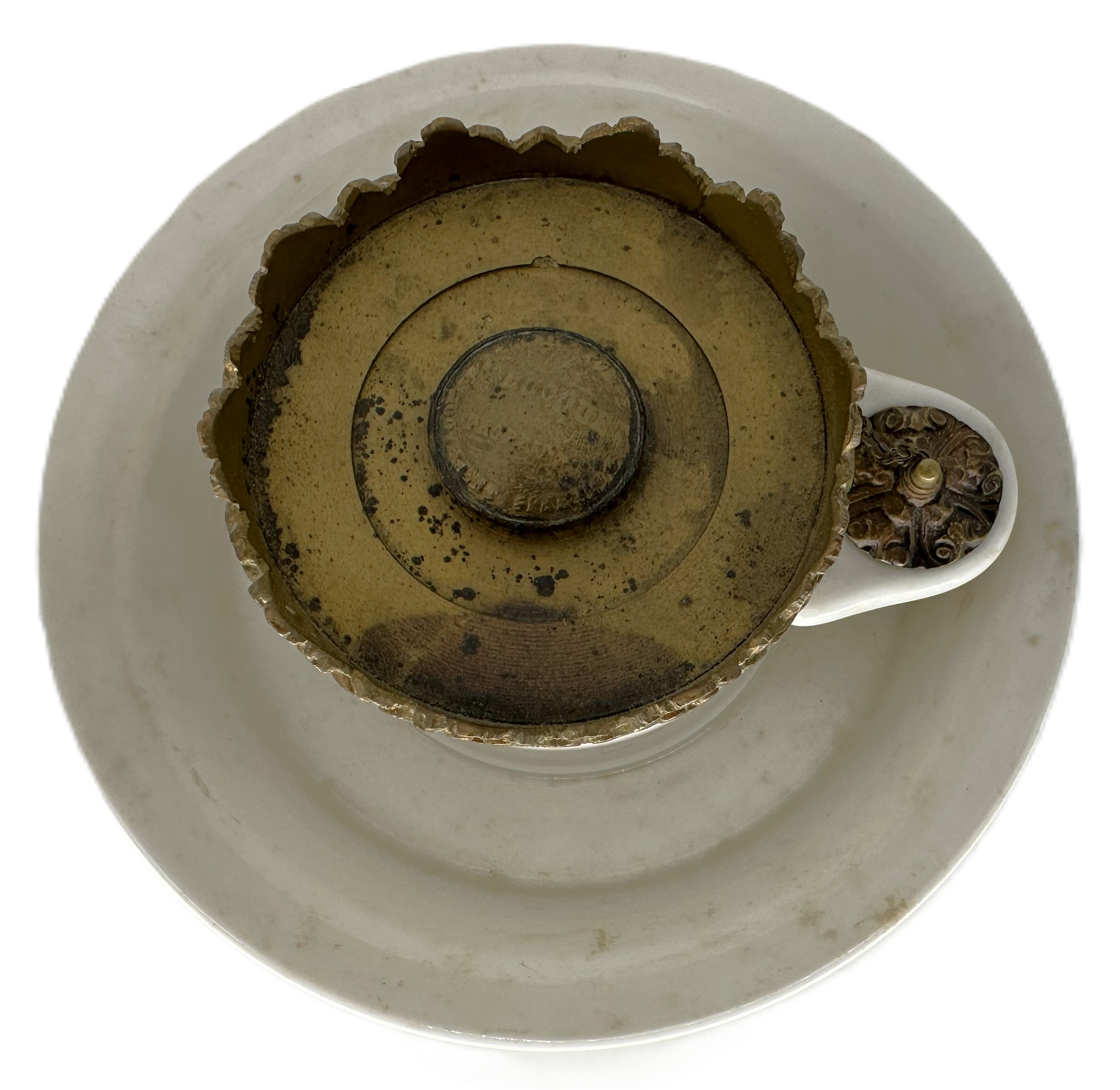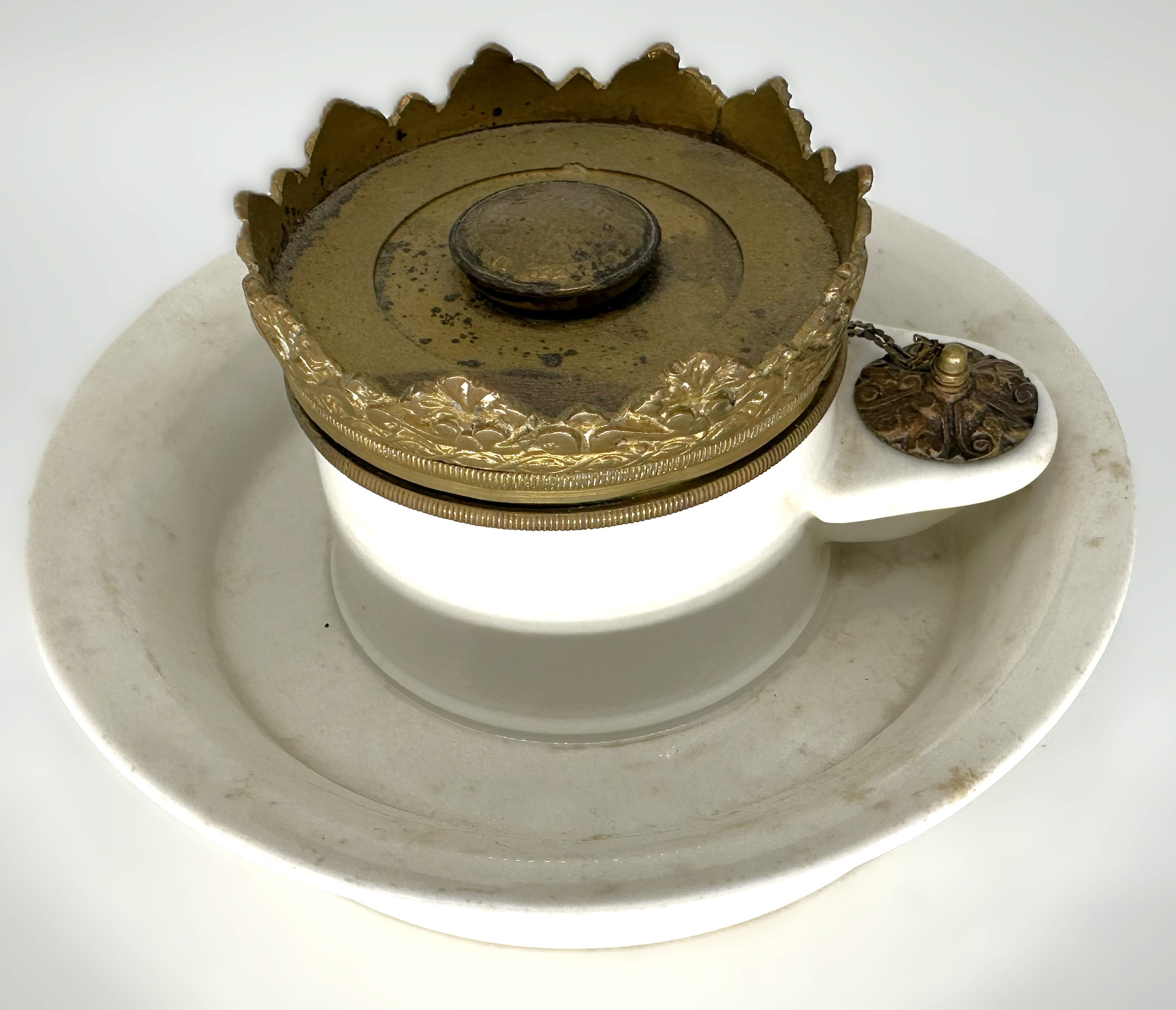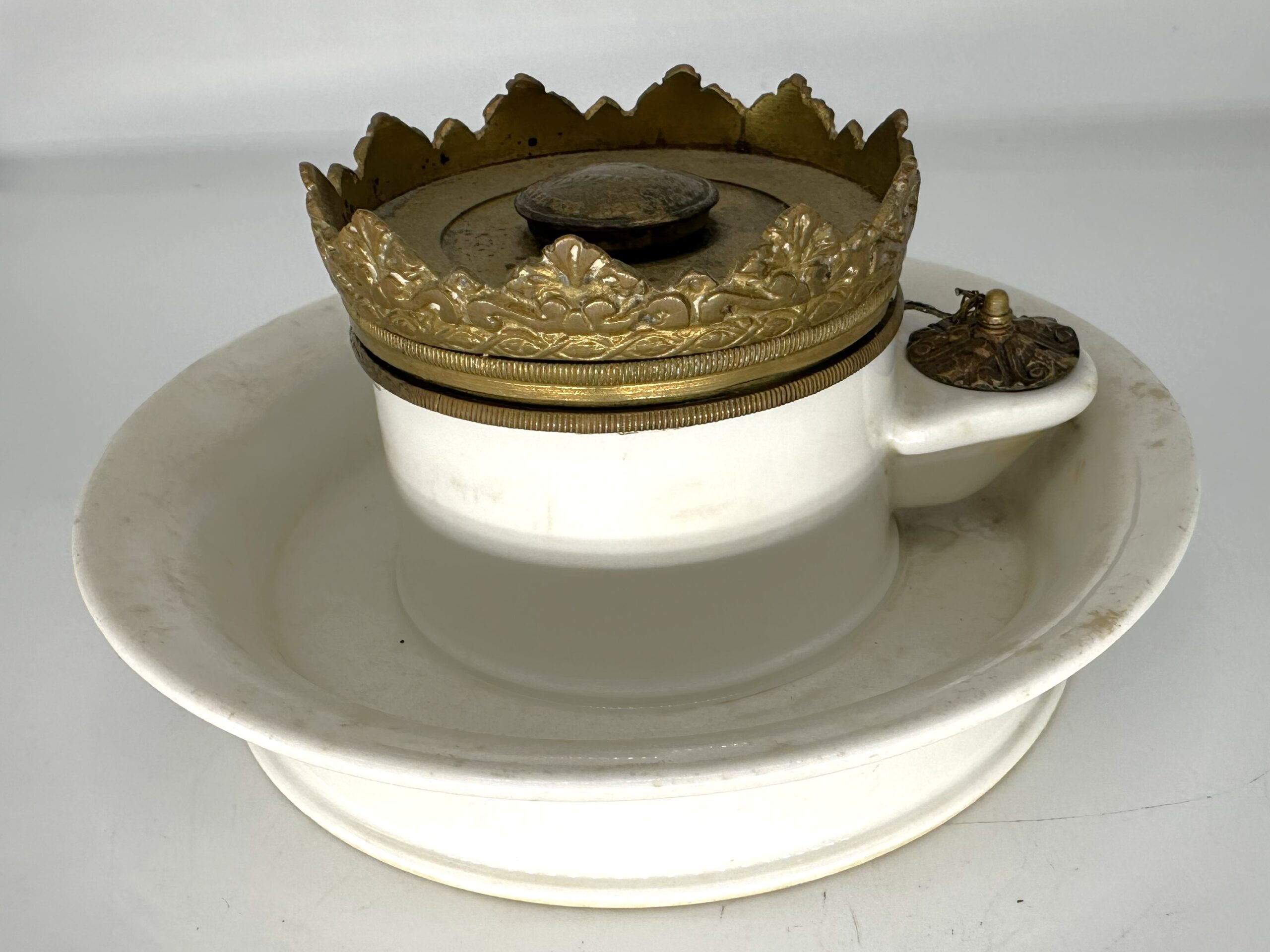 - The Crown Pen Rack: The brass fixture at the top is not just a lid; it is an elaborate, decorative pen rack cast in a crown or “crenelated” form. The raised, leaf-shaped points of the crown serve as cradles to hold multiple dip pens horizontally when they are not in use.