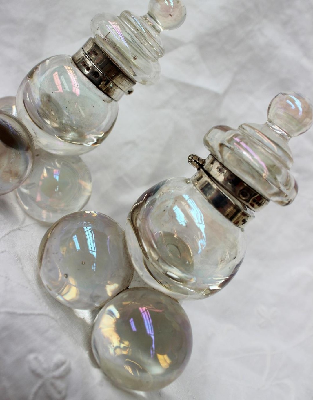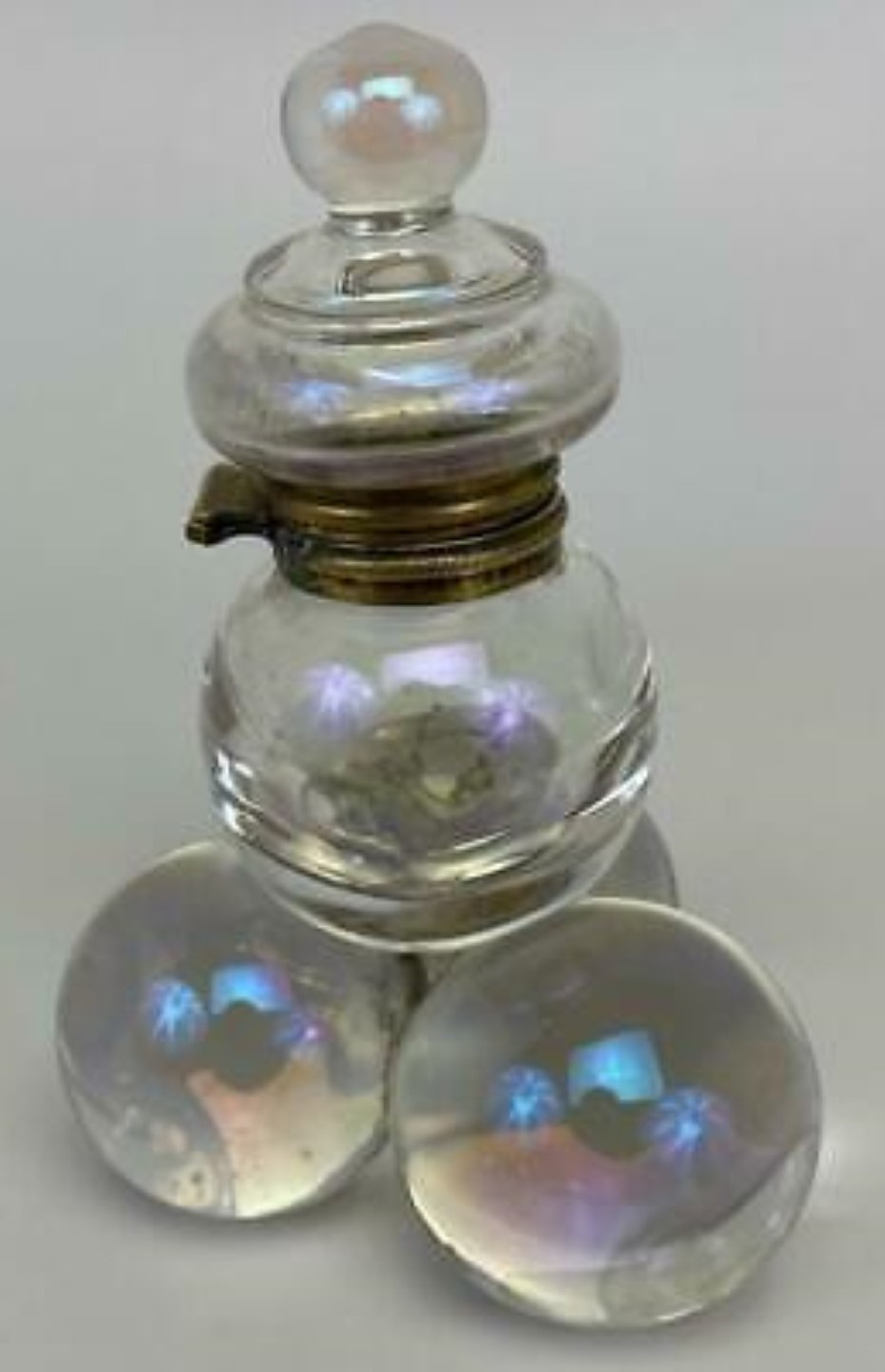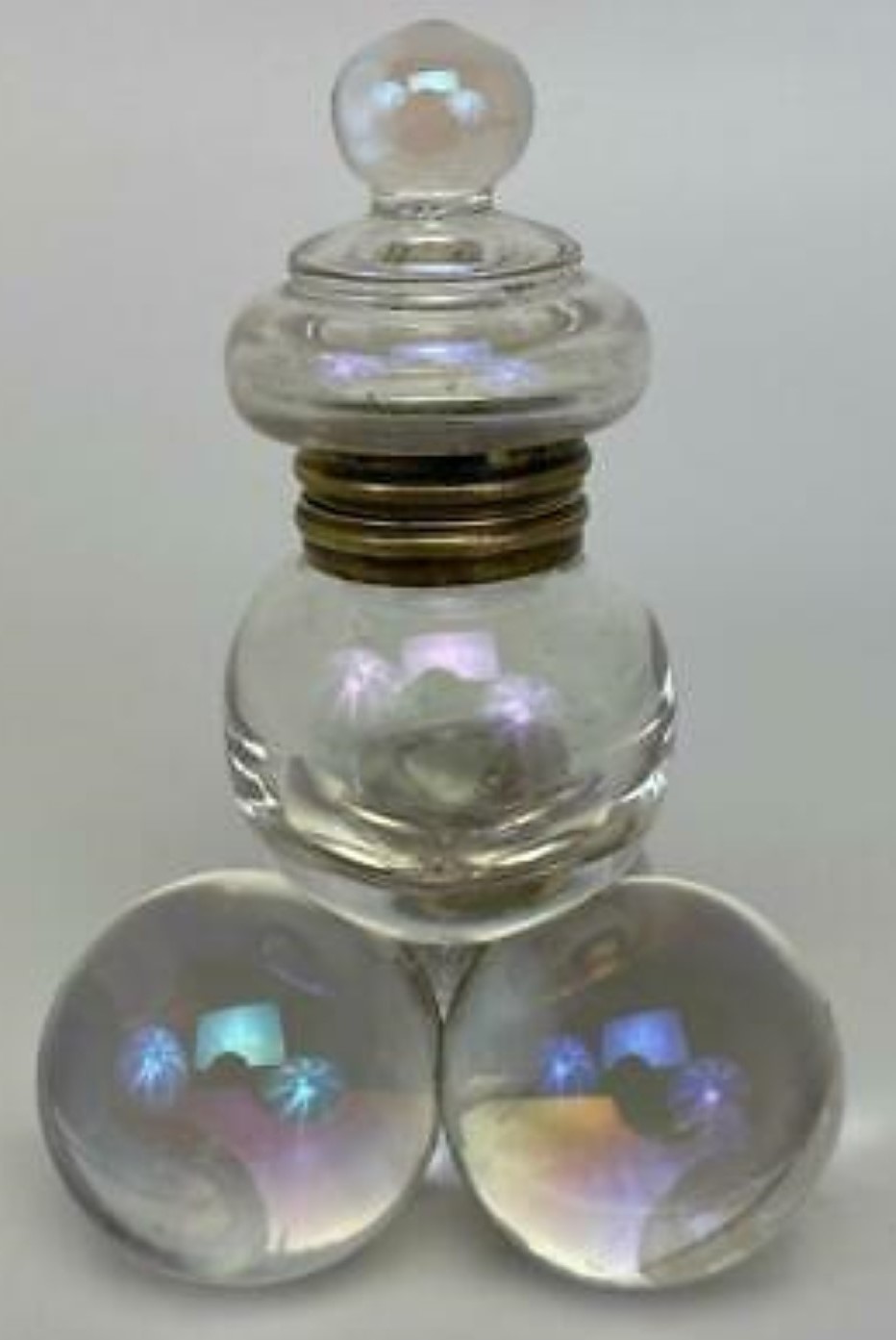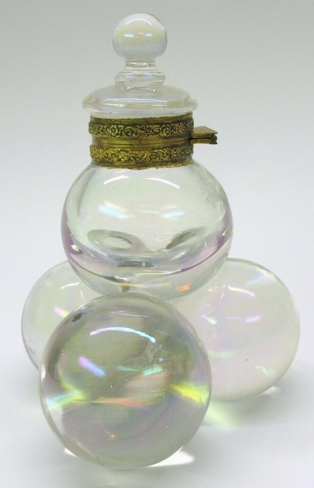 Polished pressed glass spheres with an iridescence making them look like soap bubbles are arranged as a pyramid. While most examples are made of clear glass, there are also examples with colored glass. The fittings for most are made of brass, but there are also examples with silver mountings. There is a range of sizes.
