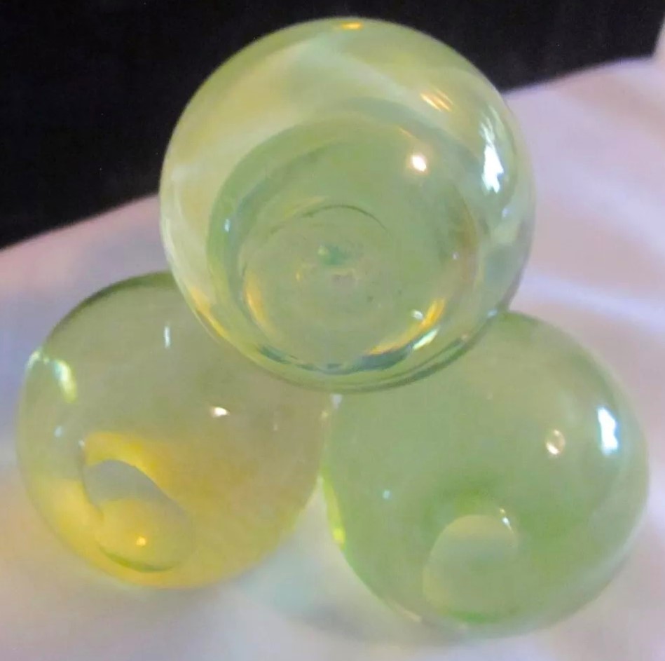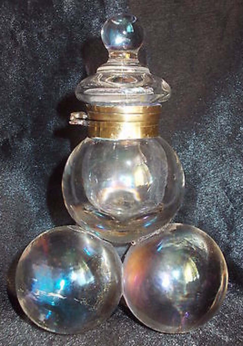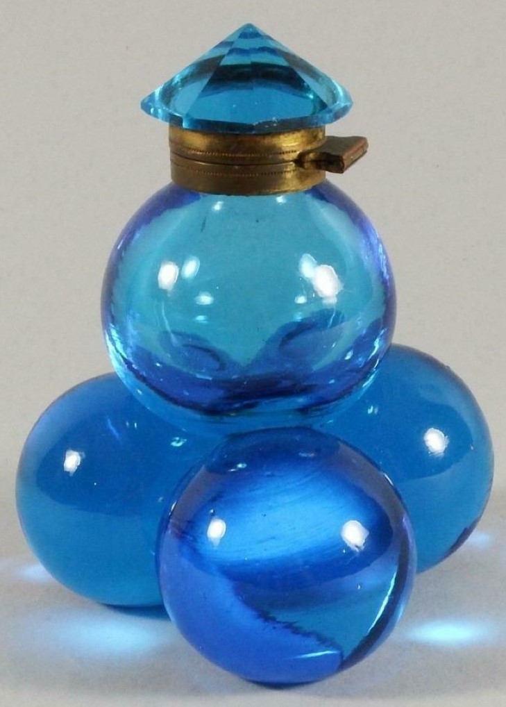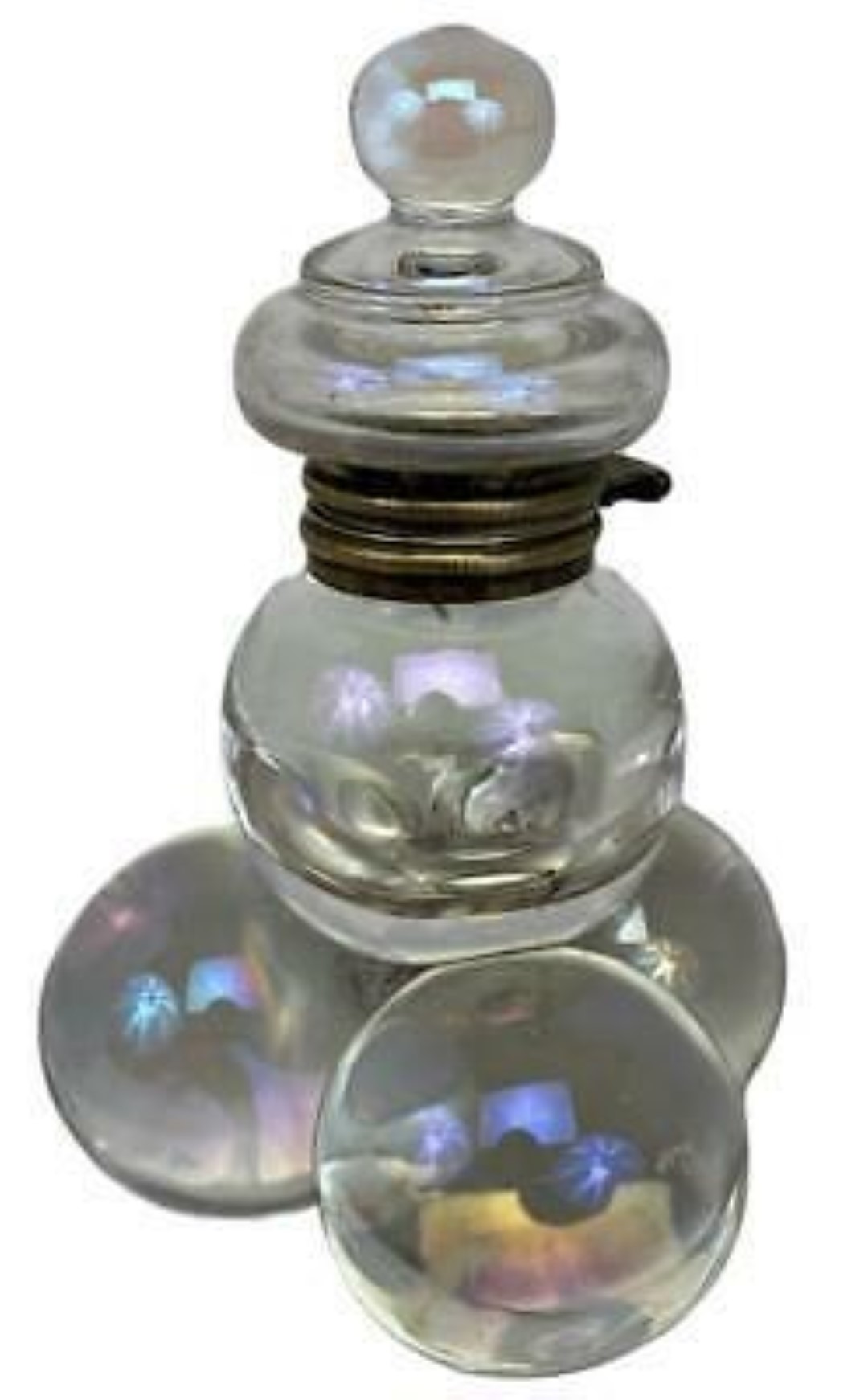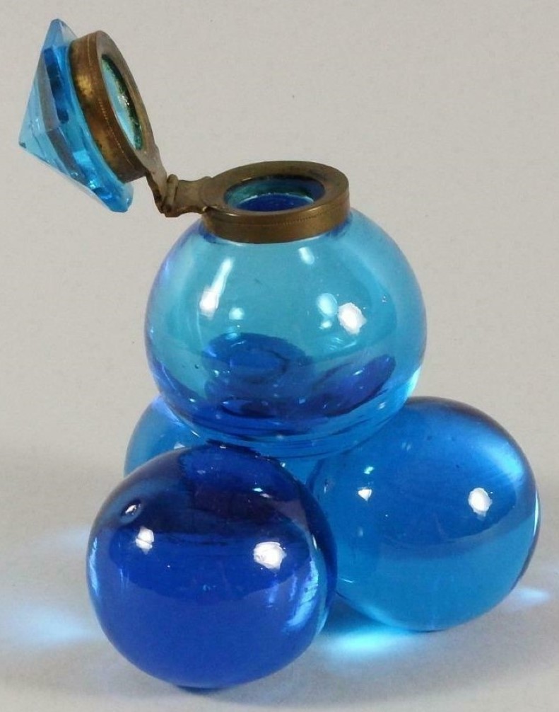 Polished pressed glass spheres with an iridescence making them look like soap bubbles are arranged as a pyramid. While most examples are made of clear glass, there are also examples with colored glass. The fittings for most are made of brass, but there are also examples with silver mountings. There is a range of sizes.