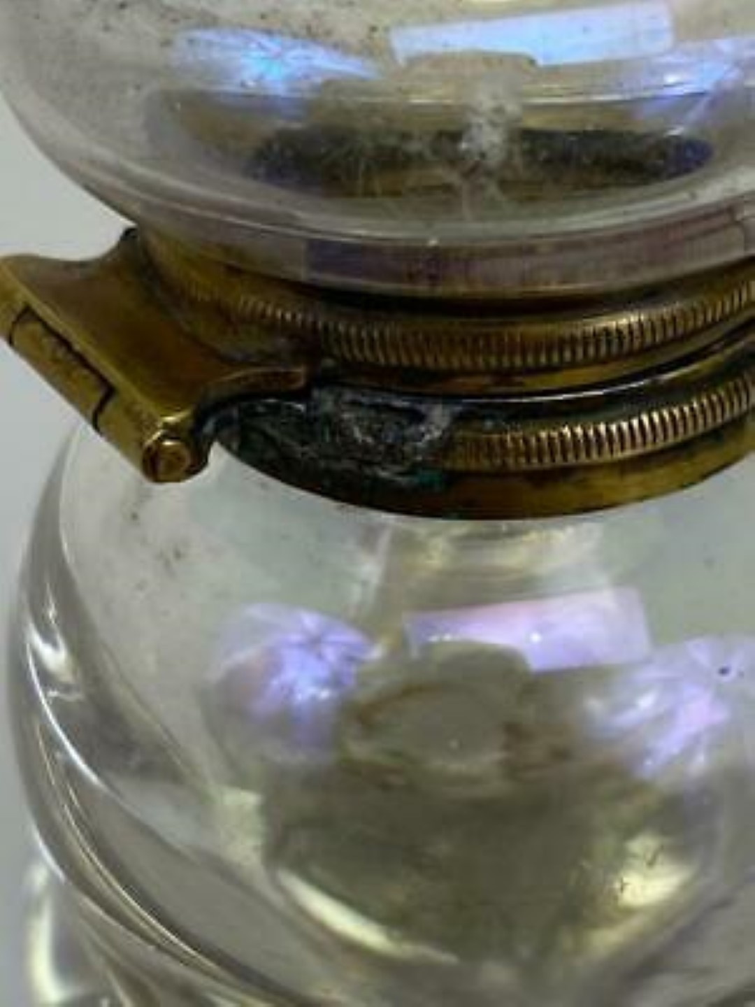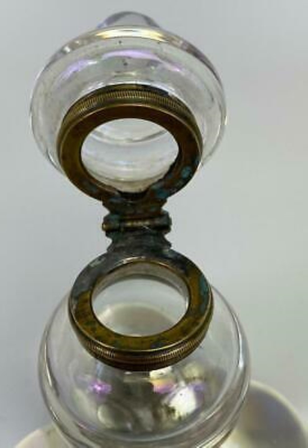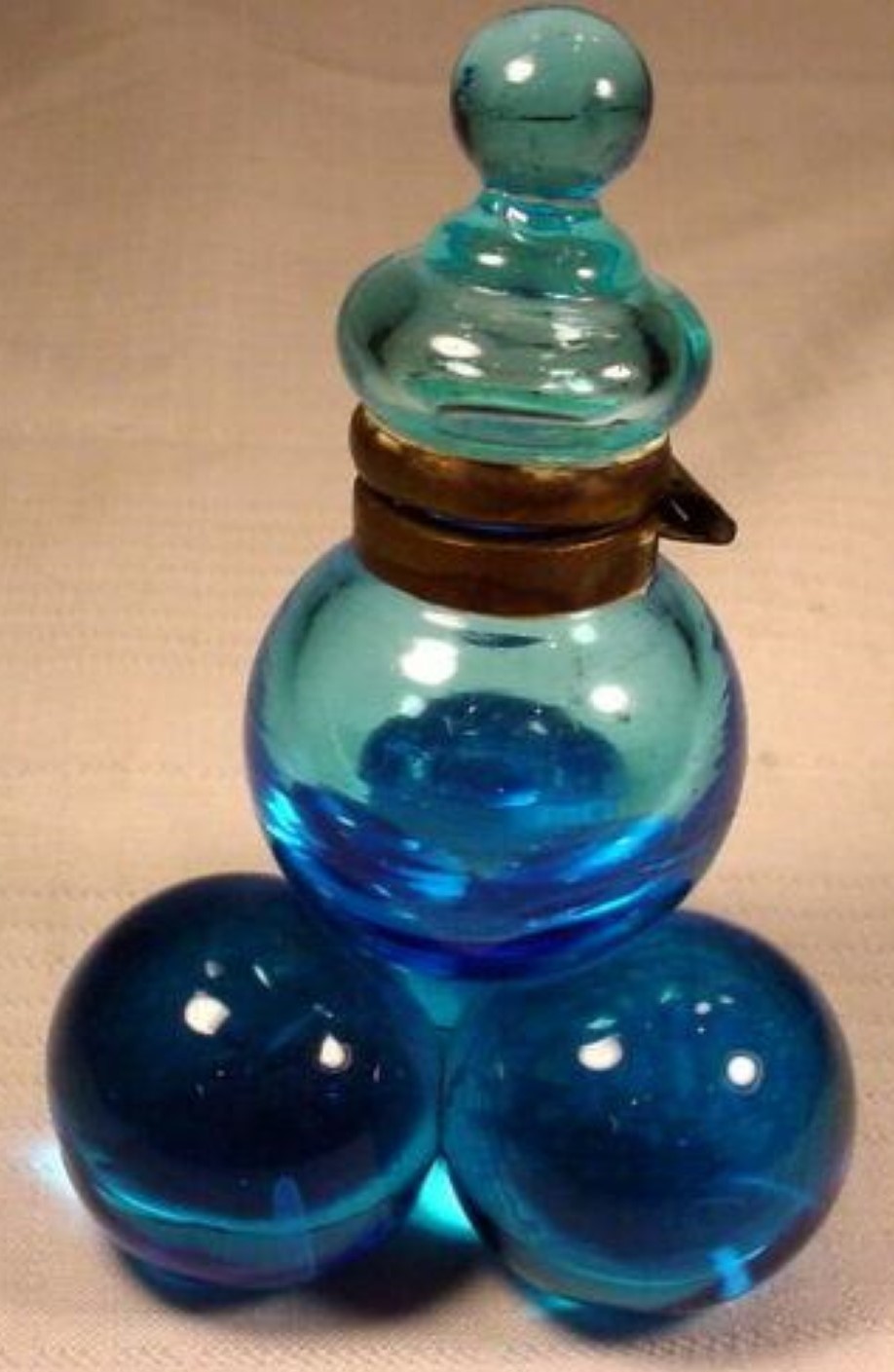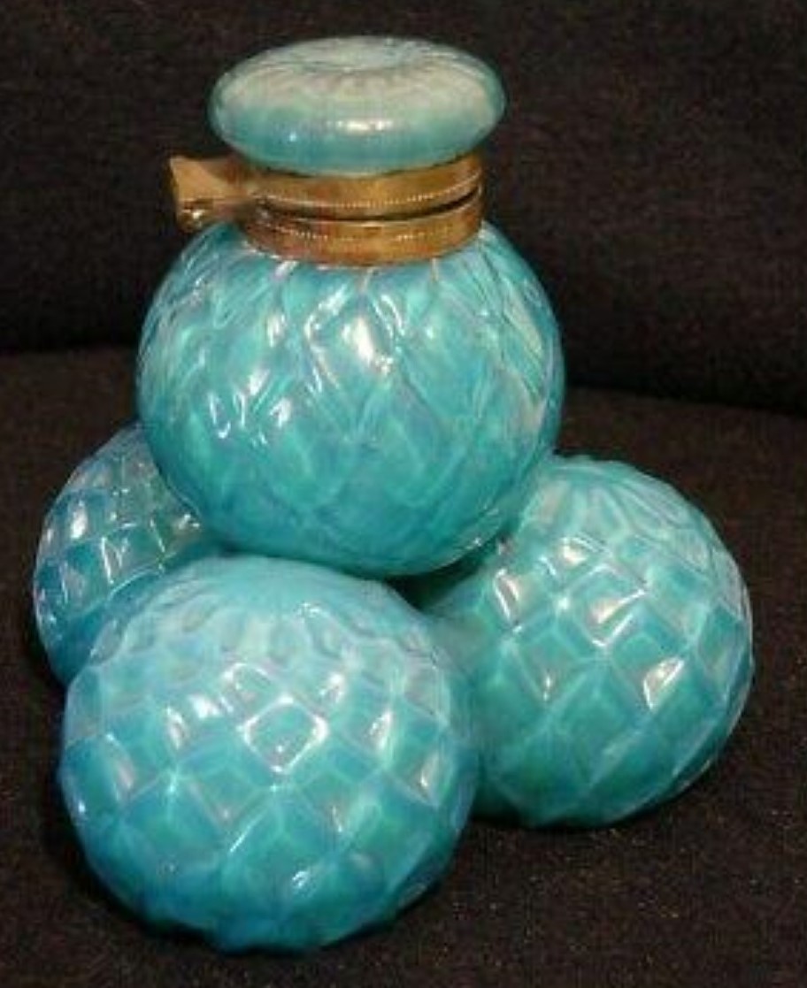 Polished pressed glass spheres with an iridescence making them look like soap bubbles are arranged as a pyramid. While most examples are made of clear glass, there are also examples with colored glass. The fittings for most are made of brass, but there are also examples with silver mountings. There is a range of sizes.