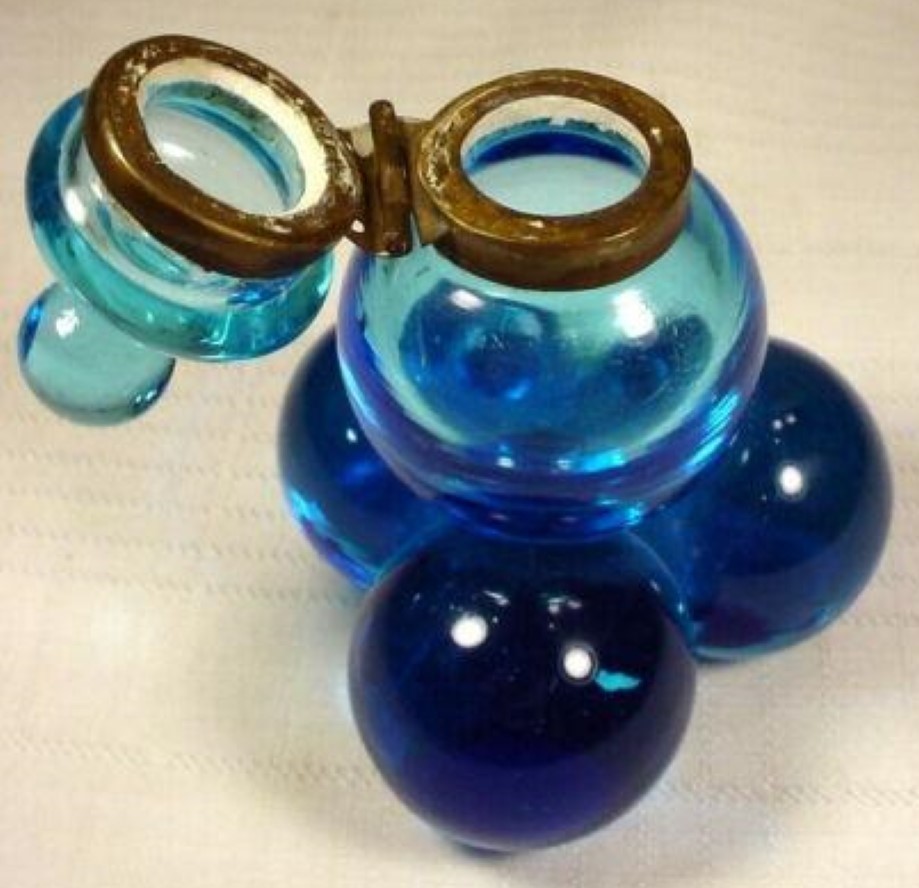 These inkwells are attributed to the Harrach Glassworks (also known as Harrachov Glassworks – the area around the glassworks developed into the town of Harrachov). The company produced a wide variety of glass pieces beyond inkwells. Pictured with an inkwell are a paperweight and vase with a similar design.
