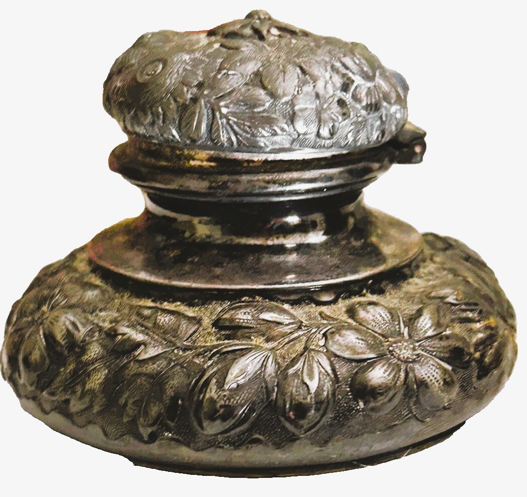 - Form and Decoration: The inkwell has a rounded form with a distinct neck and a fitted, hinged lid. Both the body and the lid are adorned with intricate high-relief floral patterns. These elaborate designs feature lush blossoms and foliage, sculpted to stand out from the surface, showcasing the detailed artistry characteristic of the era.