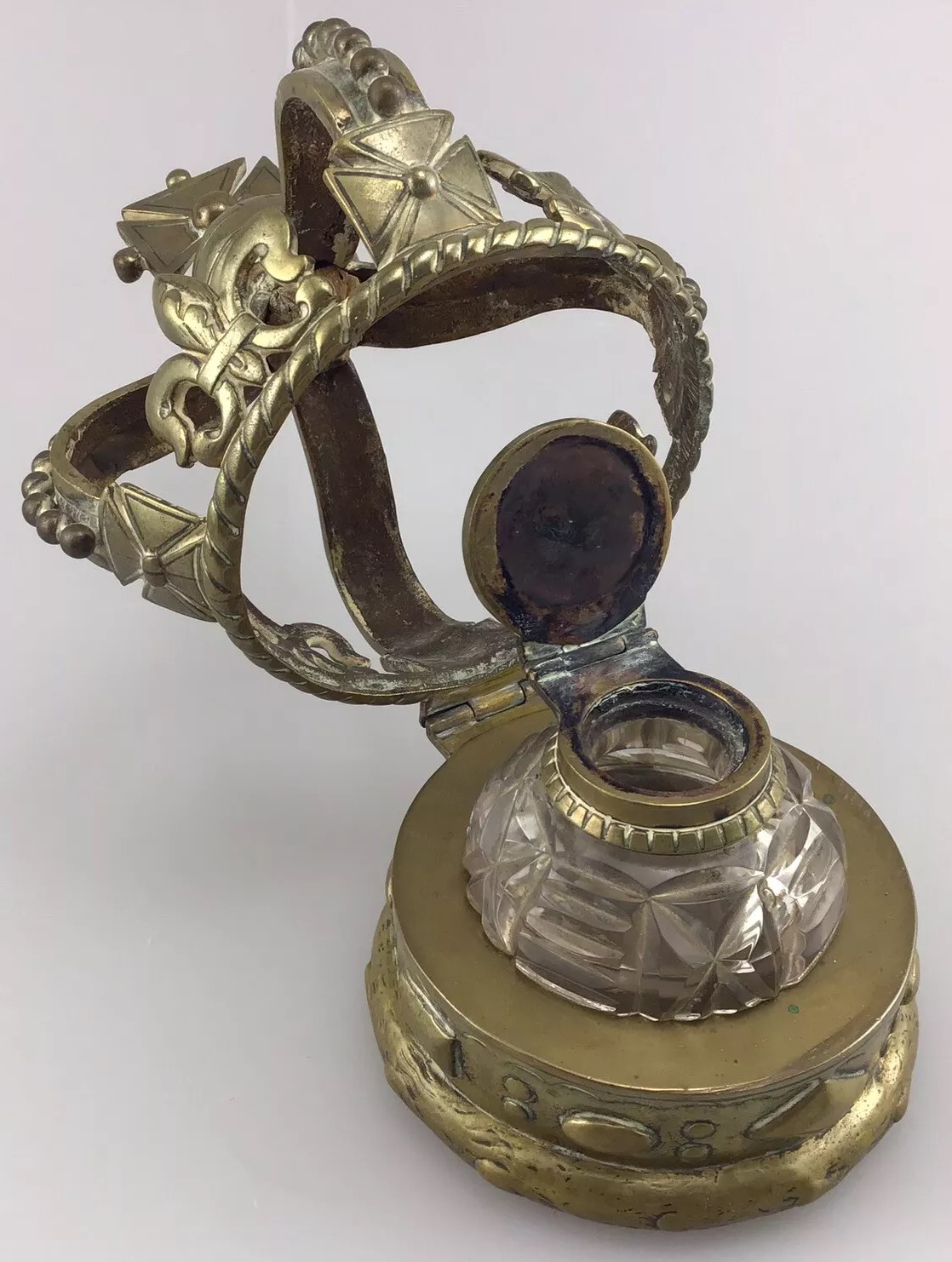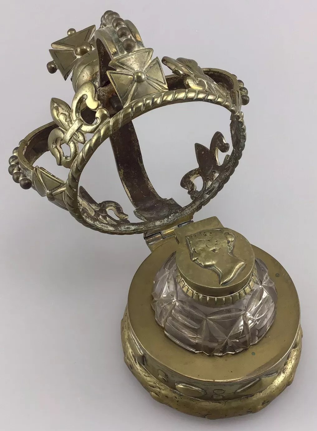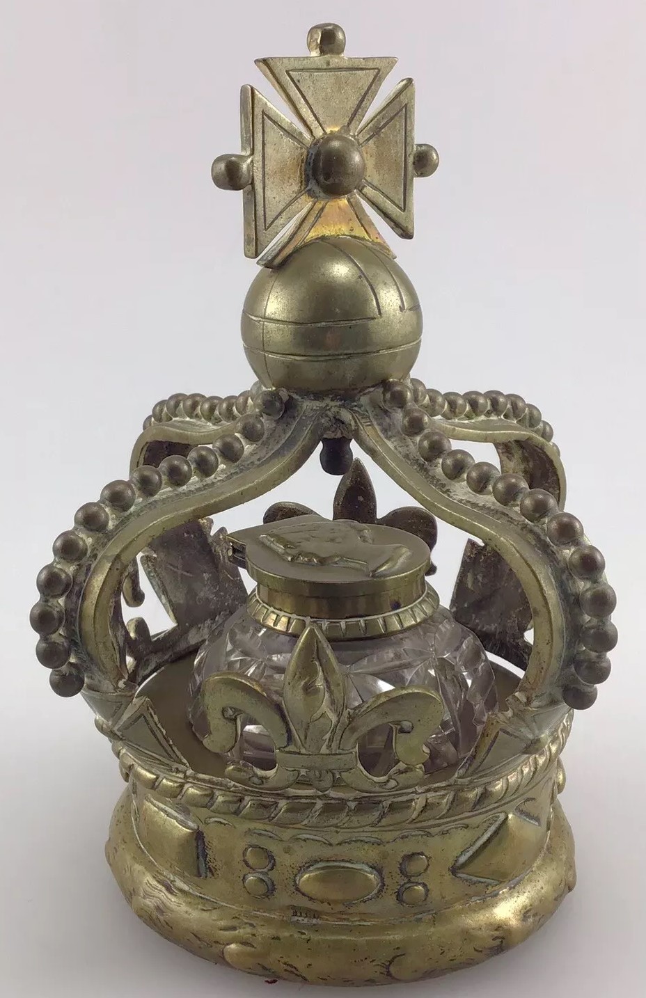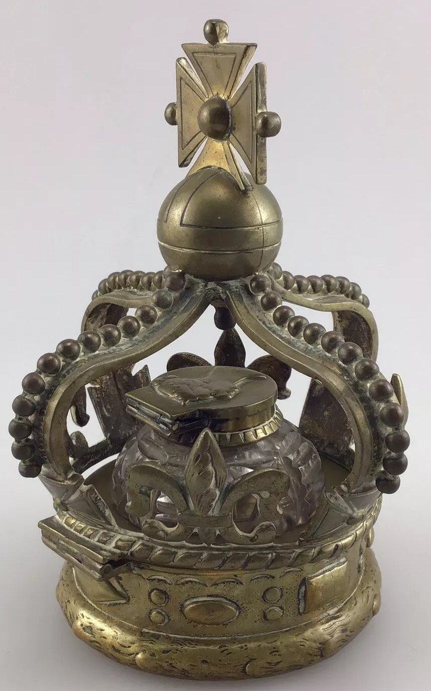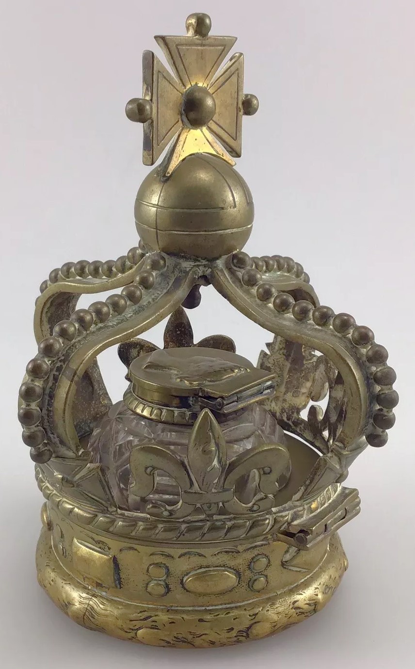 This inkwell is designed in the form of a crown, commemorating Queen Victoria. The crown features several symbolic elements:
