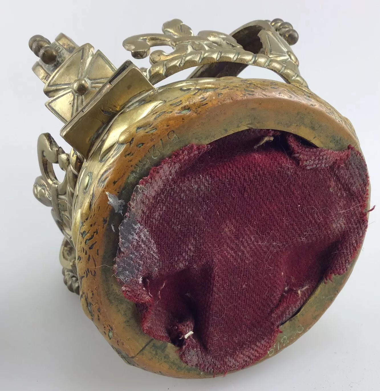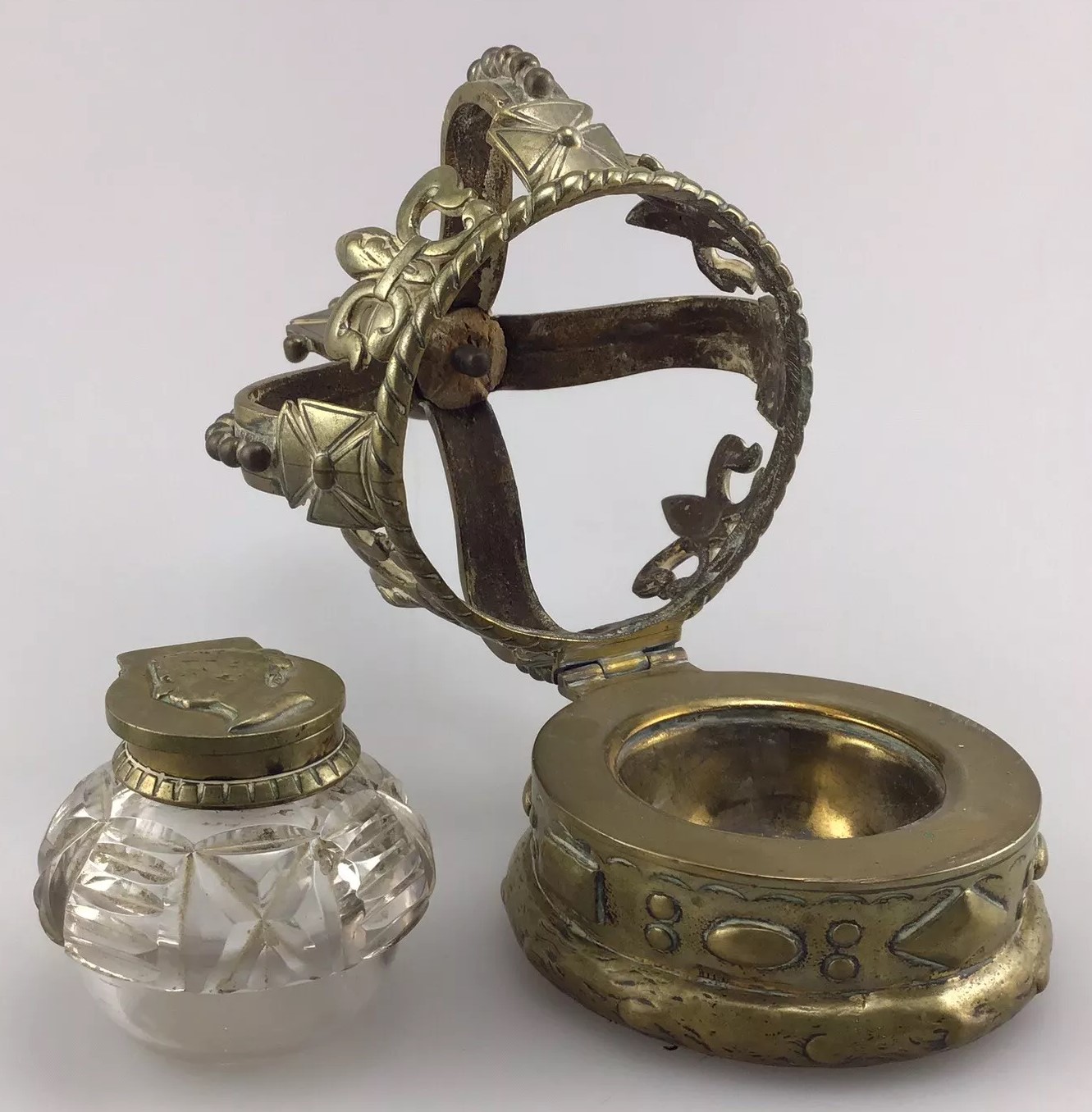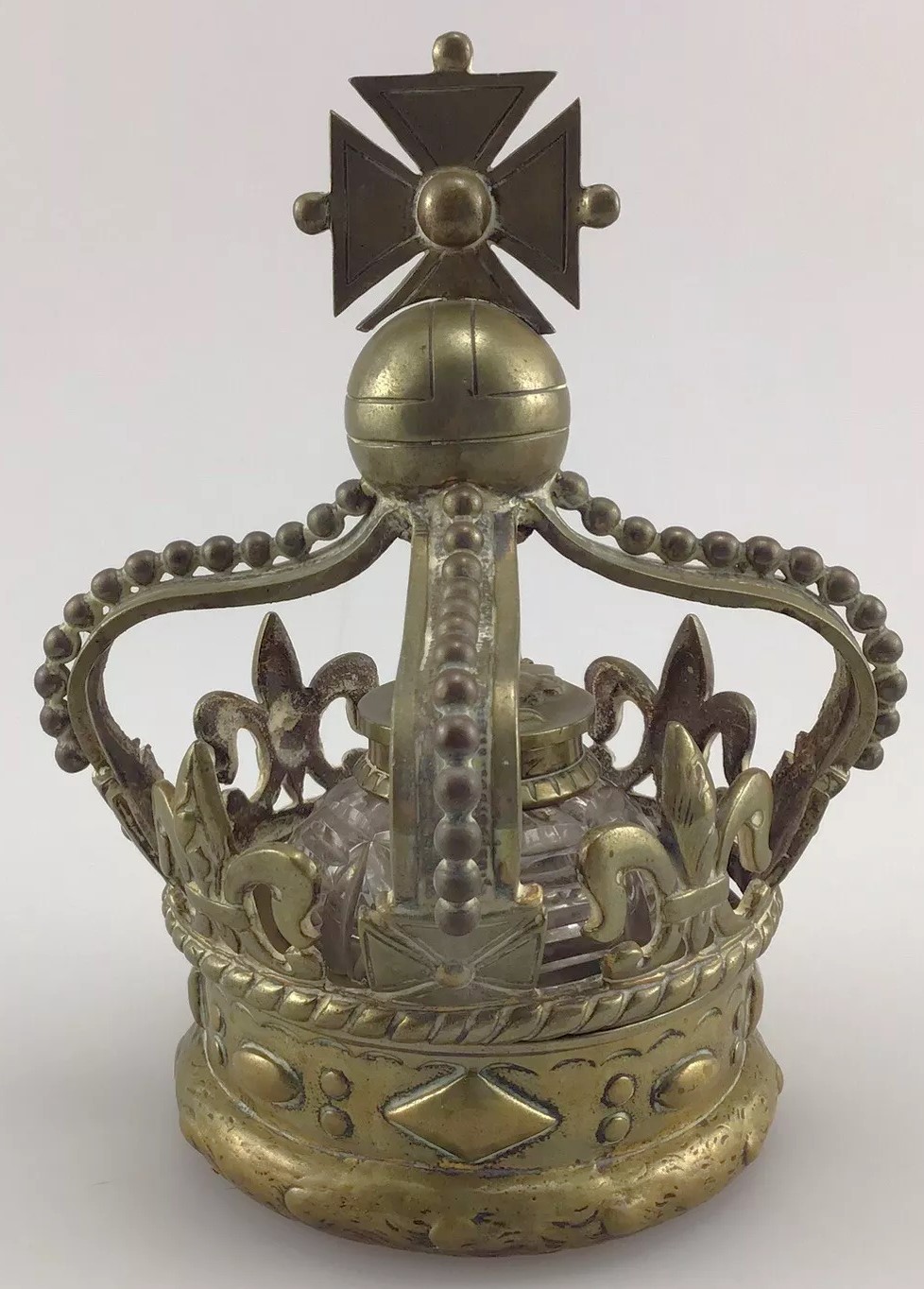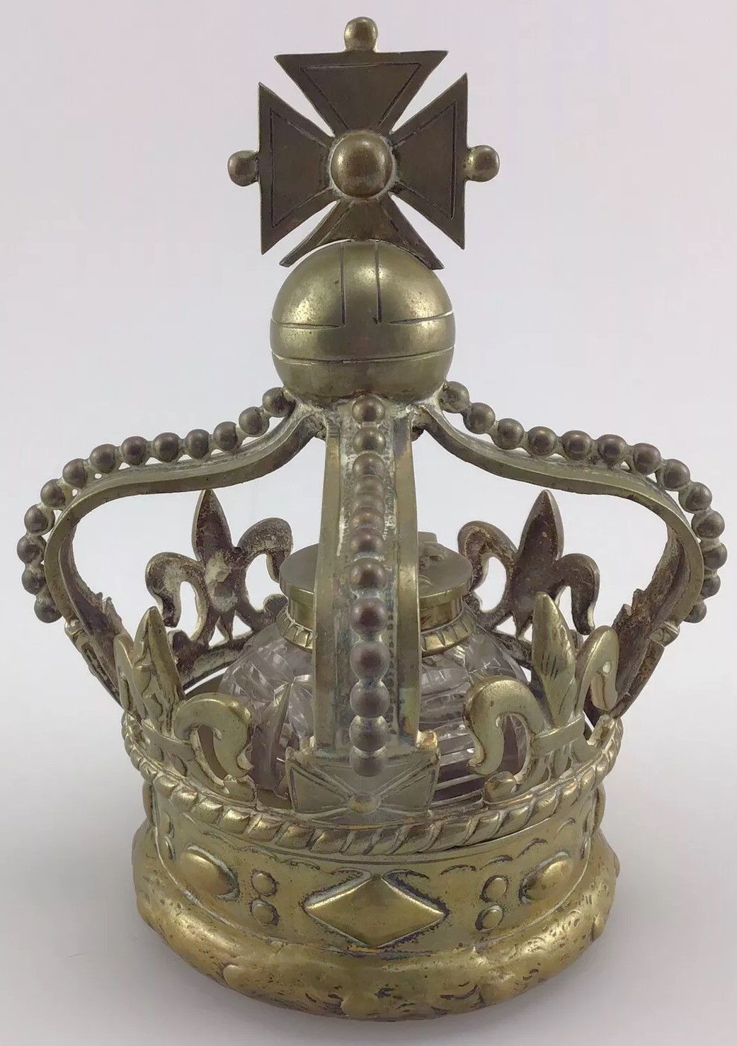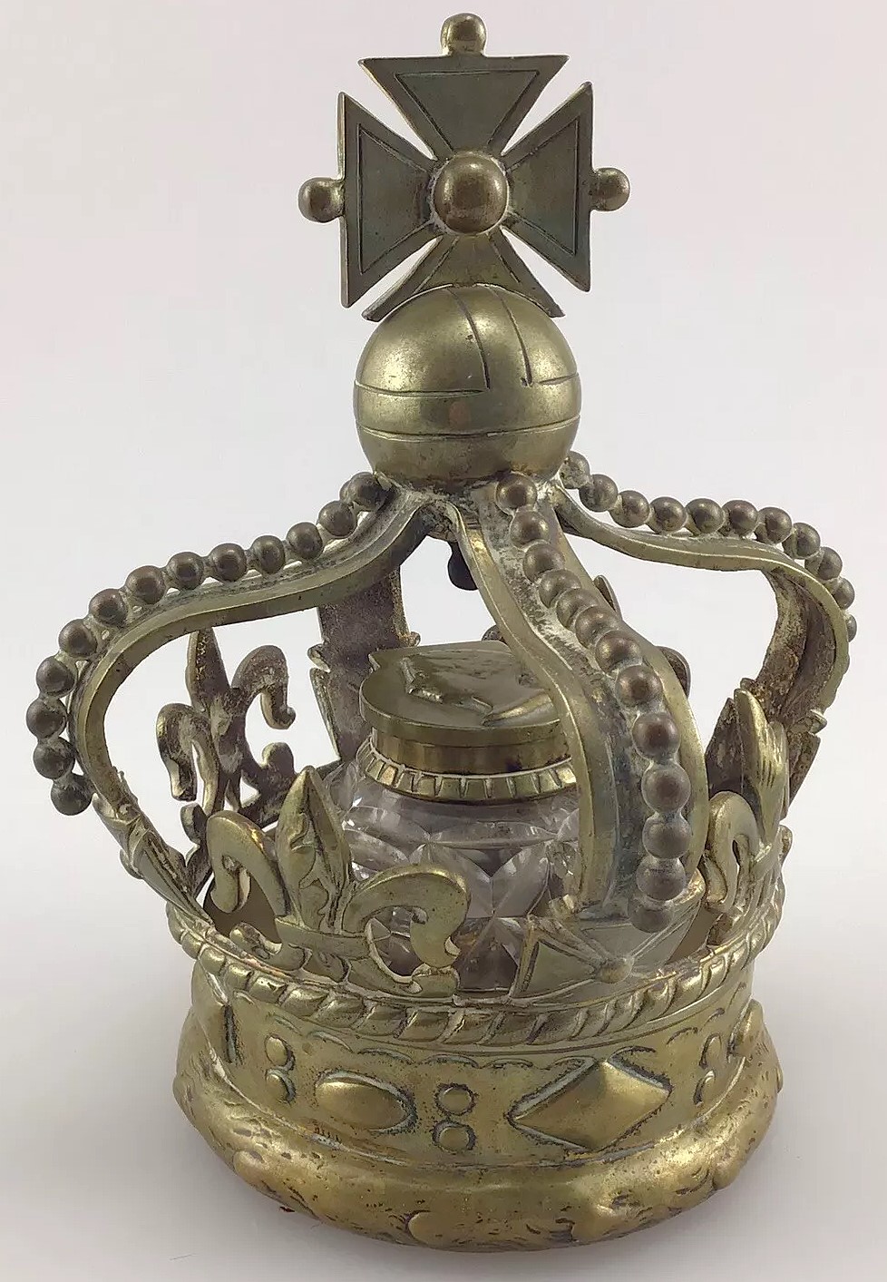 This inkwell is designed in the form of a crown, commemorating Queen Victoria. The crown features several symbolic elements:
