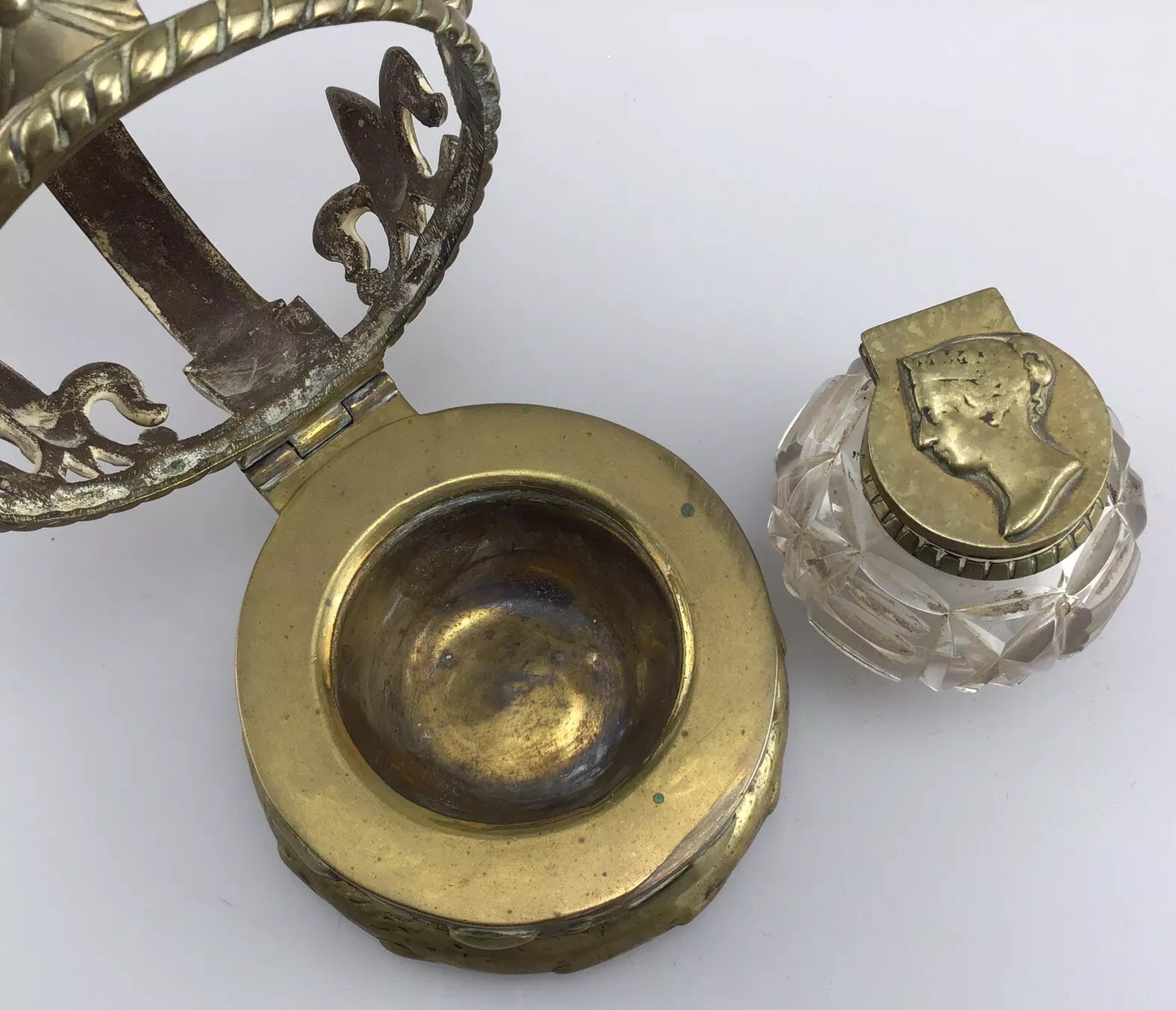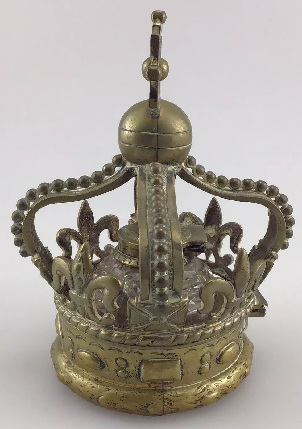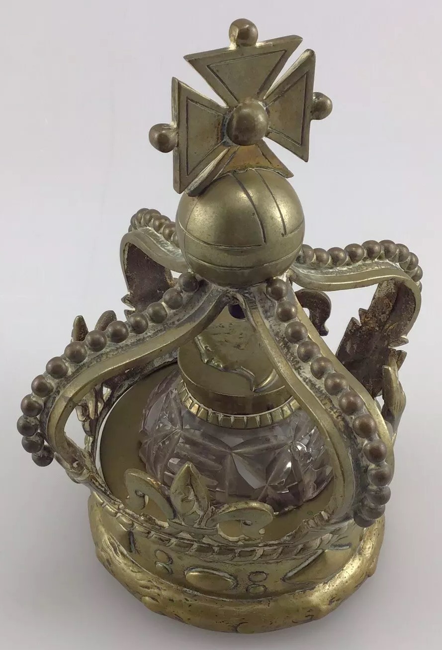 When the crown is opened, it reveals a glass container with a faceted design, topped with a metal lid that has a profile of Queen Victoria embossed on it.