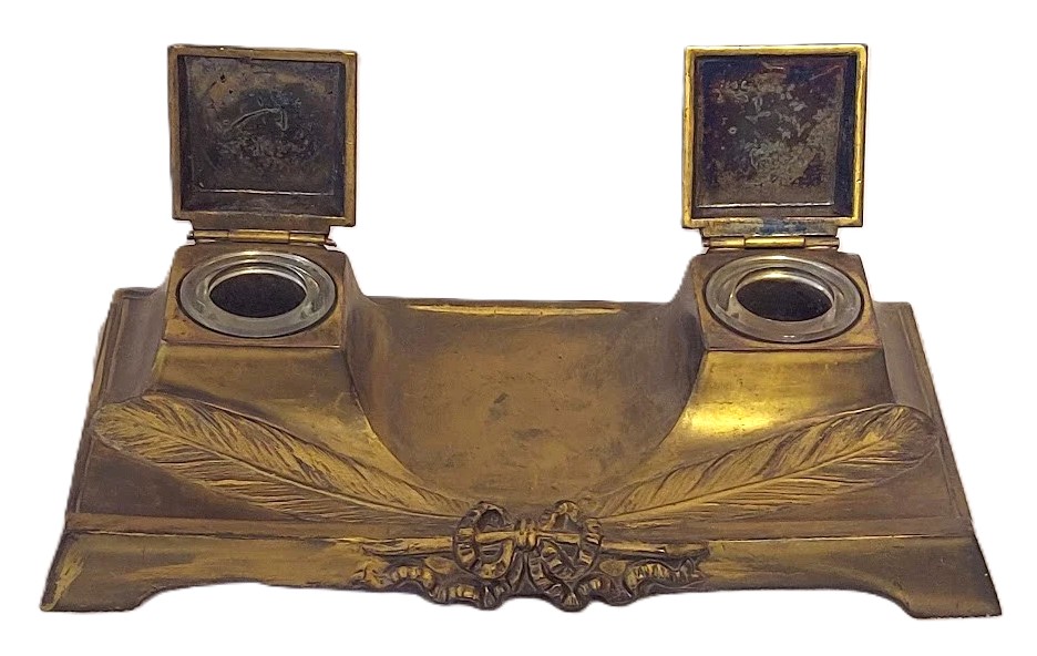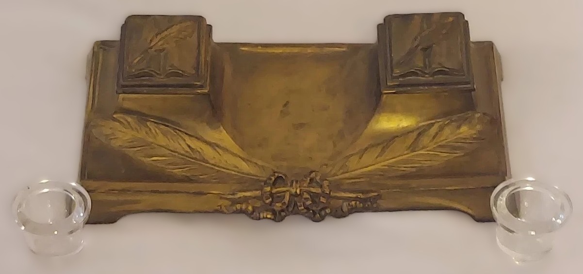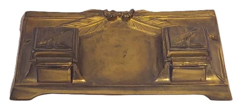 - Inkwells: It features two square, hinged inkwells. The lids are embossed with a distinctive relief of a quill pen resting on an open book.