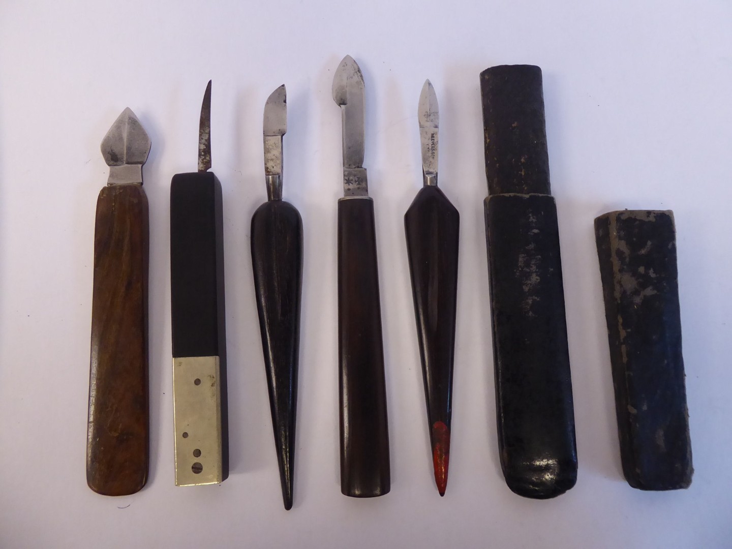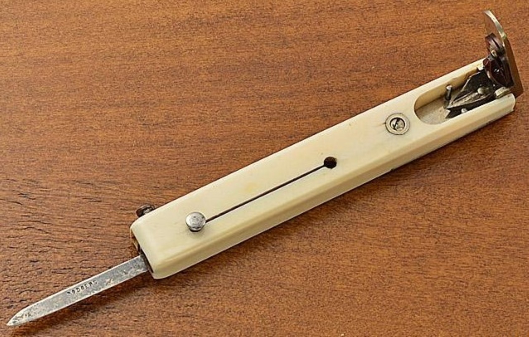 • Quill Cutter: If one were lucky (and wealthy) a quill cutter made the process easier. Pictured is a quill cutter with ivory handle. One end has a nib cutting mechanism. There’s a retractable blade on the other end. This dates to mid to late 1800s.