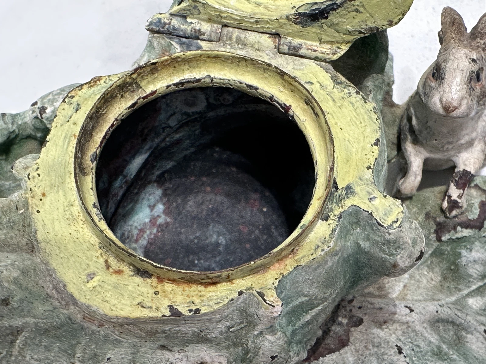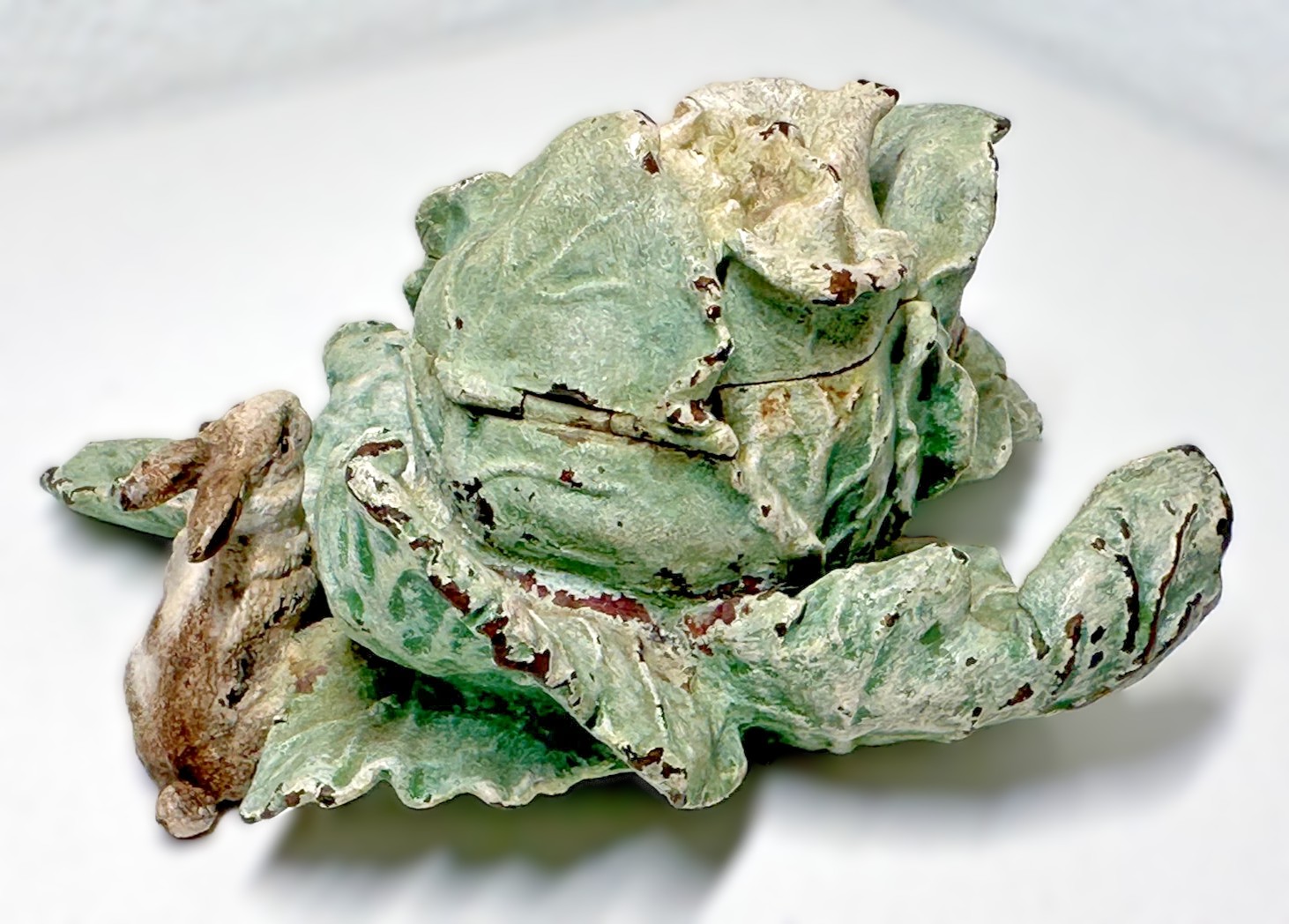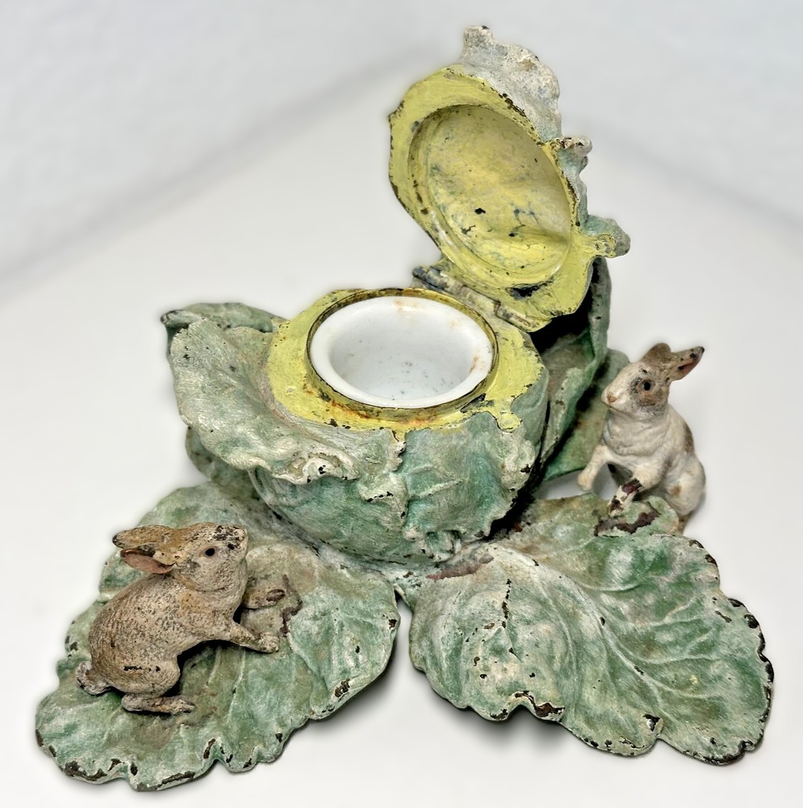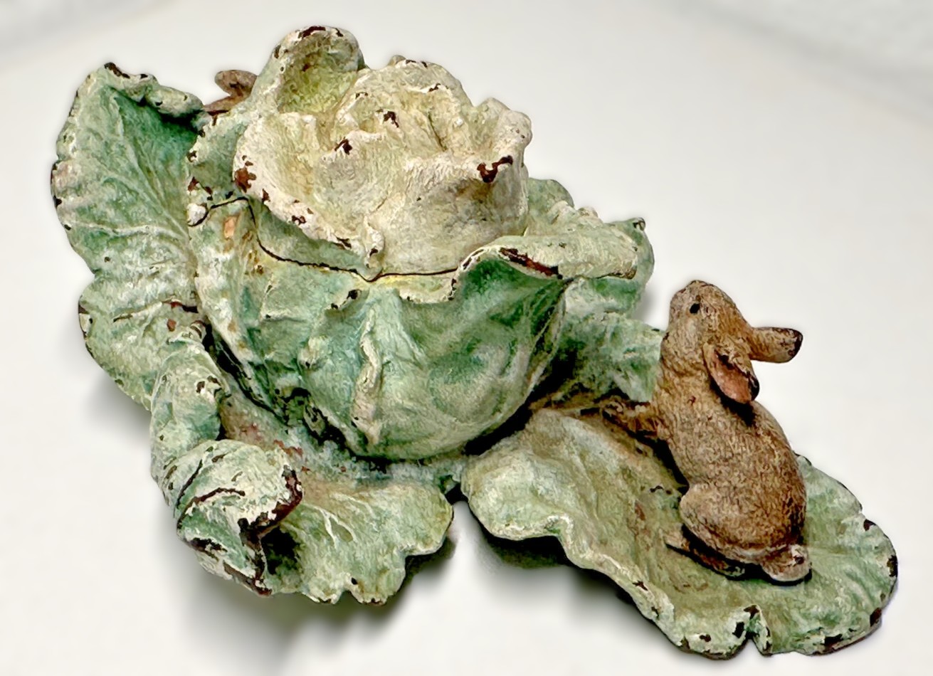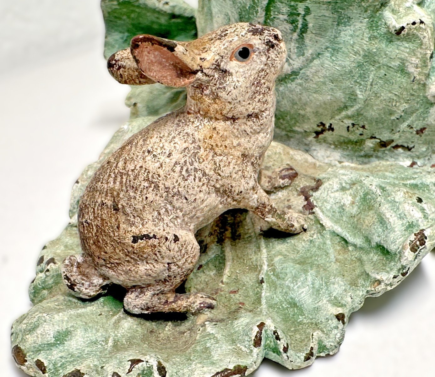 - Finish/Patina: The casting is detailed, capturing the texture of the rabbits’ fur and the veins/folds of the cabbage leaves.