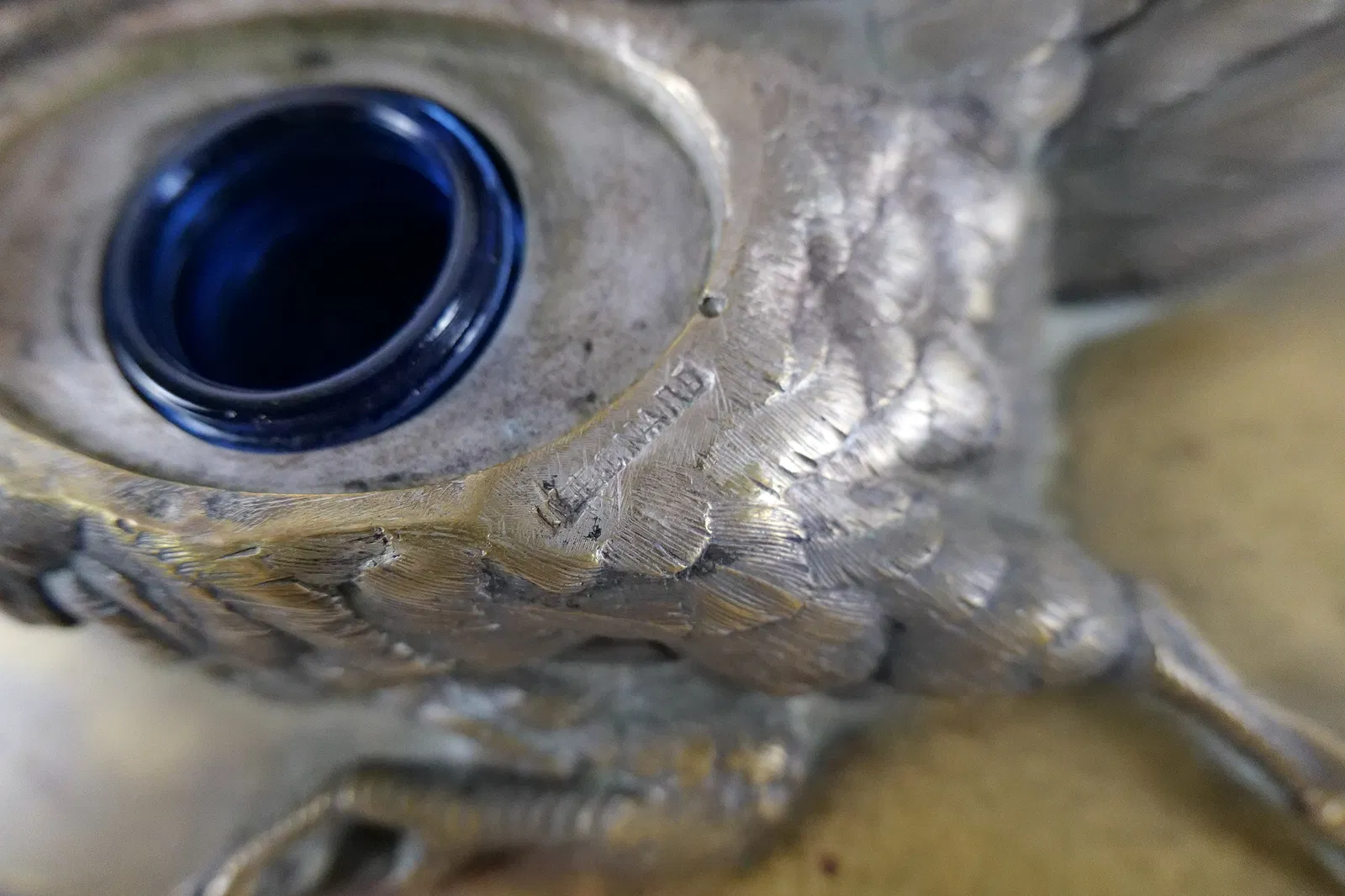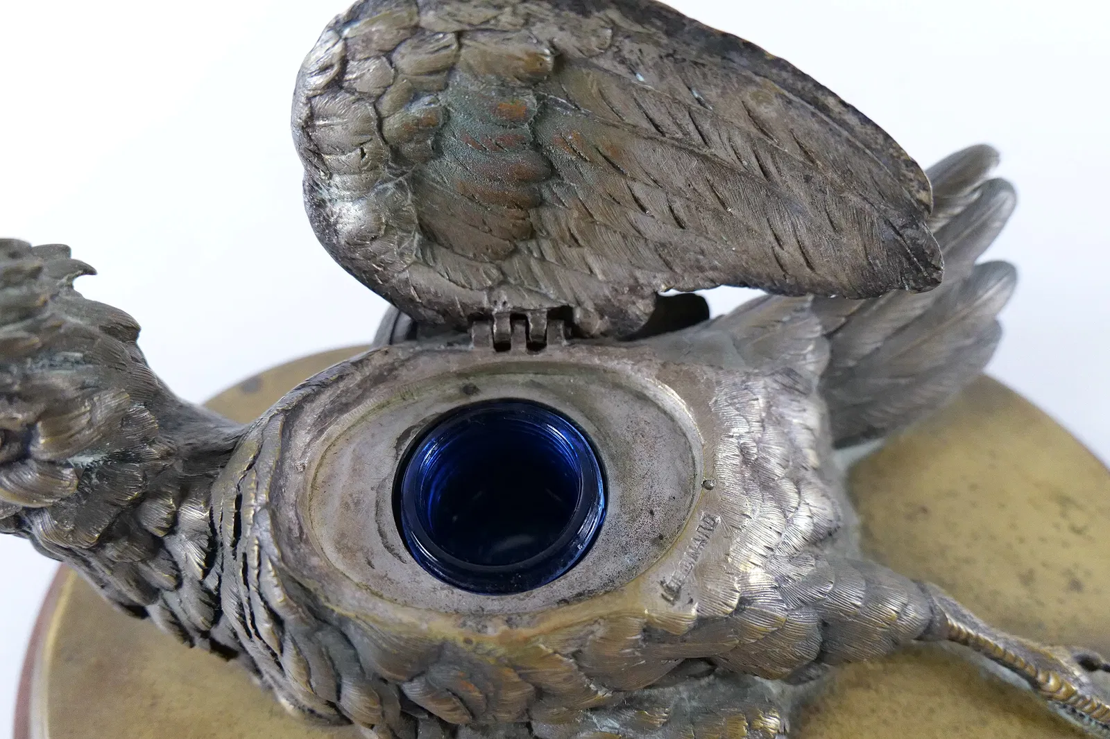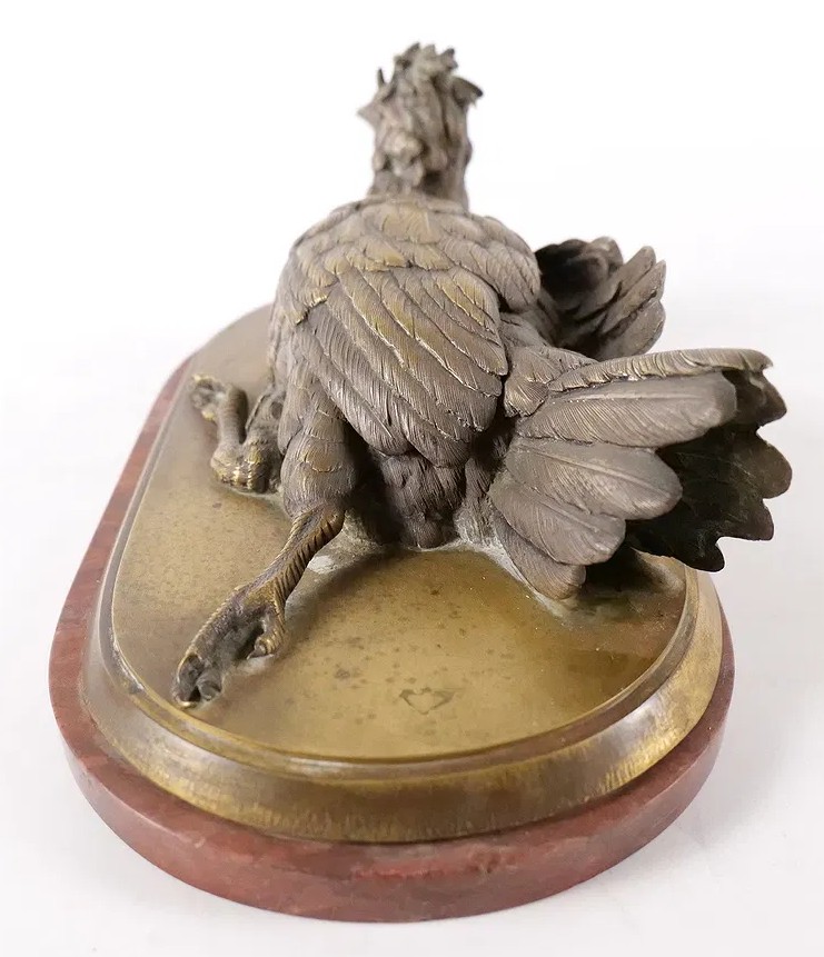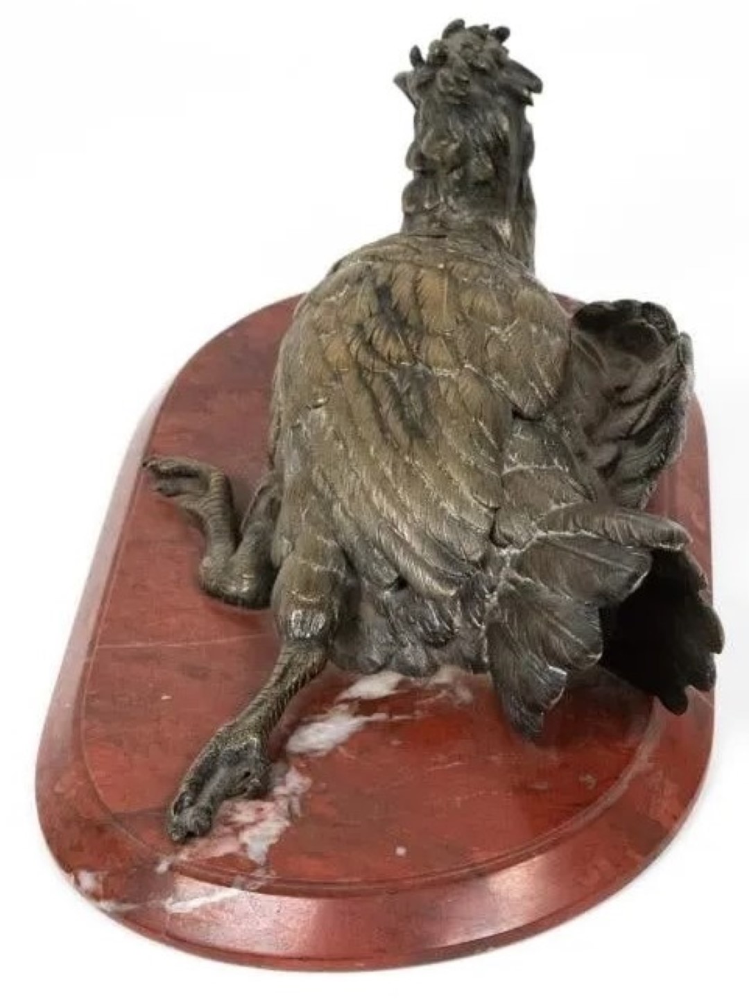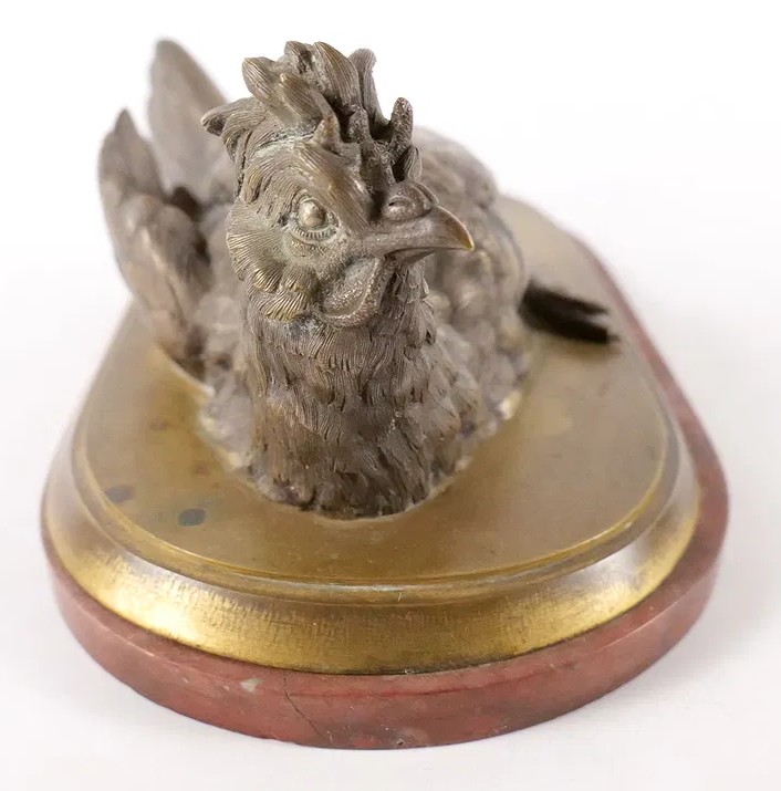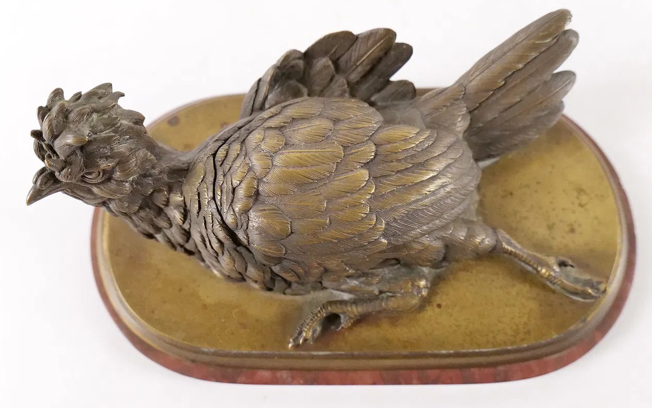A bird (chicken or pheasant hen) is shown reclined on an oval red marble base. The wing is hinged and lifts to access the inkwell (insert missing). The piece is signed under the wing “Leonard”.