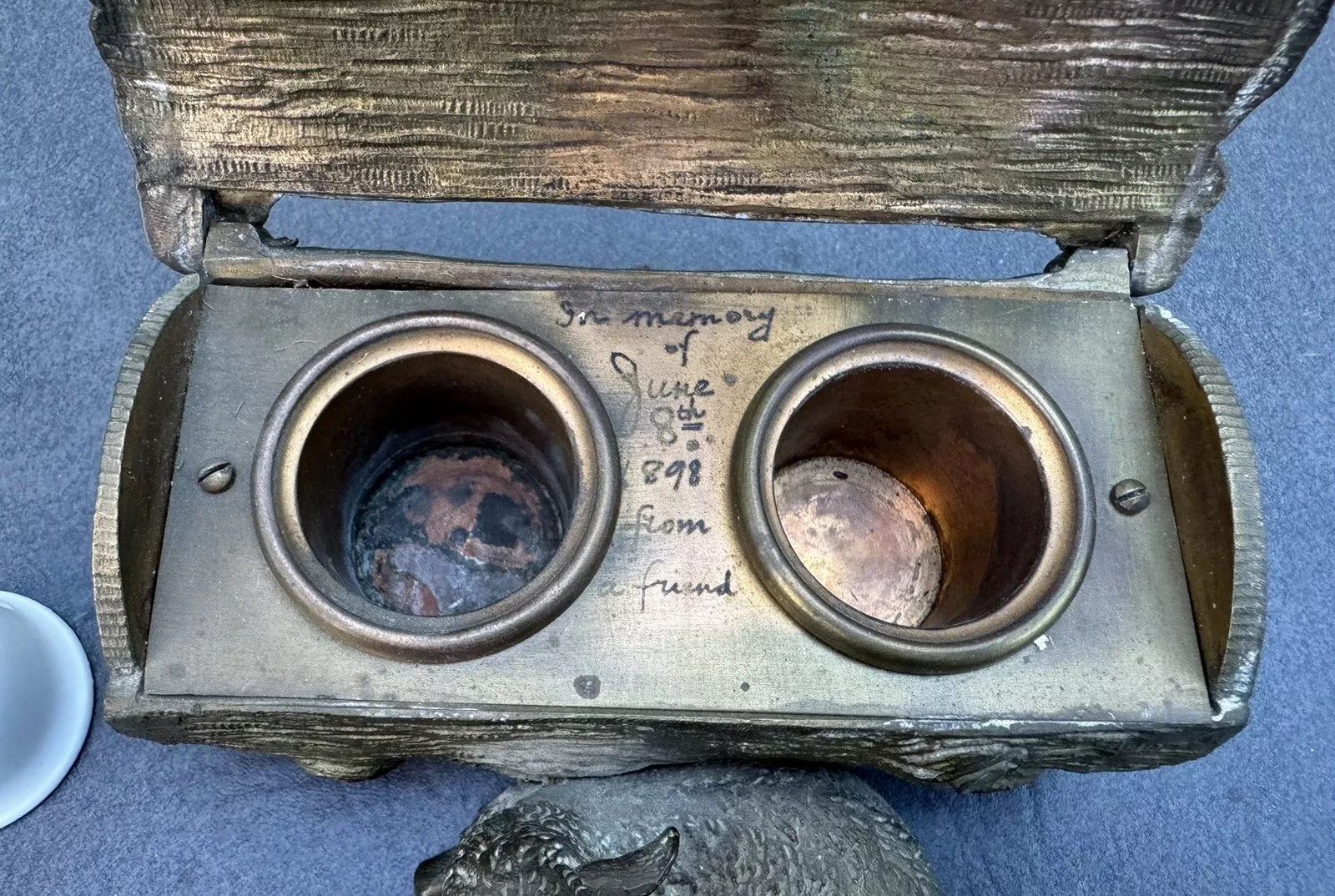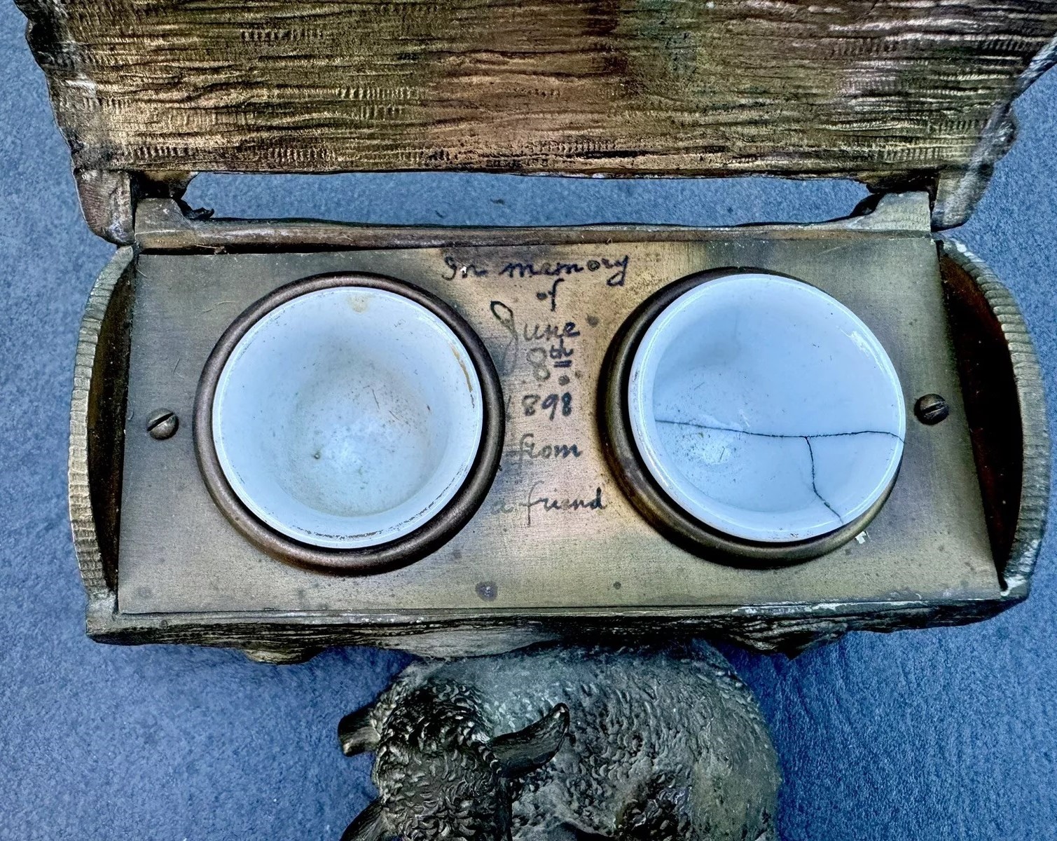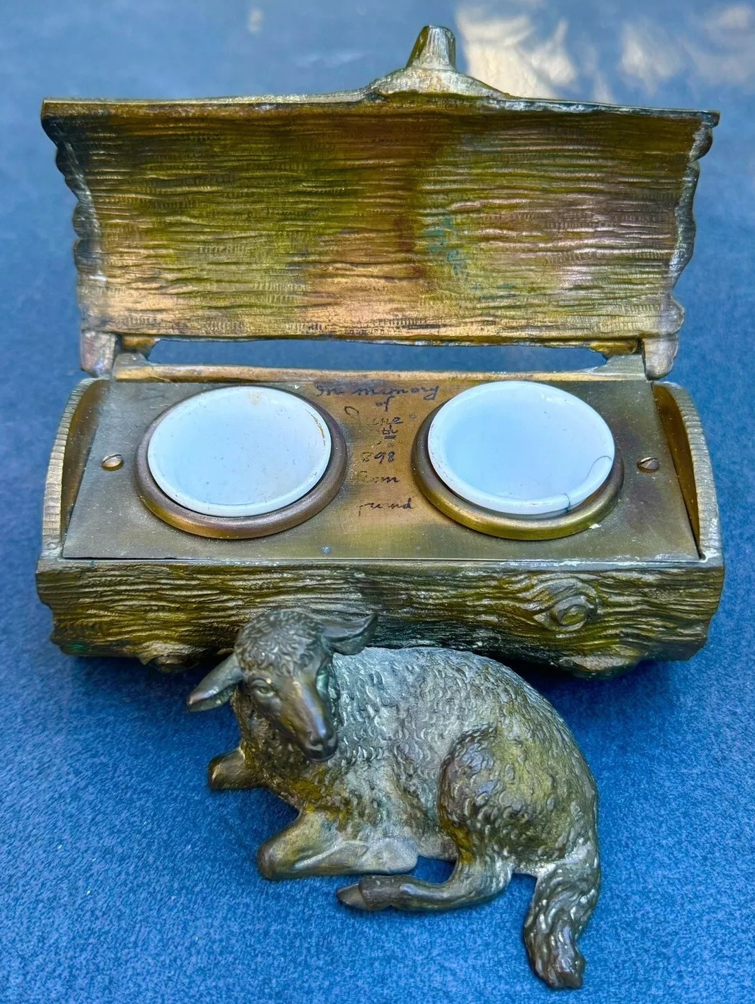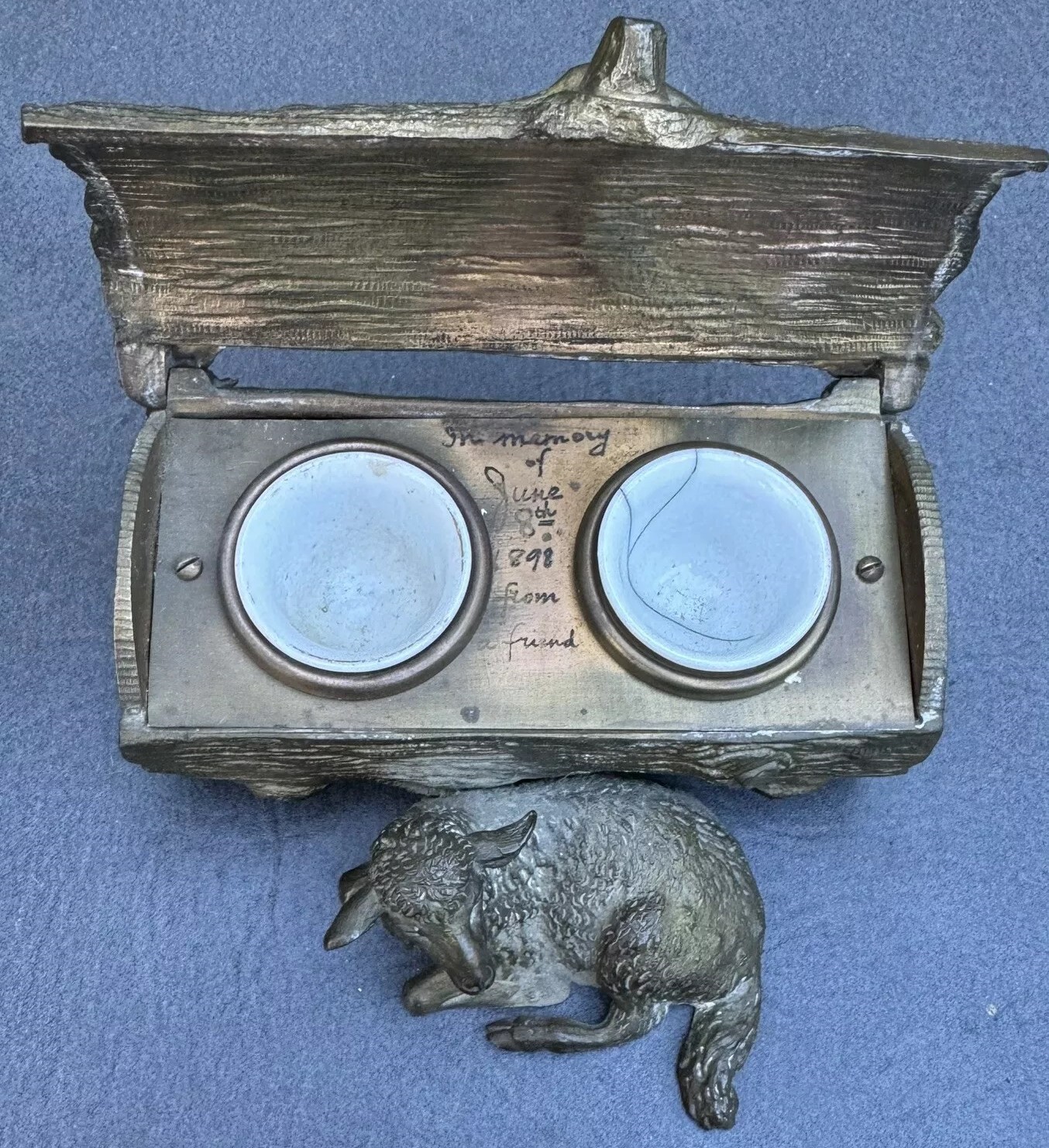This bronze inkstand features a recumbent lamb resting in front of a log. The log is intricately detailed to mimic the natural texture of wood, complete with grooves and knots. The top of the log is hinged, allowing it to open and reveal two inkwells inside. Inside the inkstand, there is a handwritten message: “In memory of June 8th, 1898, from a friend.”