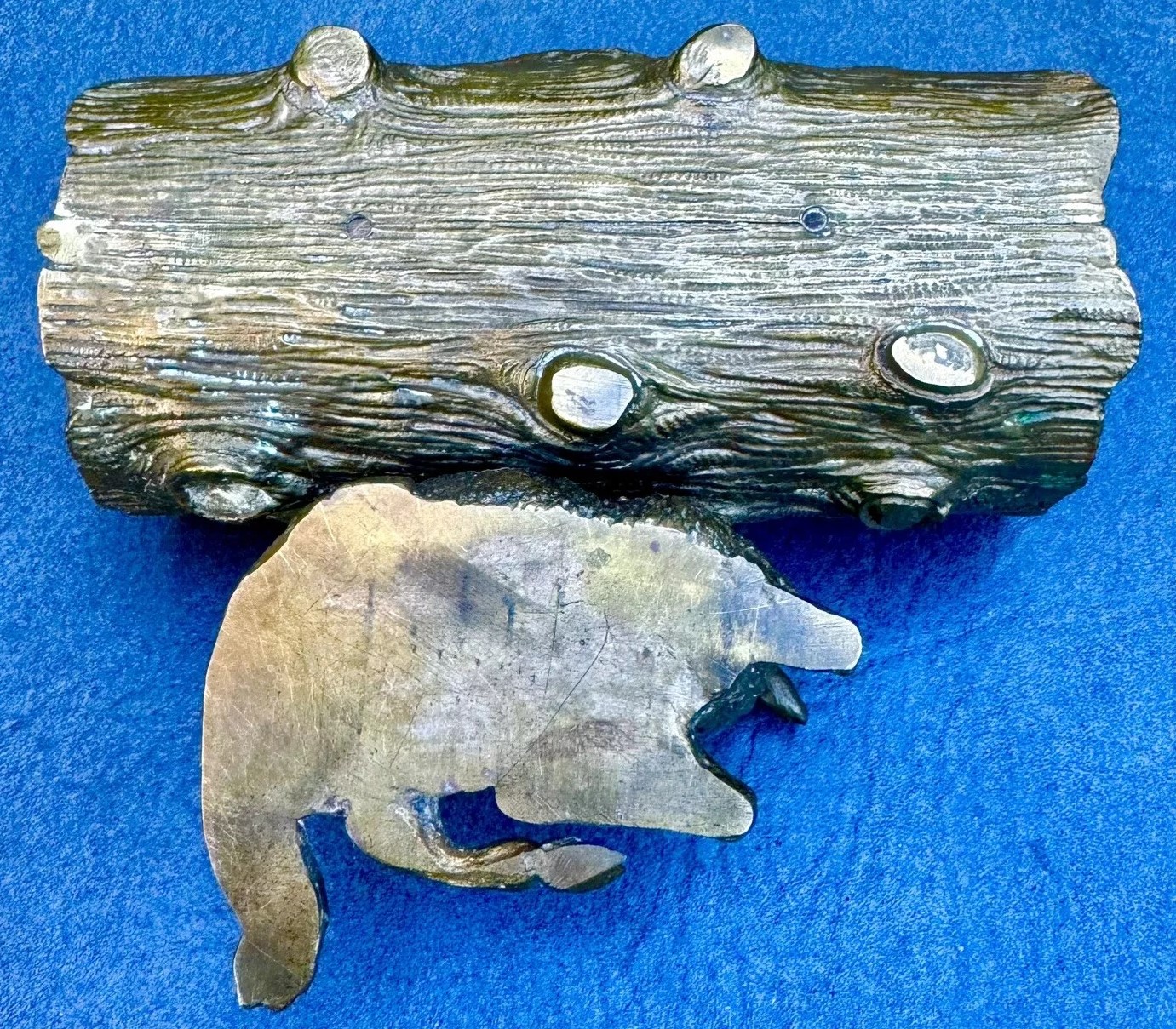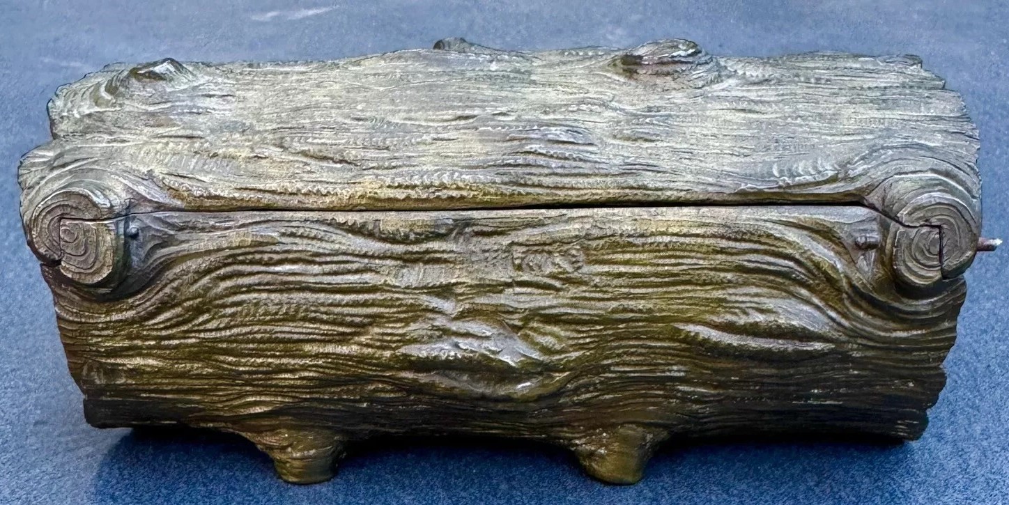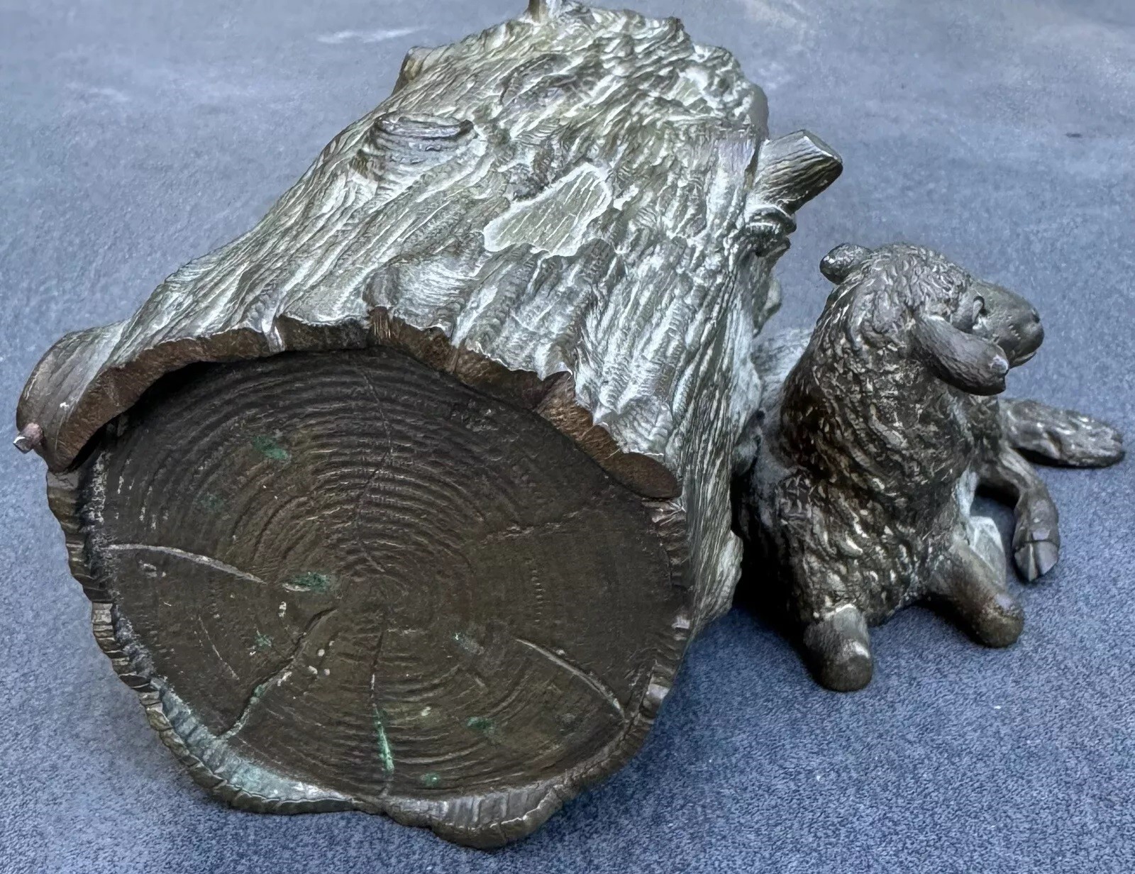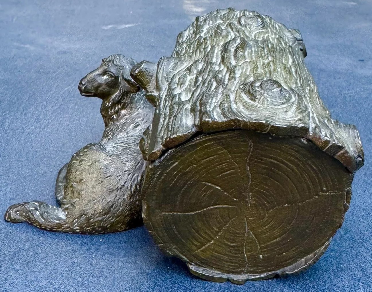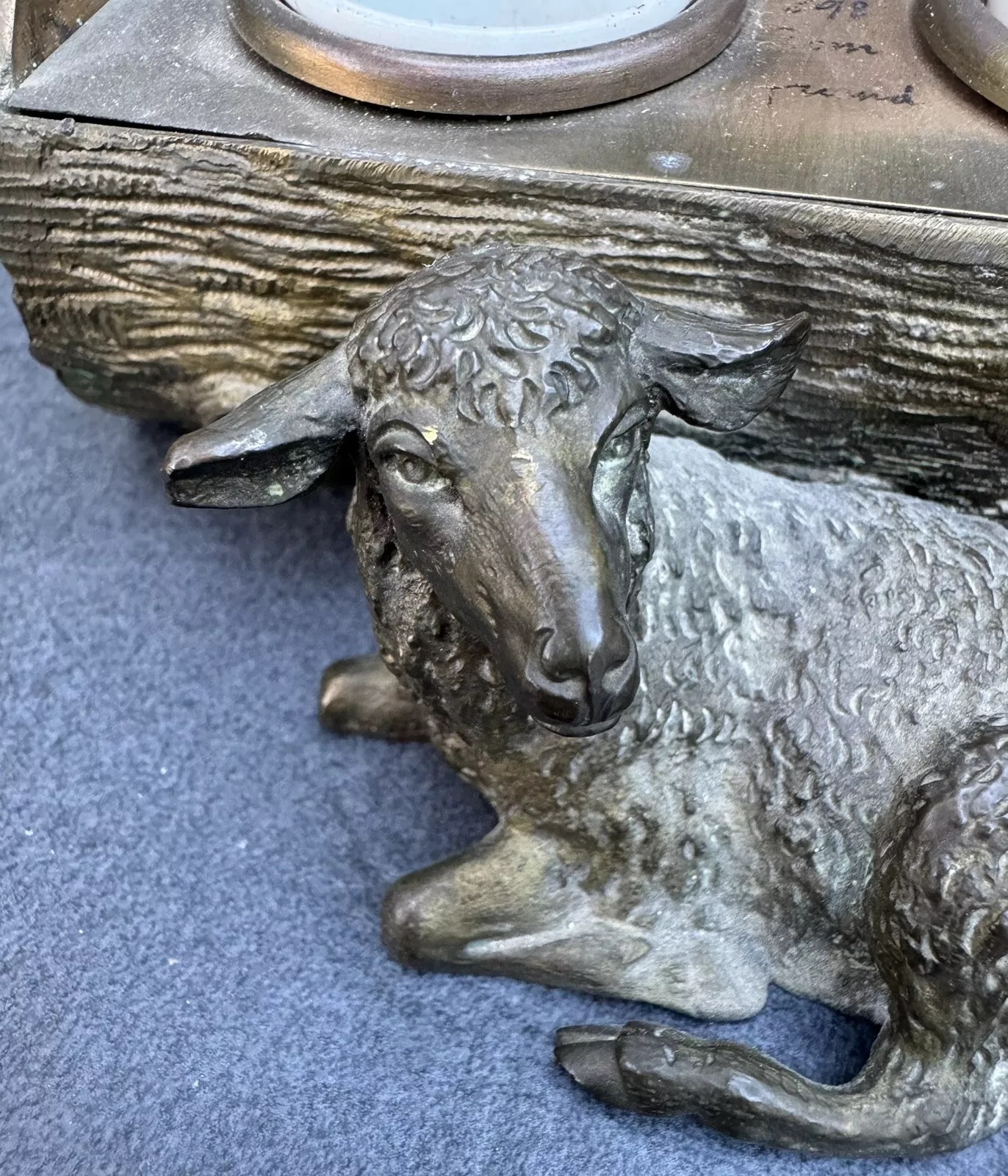 This bronze inkstand features a recumbent lamb resting in front of a log. The log is intricately detailed to mimic the natural texture of wood, complete with grooves and knots. The top of the log is hinged, allowing it to open and reveal two inkwells inside. Inside the inkstand, there is a handwritten message: “In memory of June 8th, 1898, from a friend.”