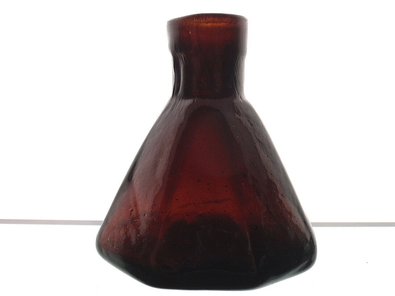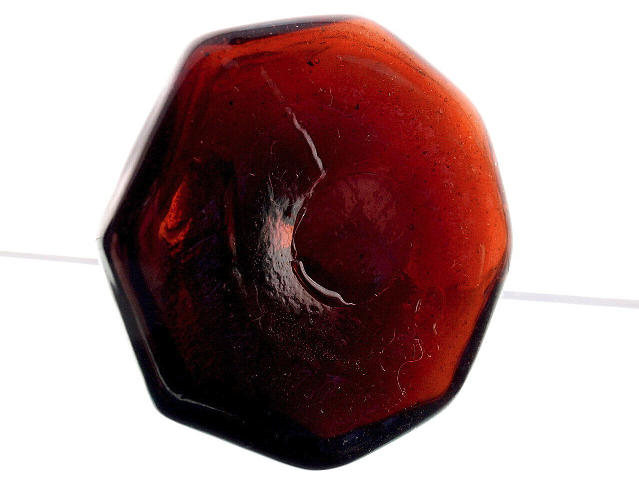 Red amber eight-panel with an open pontil umbrella glass ink bottle. Short lower skirt horizontal hairline is the only flaw.