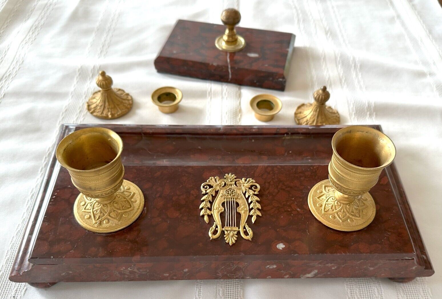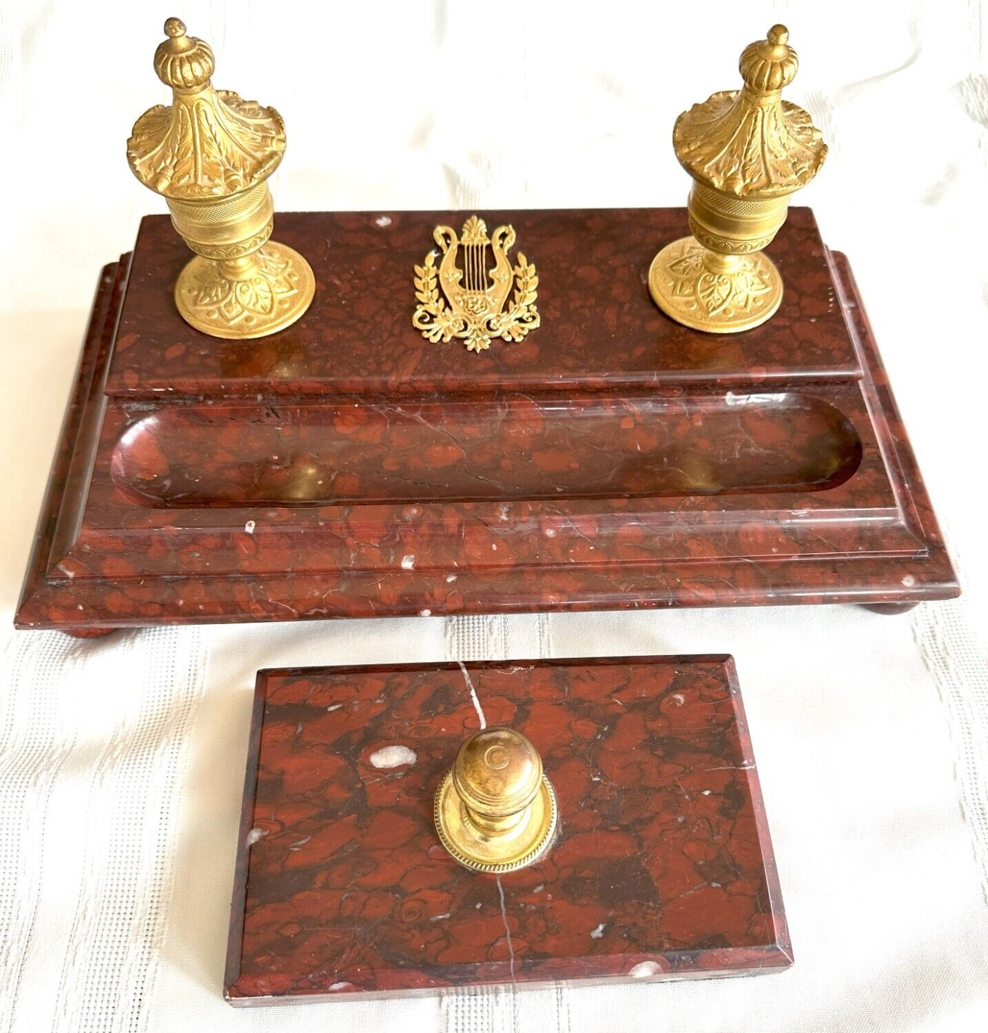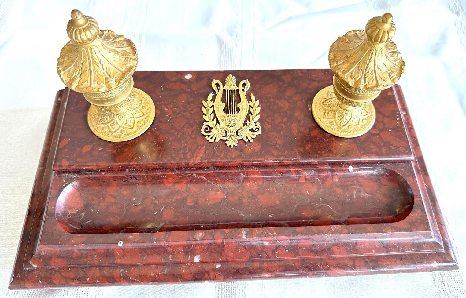 This inkstand has a red marble base with pen channel supporting two urn-shaped bronze inkwells with lift off lids. There is a matching rocker blotter. In the center attached to the marble is a decorative lyre piece. The base of the inkstand has four round red pedestal feet. The red marble shows veins of black and pockets of white stone.