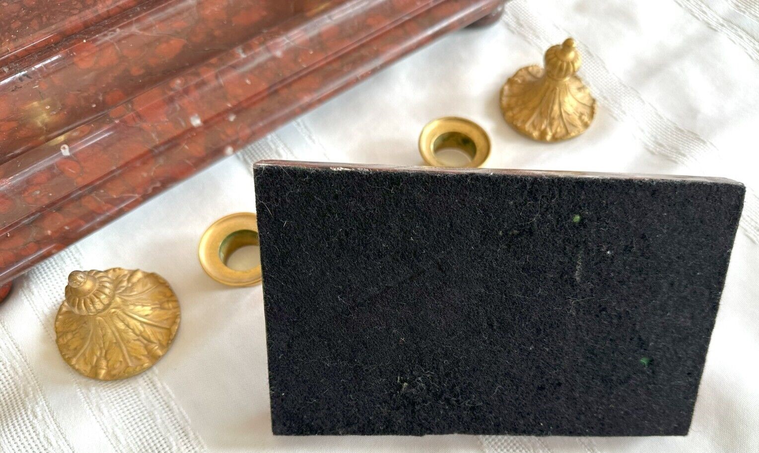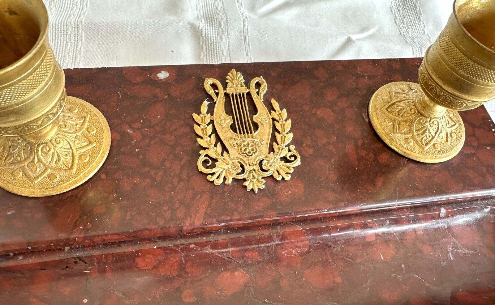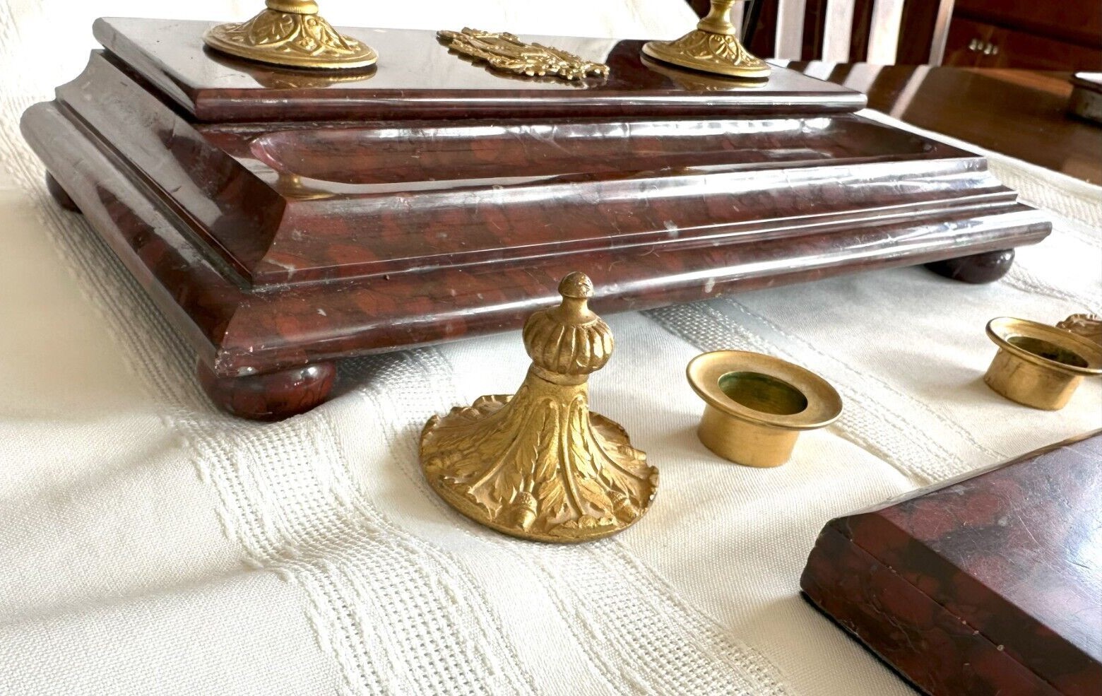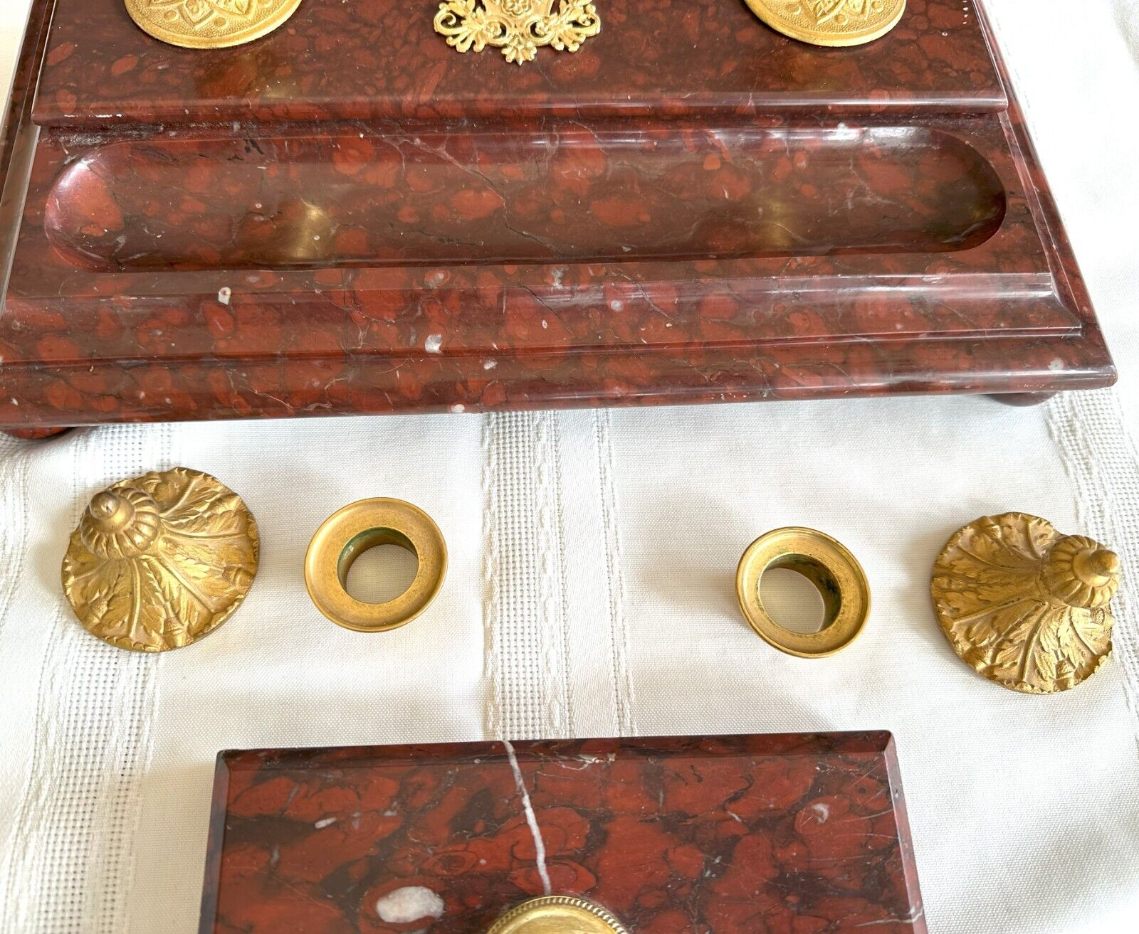 This inkstand has a red marble base with pen channel supporting two urn-shaped bronze inkwells with lift off lids. There is a matching rocker blotter. In the center attached to the marble is a decorative lyre piece. The base of the inkstand has four round red pedestal feet. The red marble shows veins of black and pockets of white stone.