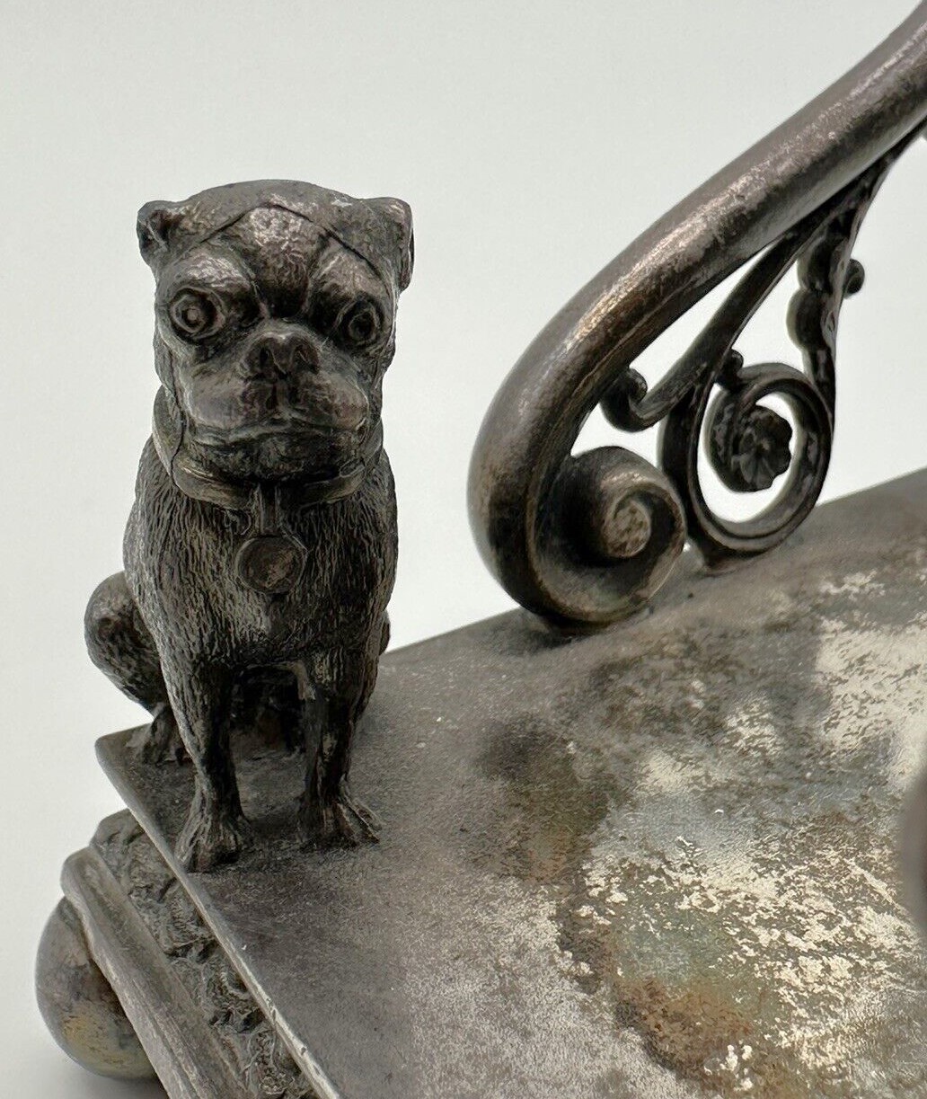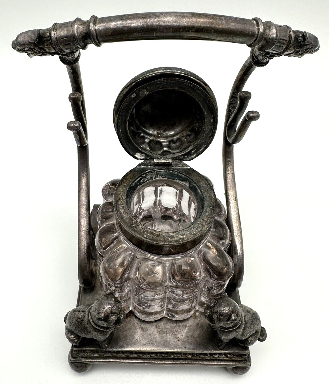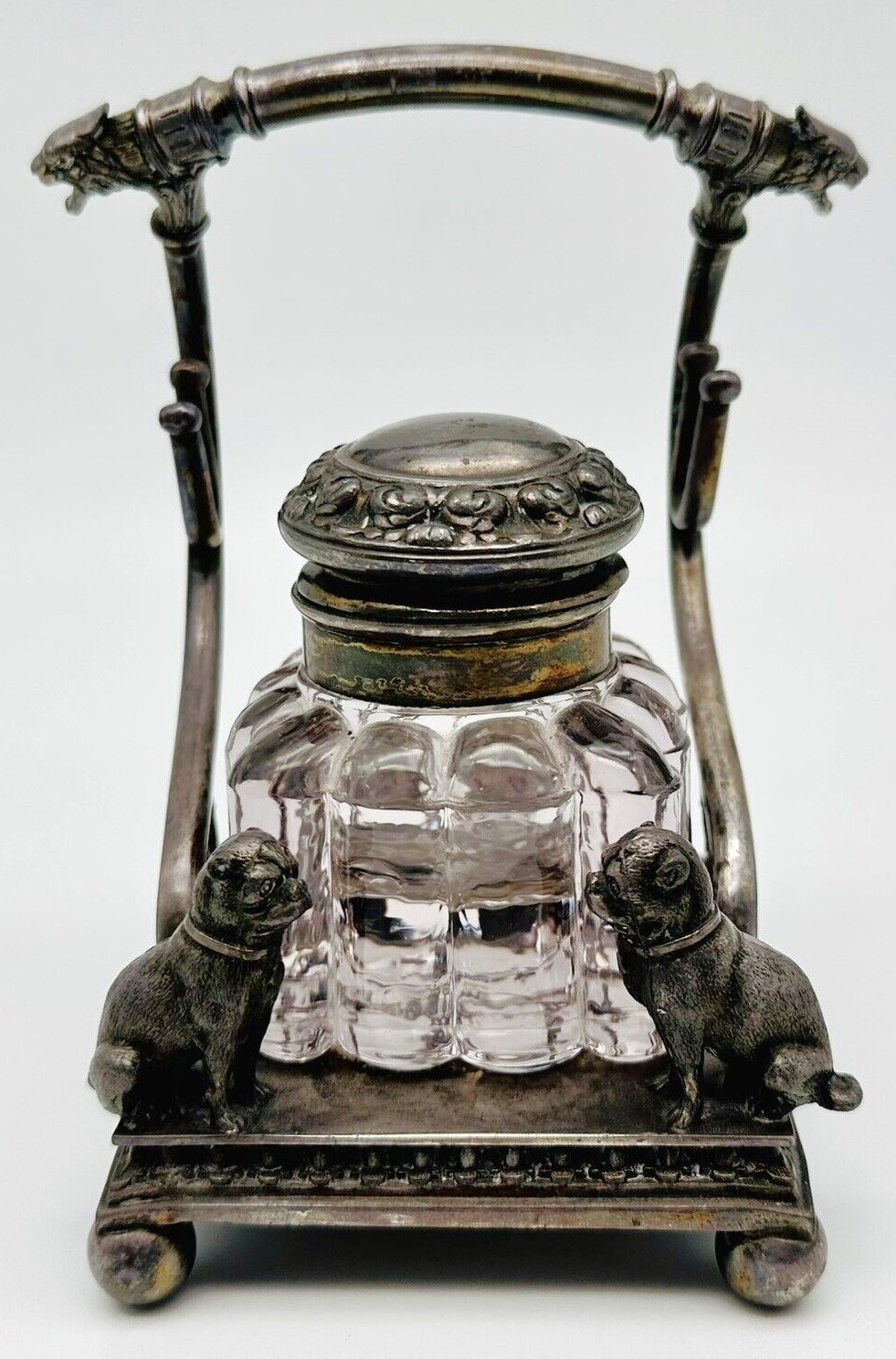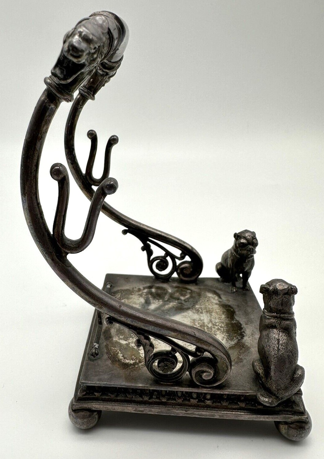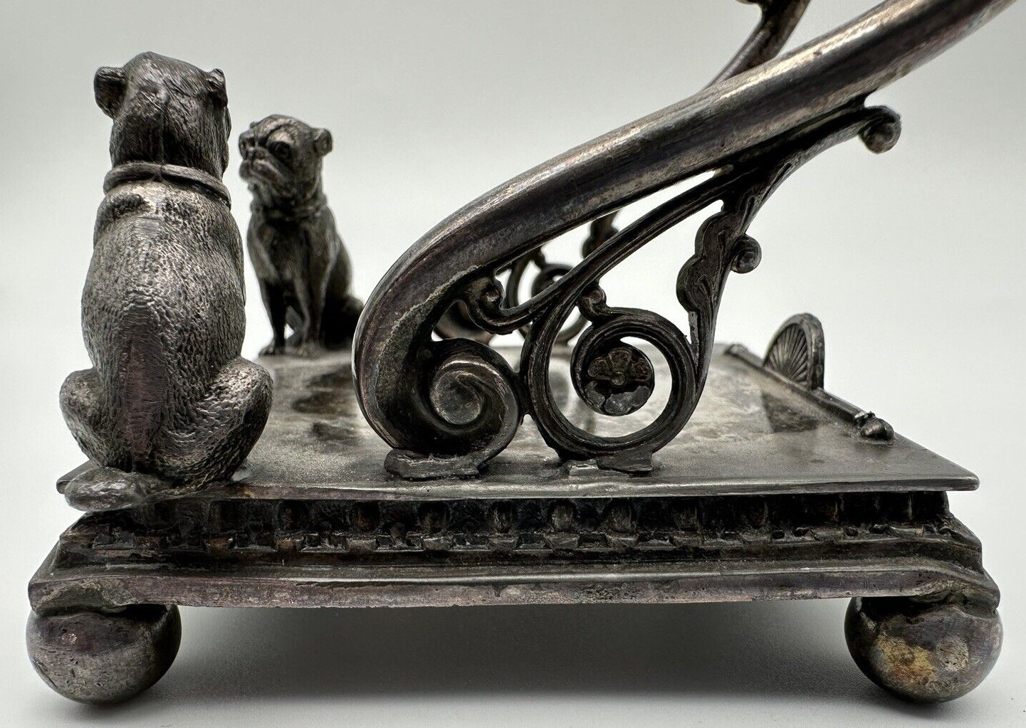 This silverplate inkstand from Reed & Barton features two pugs sitting on either side of an inkwell. The pen rack behind has two growling griffins at the top.