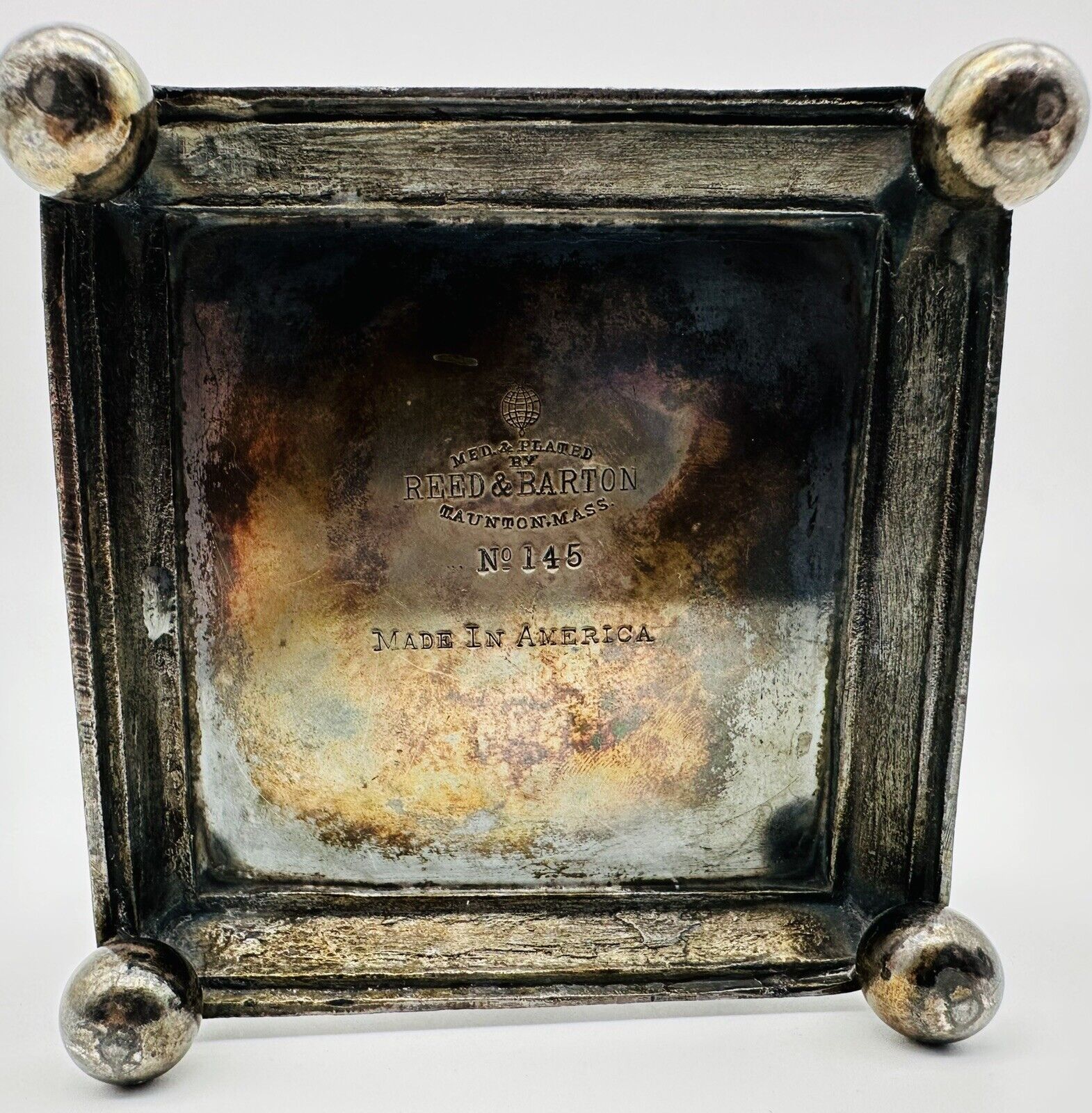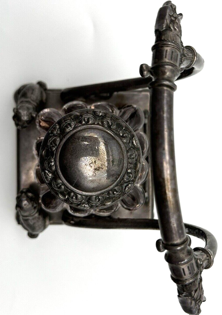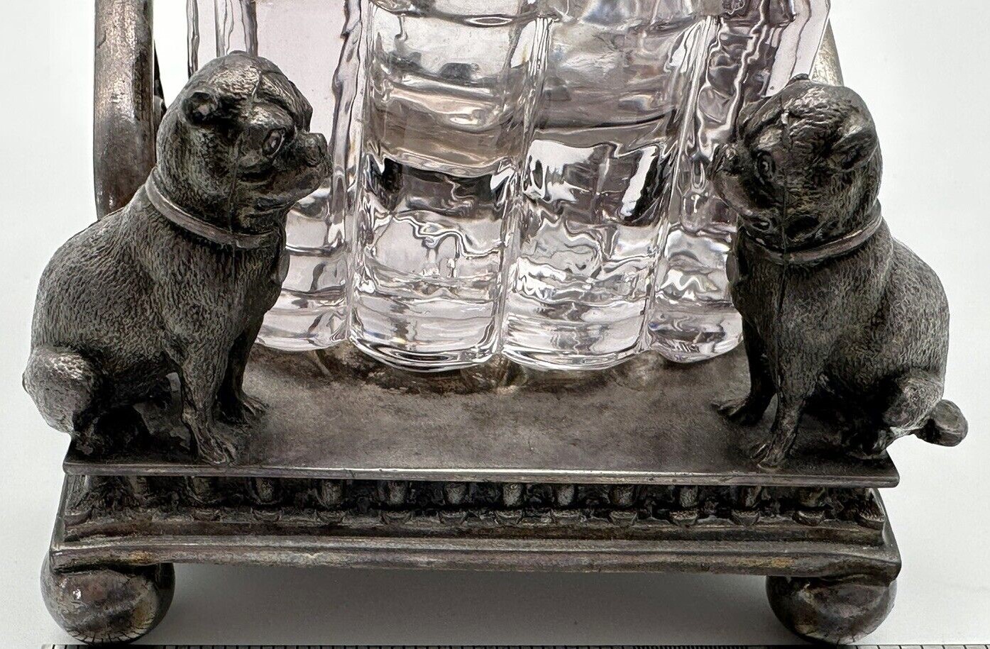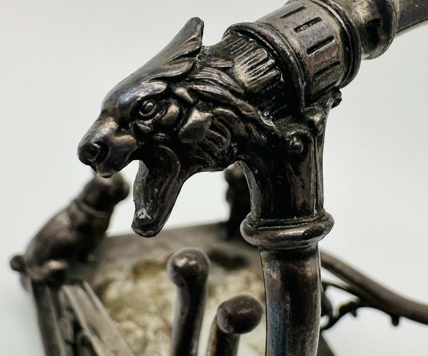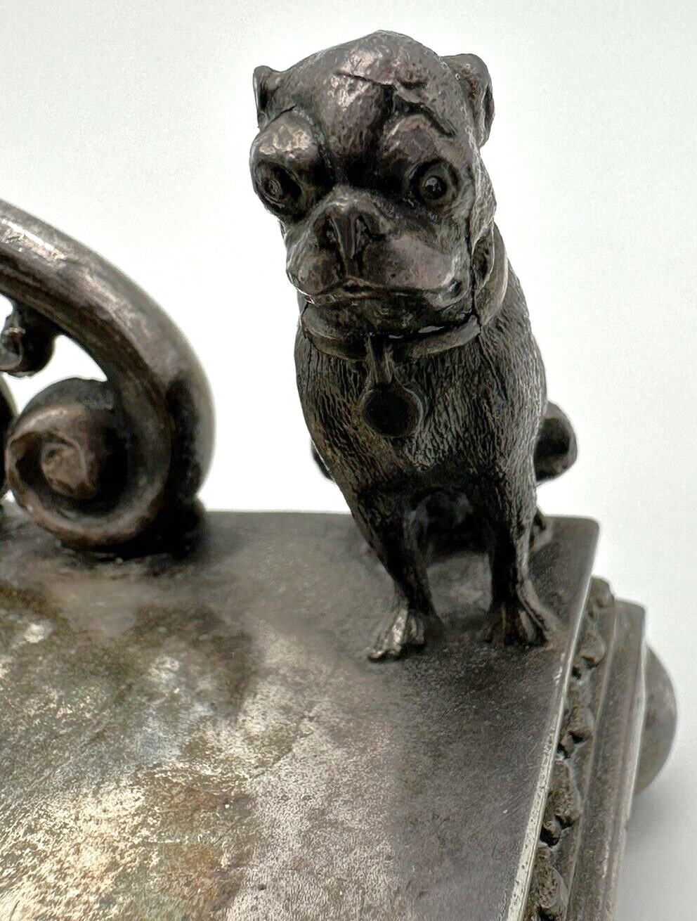 This silverplate inkstand from Reed & Barton features two pugs sitting on either side of an inkwell. The pen rack behind has two growling griffins at the top.