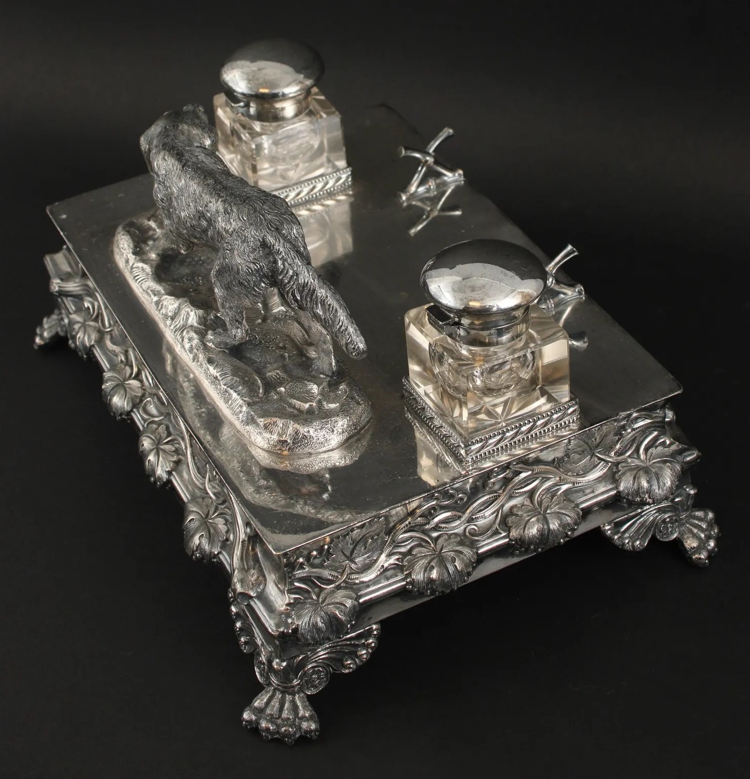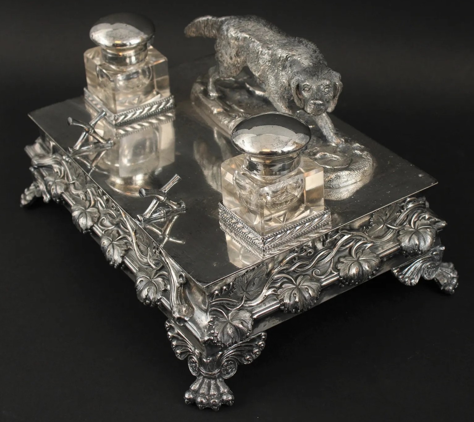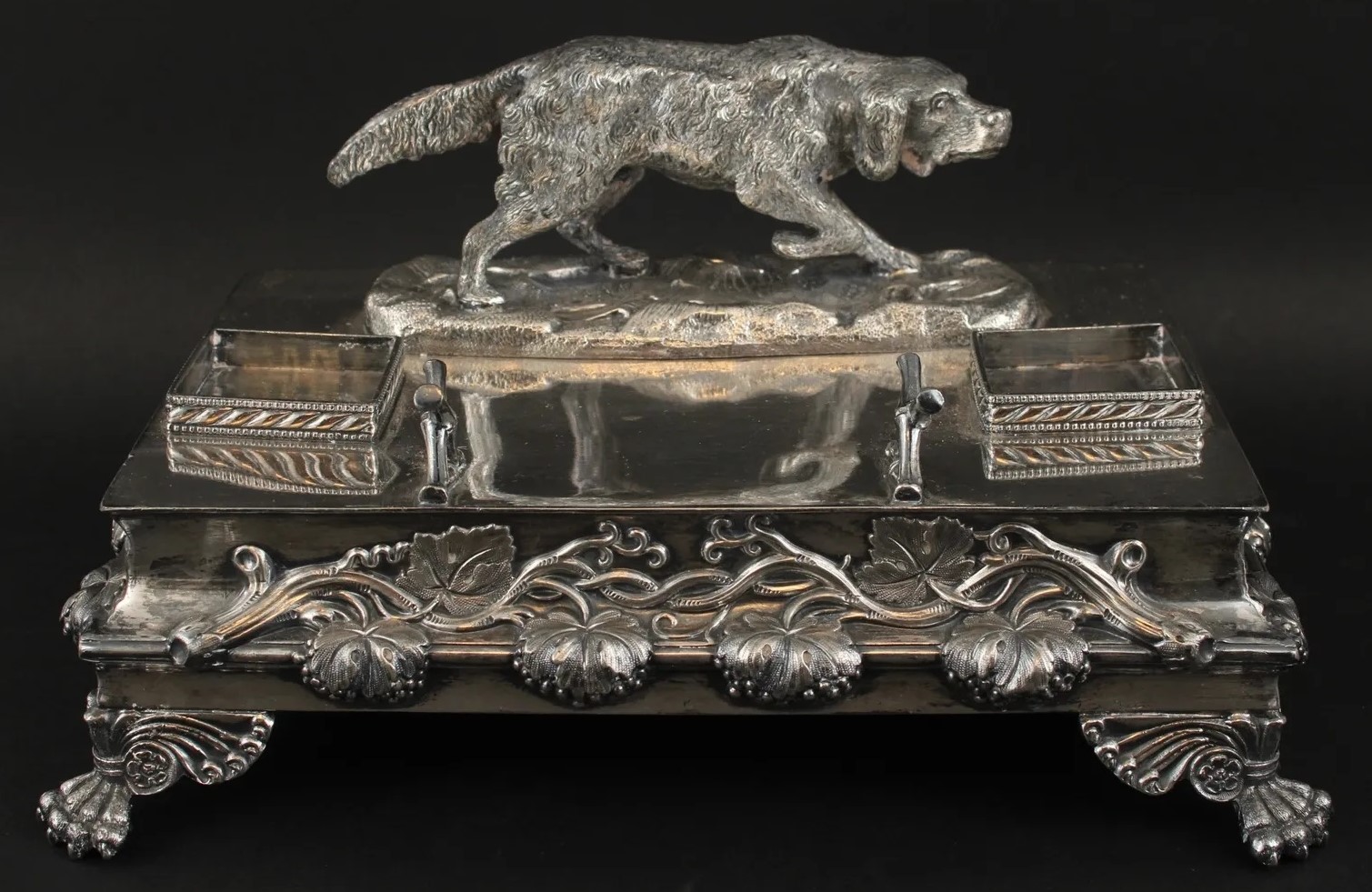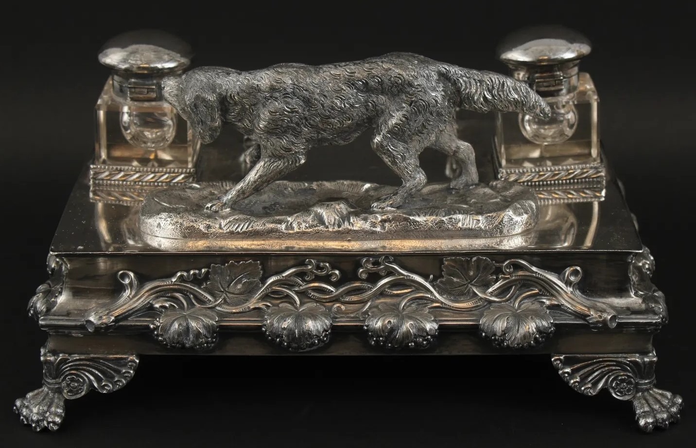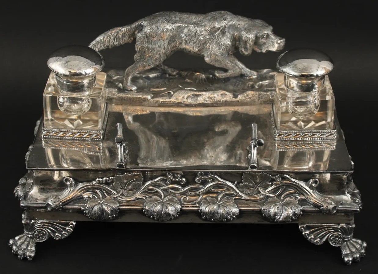 19th Century Sheffield plate inkstand with two cut glass inkwells flanking a sculpture of a retriever hunting dog. On each side is a 1 ¾” square cut-glass inkwells with a cut starburst pontil and Sheffield plate cover. On the bottom of the claw footed base are five hallmarks. Three of the hallmarks are “JD&S” for the Sheffield silversmiths James Deakin & Sons, followed by an “EP” hallmark for electroplate, and then shape number “M2351.” The dog sculpture is still mounted with the original 19th century handmade wingnuts and “Sheffield” marked washers. The base of the inkstand is ornately decorated with a branch and leaf motif. The pen holder is shaped like crossed twigs.