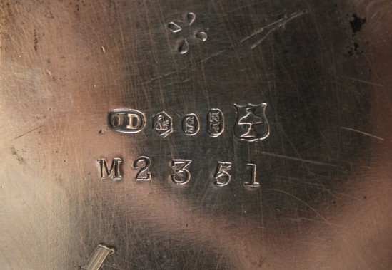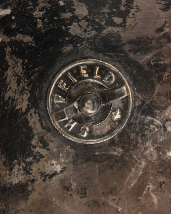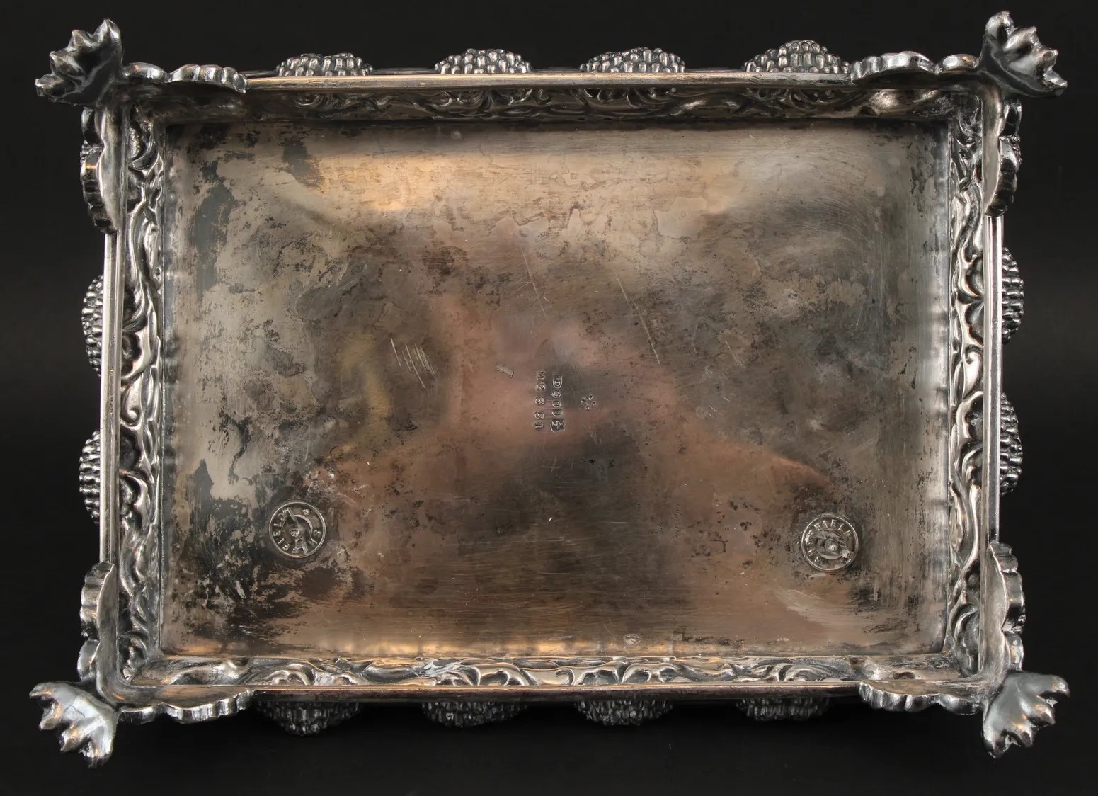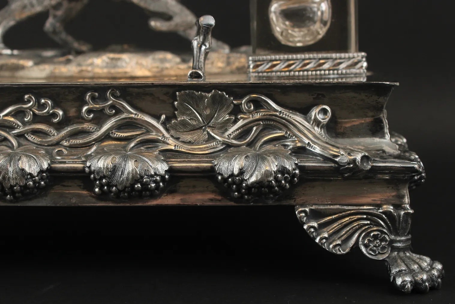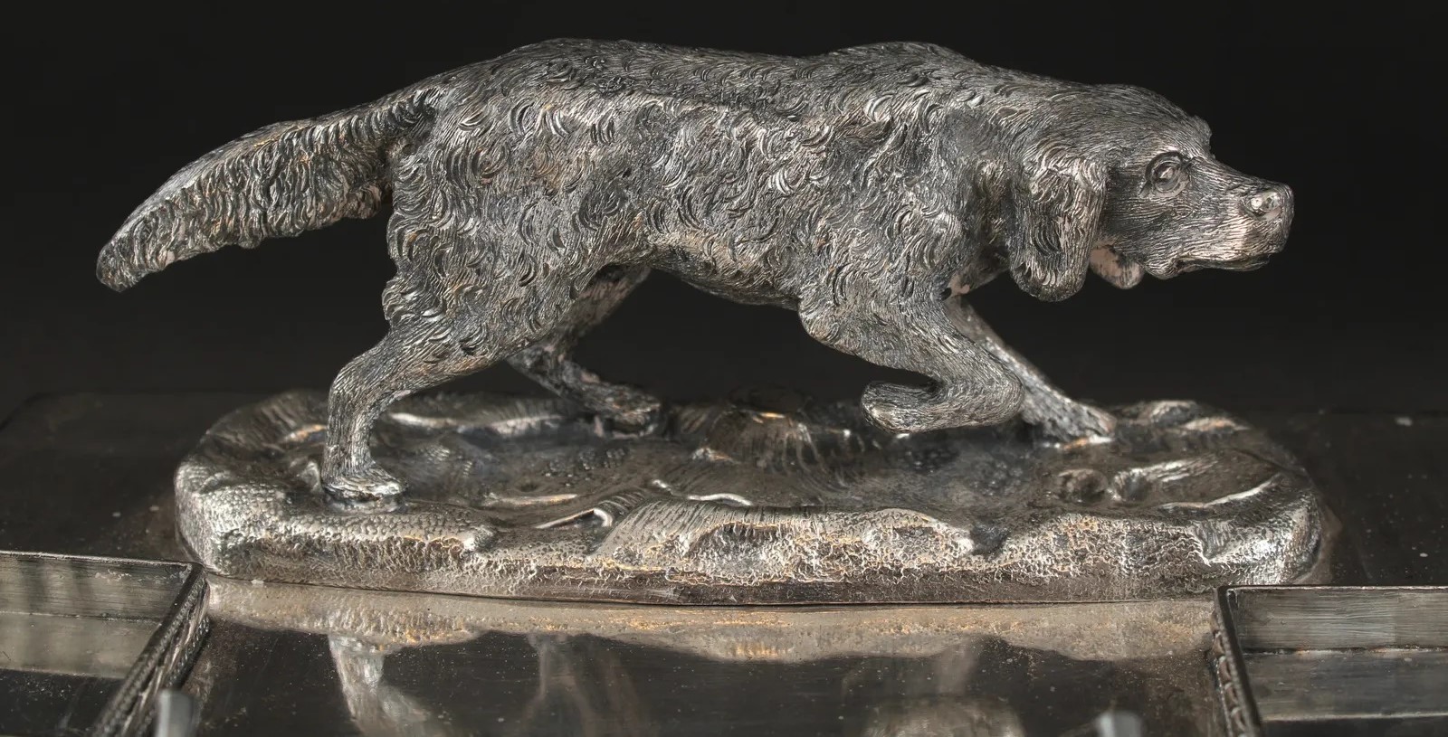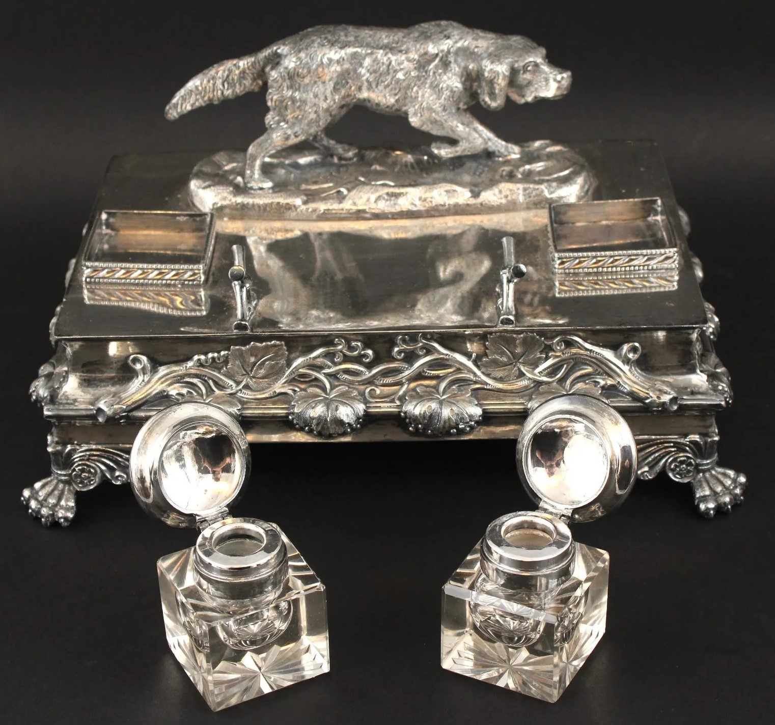 19th Century Sheffield plate inkstand with two cut glass inkwells flanking a sculpture of a retriever hunting dog. On each side is a 1 ¾” square cut-glass inkwells with a cut starburst pontil and Sheffield plate cover. On the bottom of the claw footed base are five hallmarks. Three of the hallmarks are “JD&S” for the Sheffield silversmiths James Deakin & Sons, followed by an “EP” hallmark for electroplate, and then shape number “M2351.” The dog sculpture is still mounted with the original 19th century handmade wingnuts and “Sheffield” marked washers. The base of the inkstand is ornately decorated with a branch and leaf motif. The pen holder is shaped like crossed twigs.