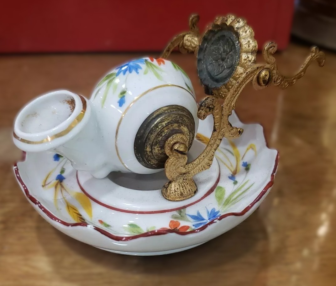 Revolving inkstands like this are more commonly referred to as a “snail” inkwell because the reservoir looks like a snail’s shell. This inkstand features a porcelain ink reservoir (snail) on a porcelain saucer base with floral decorations and a scalloped edge. A brass bracket attached to the saucer has a stopper plate and pen rack.