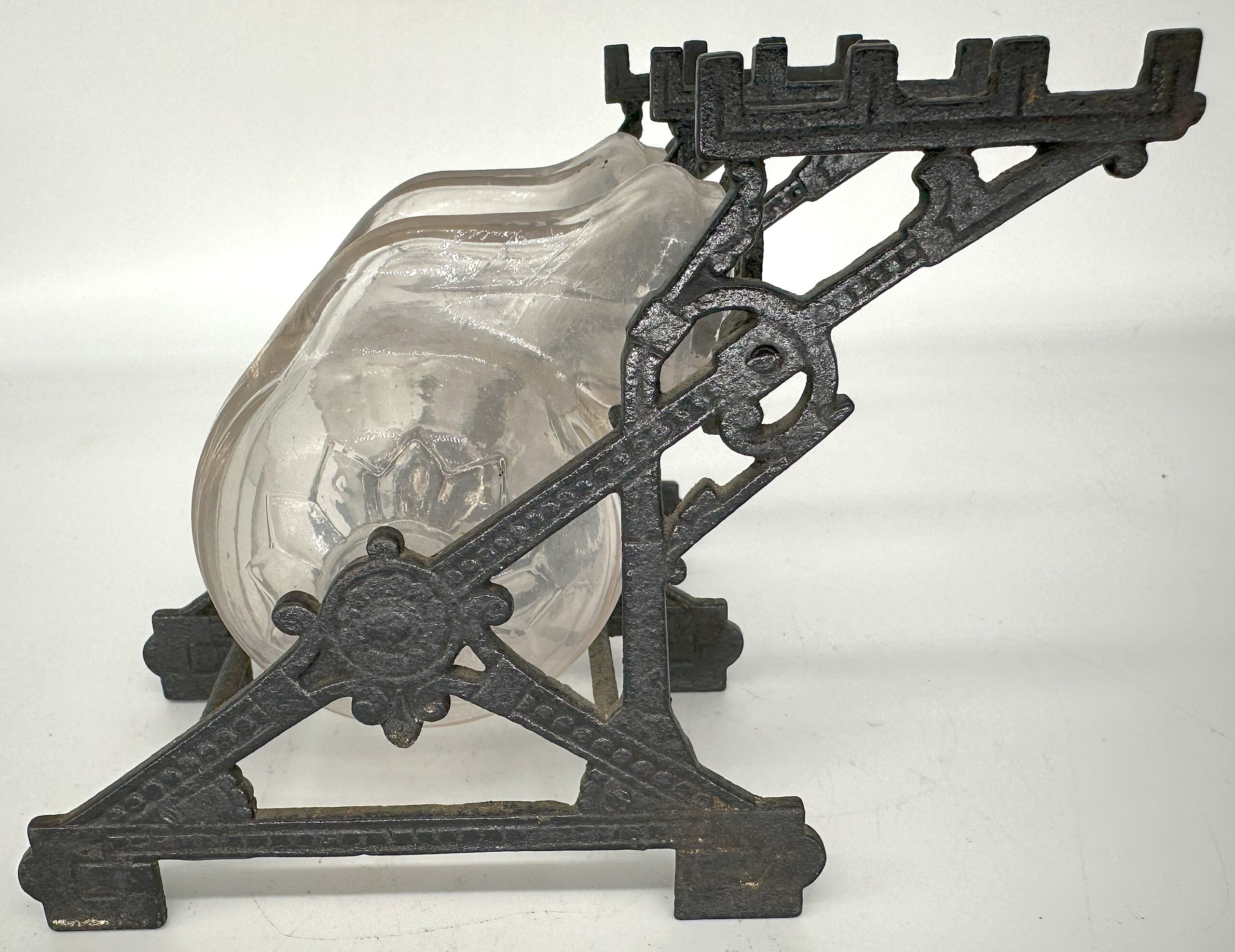 Revolving inkwells such as these pictured are usually referred to as “snails” by collectors because the inkwells have the appearance of snail shells. The main body section is made of cast iron. The sides are incised with a decorative geometric design. The glass “snail” is on a pivot and swings forward at the touch of a finger. When not in use, the trumpet-shaped end closes around a stopple plate (round metal cast disc) which stops the ink from evaporating or spilling. A raised three-station pen rack is built into the base.