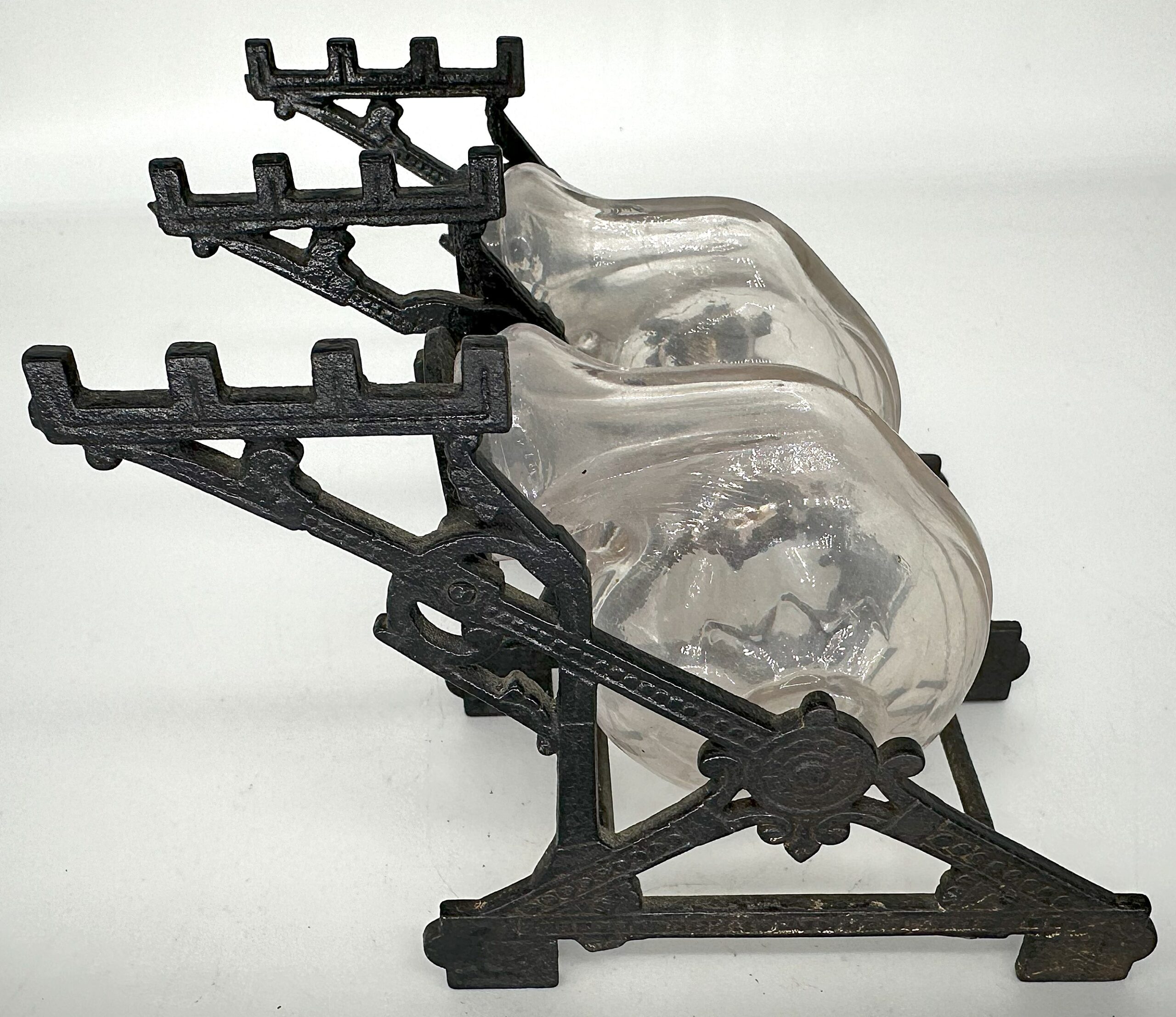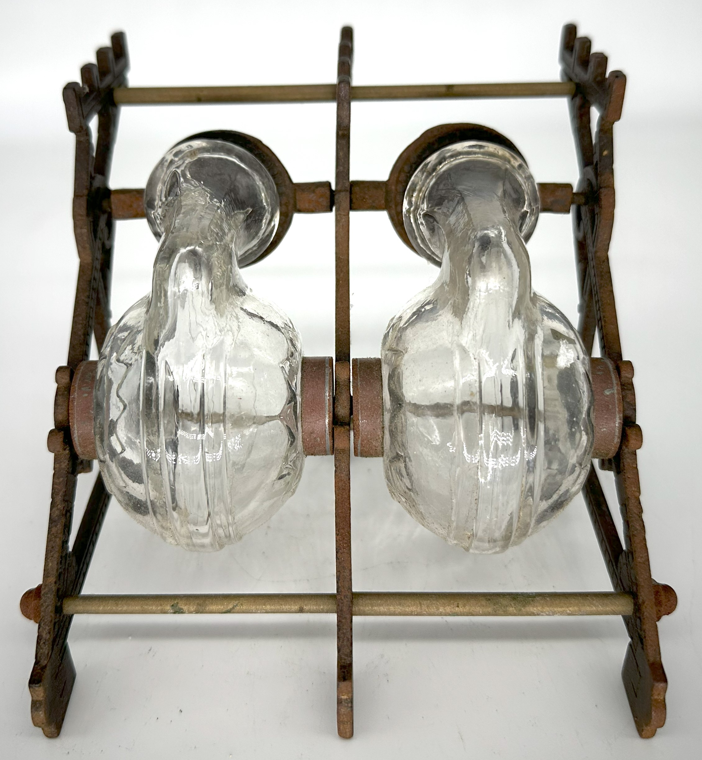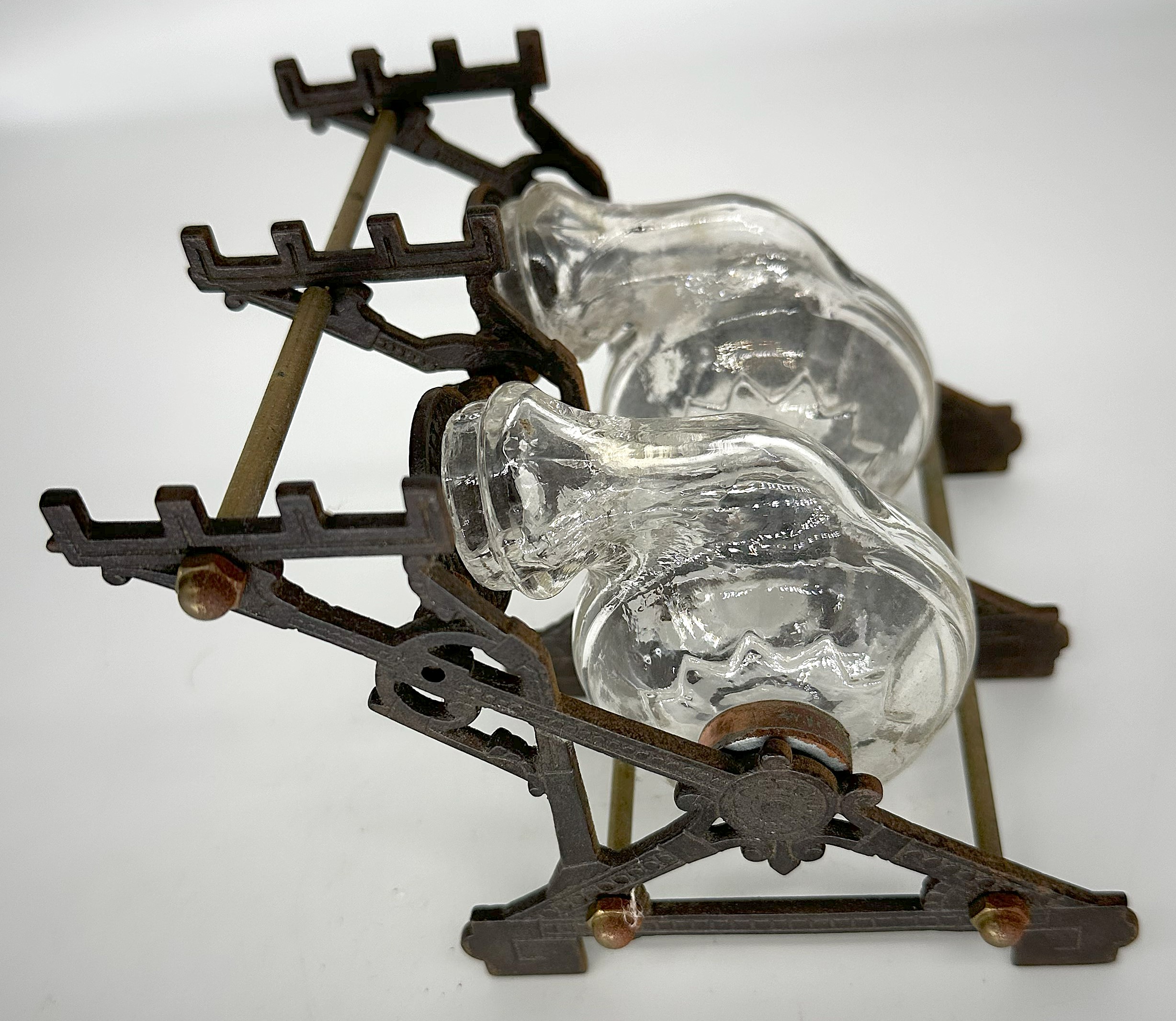 Three examples are pictured – two “double snails” and a “single snail”. All have the same cast iron frame, stopple plates, and castellated pen holder. These inkstands come from the same manufacturer (Peck, Stow & Wilcox). The two “double” inkstands are constructed differently. As originally manufactured, this inkstand, the revolving “Star” bottle, was made by Peck, Stow, and Wilcox, Southington, CT. You can view it in their catalog (#280) of November 1870. It has rubber friction caps on the coaxial pins to rotate the “snail” bottle into position.