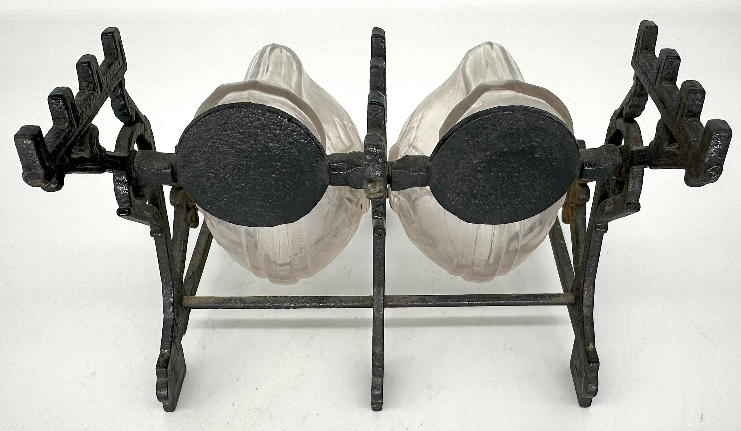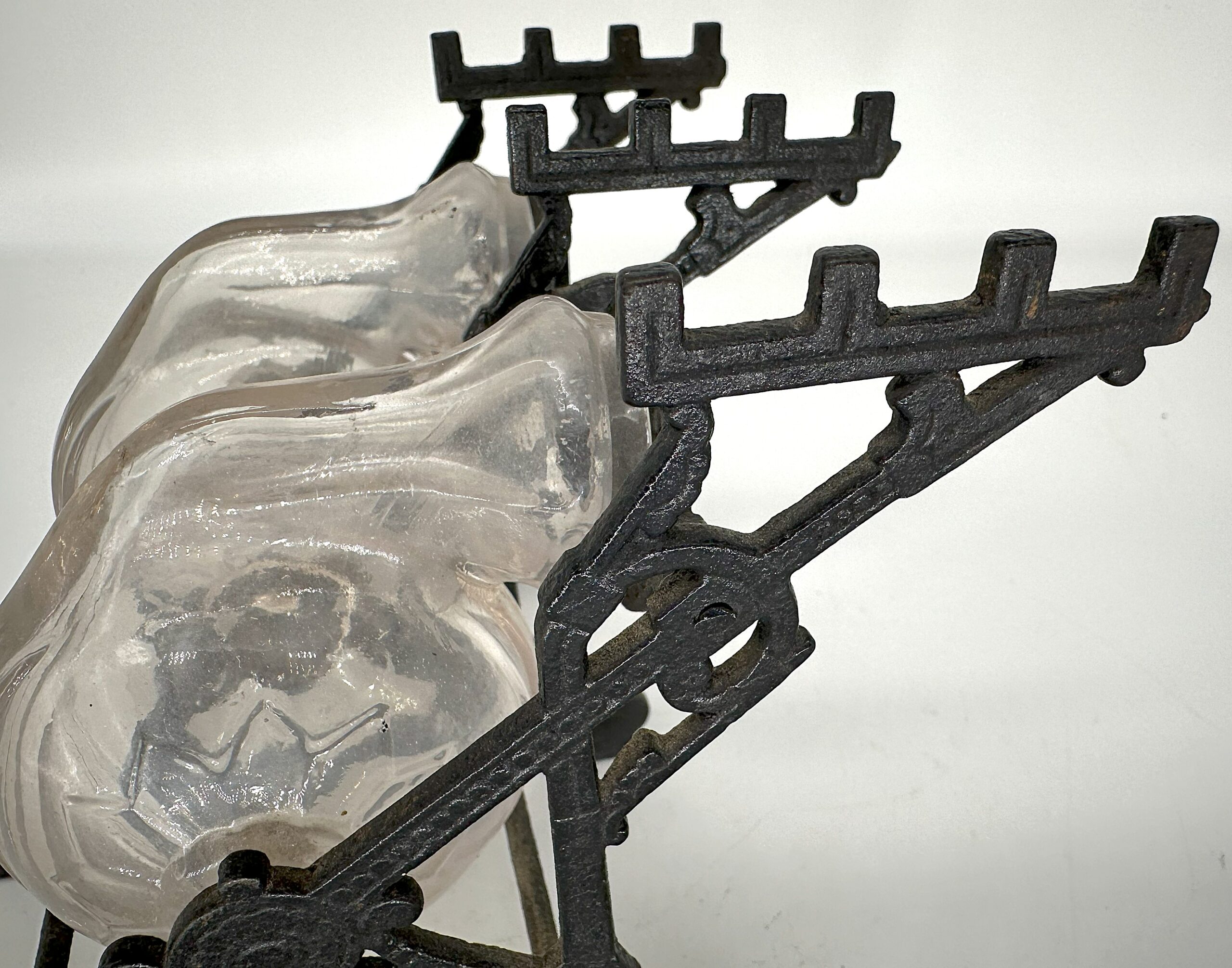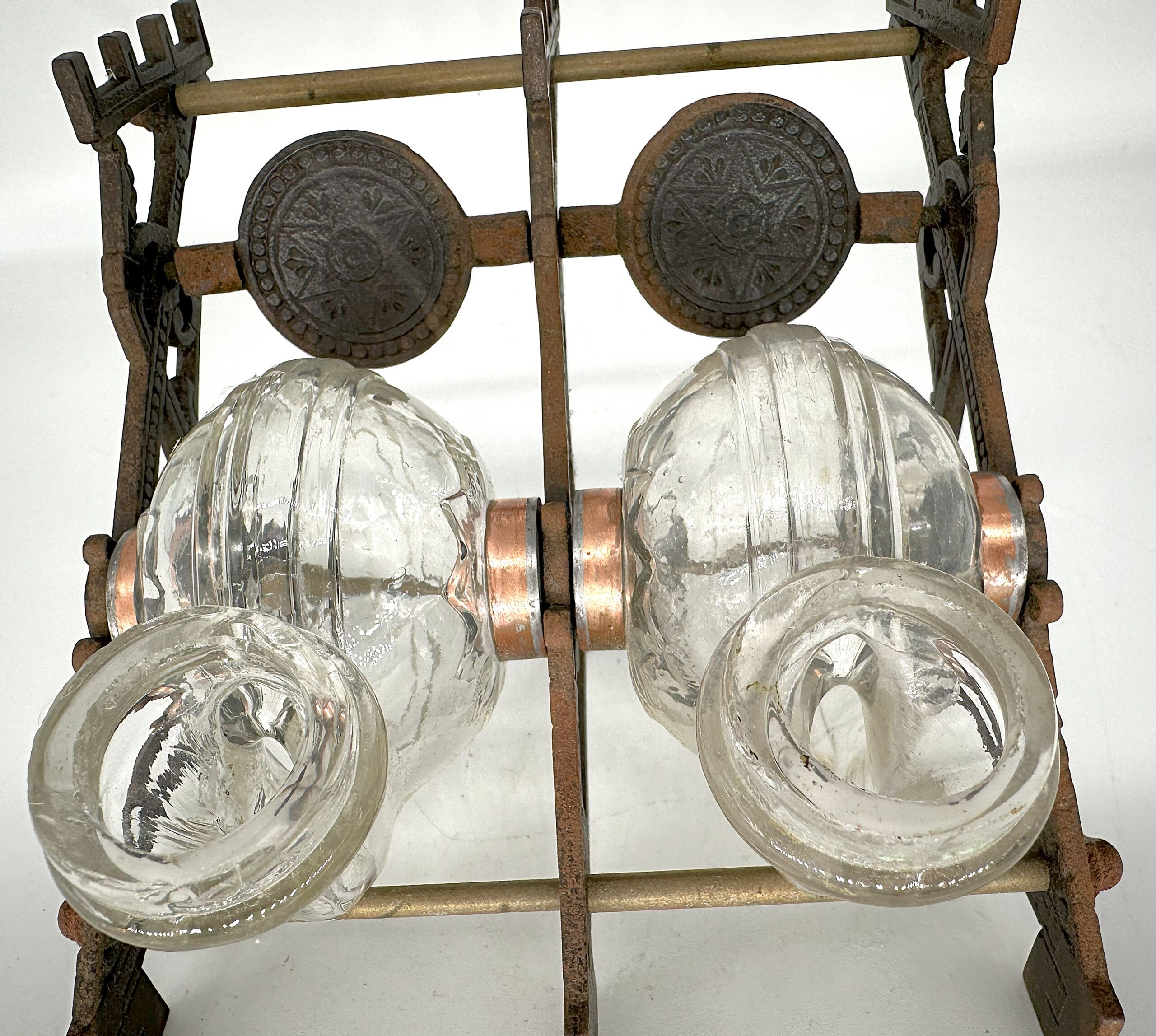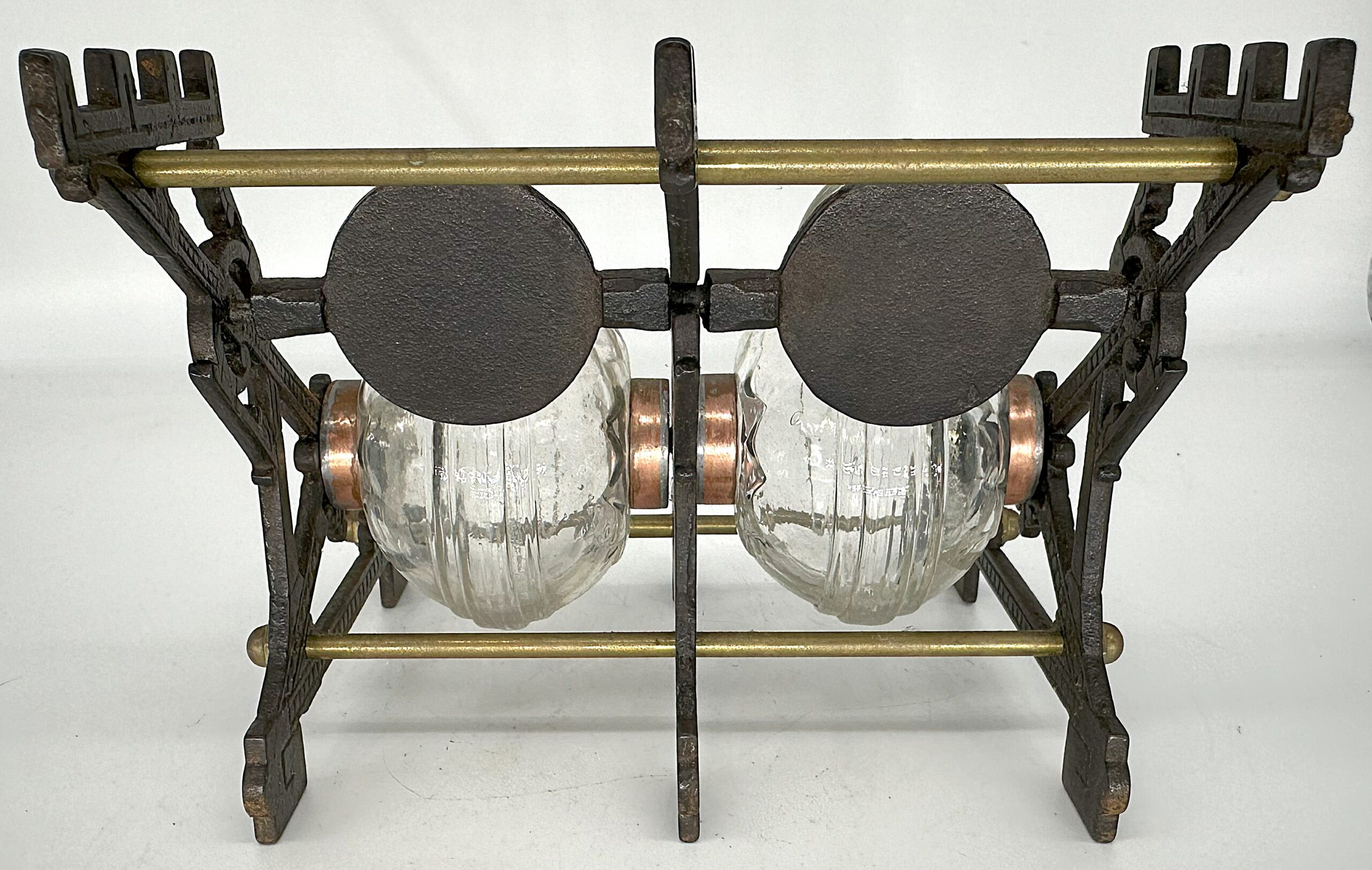 Three examples are pictured – two “double snails” and a “single snail”. All have the same cast iron frame, stopple plates, and castellated pen holder. These inkstands come from the same manufacturer (Peck, Stow & Wilcox). The two “double” inkstands are constructed differently. As originally manufactured, this inkstand, the revolving “Star” bottle, was made by Peck, Stow, and Wilcox, Southington, CT. You can view it in their catalog (#280) of November 1870. It has rubber friction caps on the coaxial pins to rotate the “snail” bottle into position.