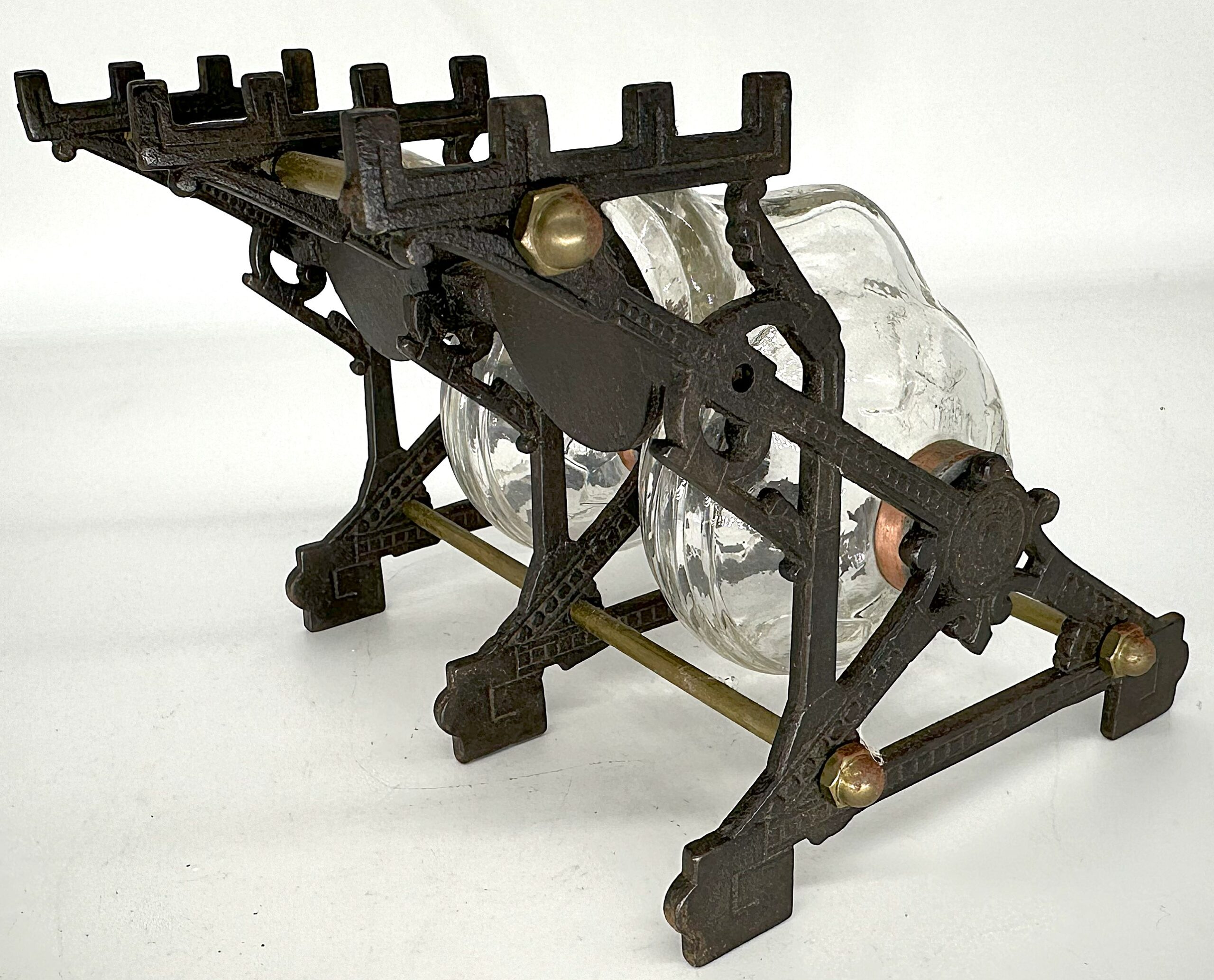 The second example has three brass connecting rods tightened with bolts on the outside. Its pivoting mechanism (made of copper) differs. It also has copper lids (marked “EPC”) to place on the trumpet-shaped openings – an alternative to pushing the glass snail to its closed position. We believe the copper components of the second example were added by its user. It is not unusual for a user to add / improve components as needed to a mechanical inkstand, particularly a user in a machine shop with access to the necessary resources.