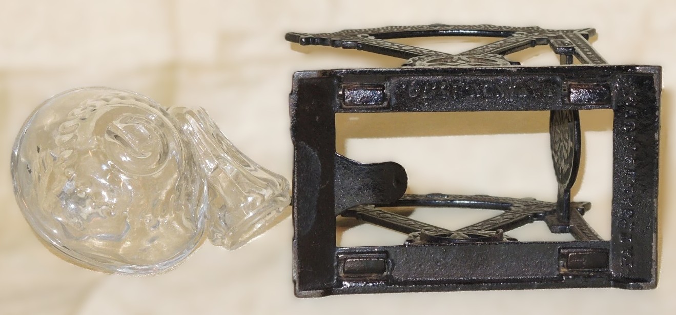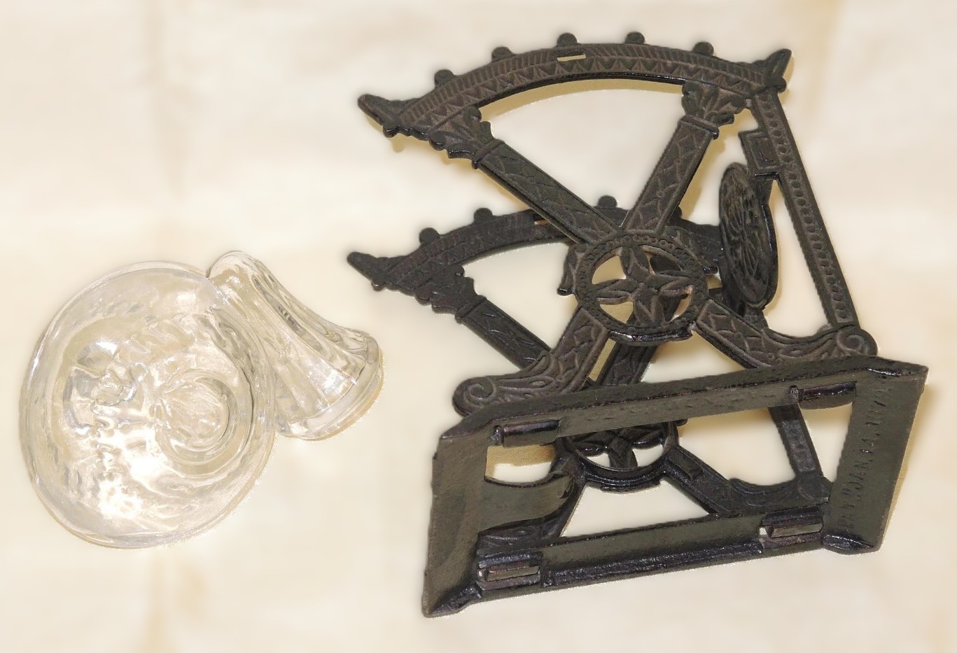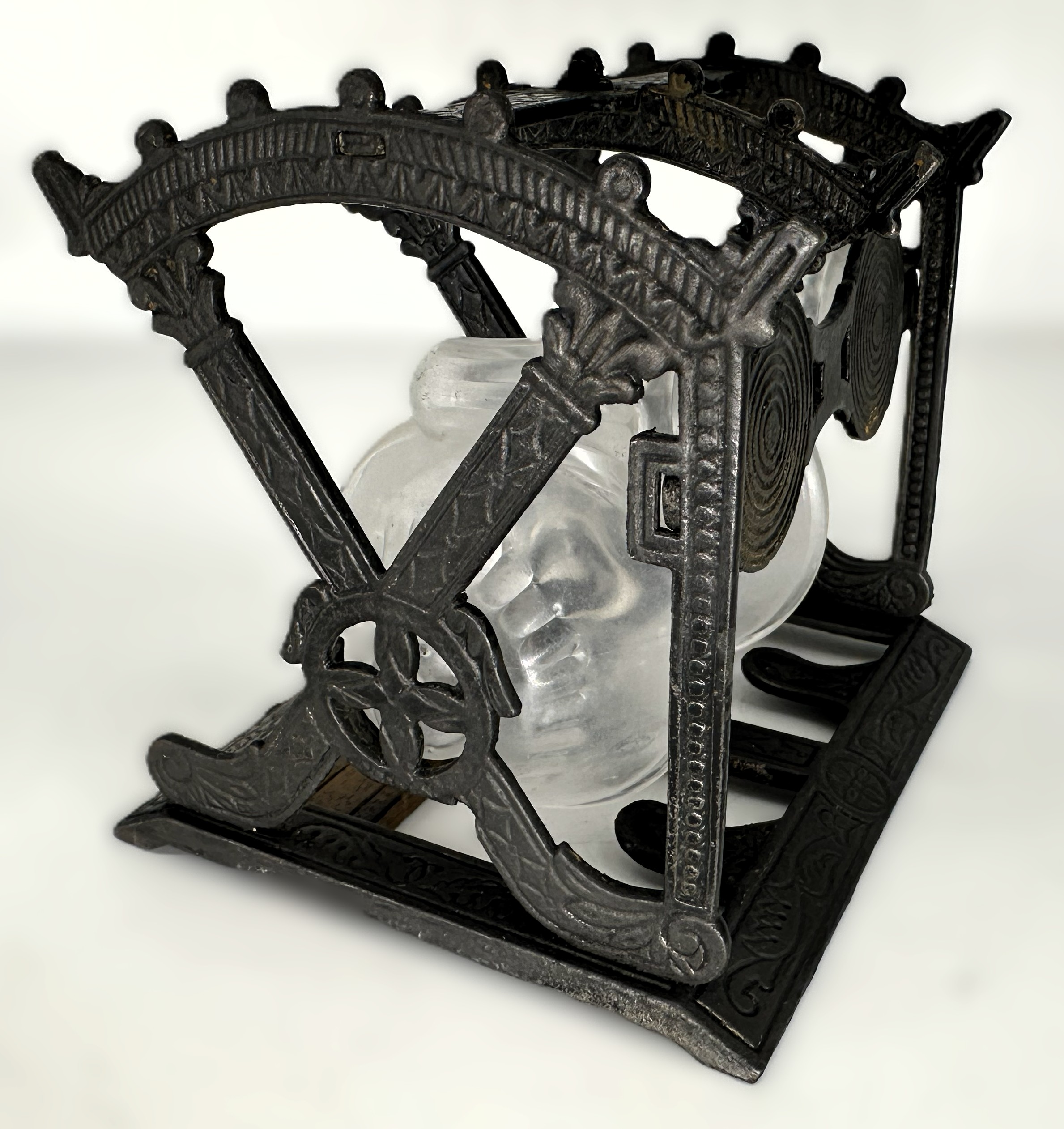 - Revolving Mechanism: The wells are suspended between the ornate cast-iron uprights. By gently pushing the glass, the wells rotate, allowing the user to seal the openings by turning them toward the back of the frame when not in use, which prevented the ink from evaporating or collecting dust.