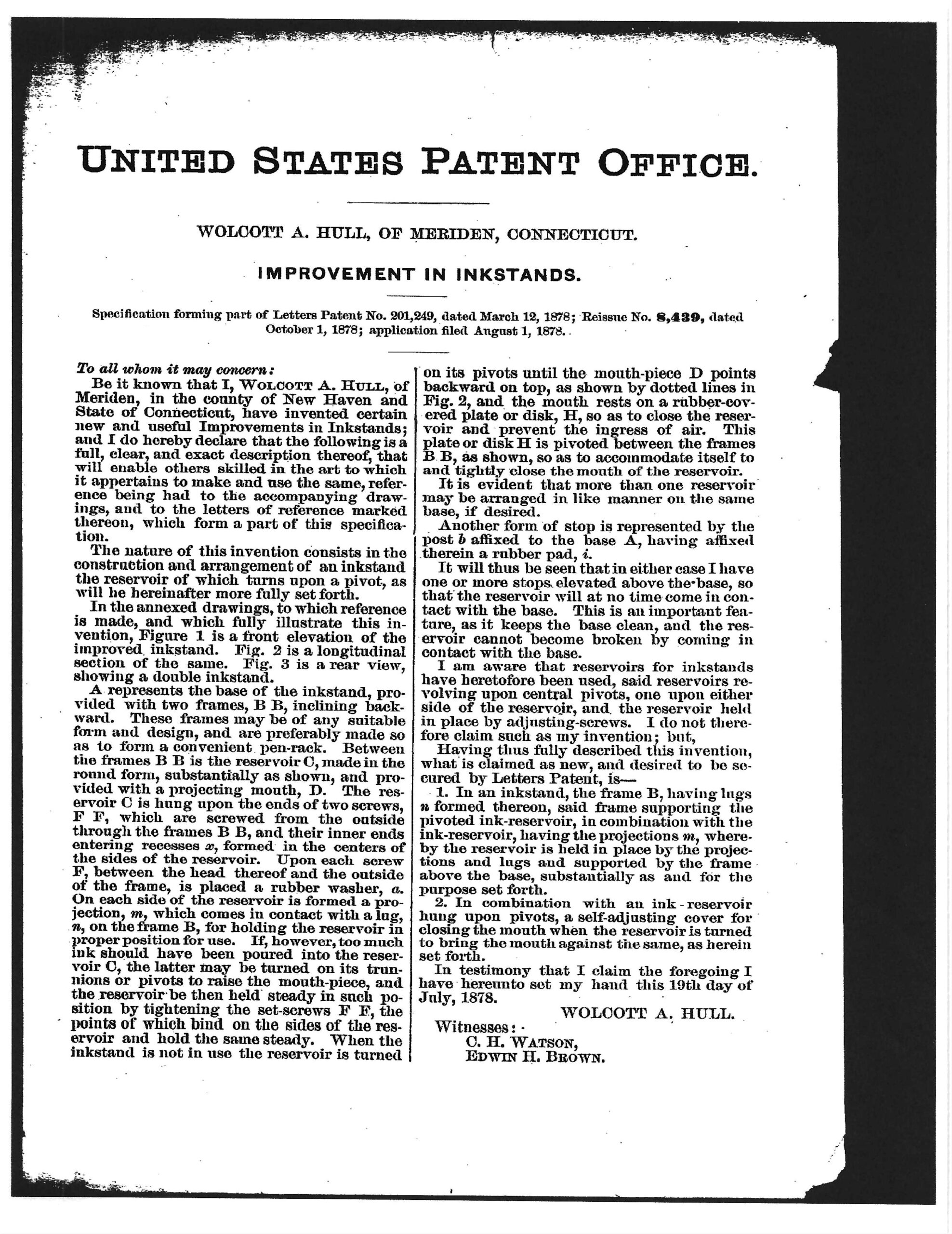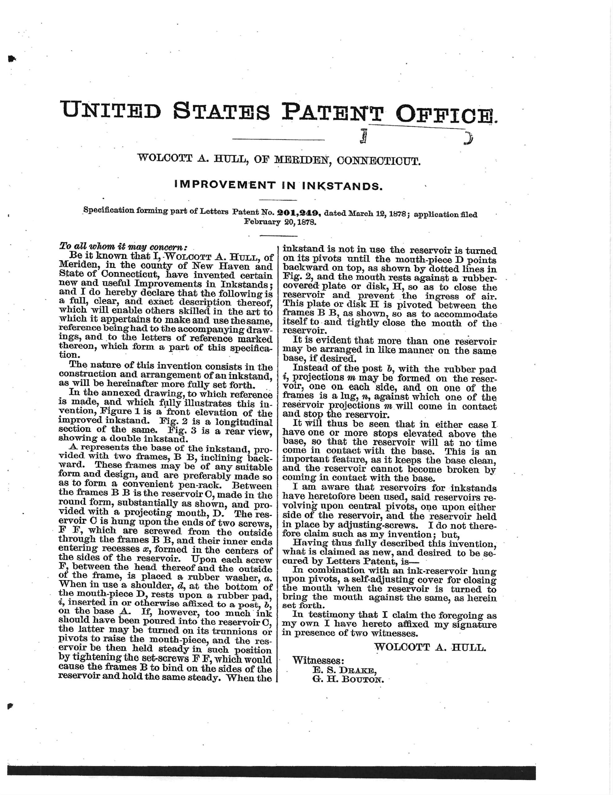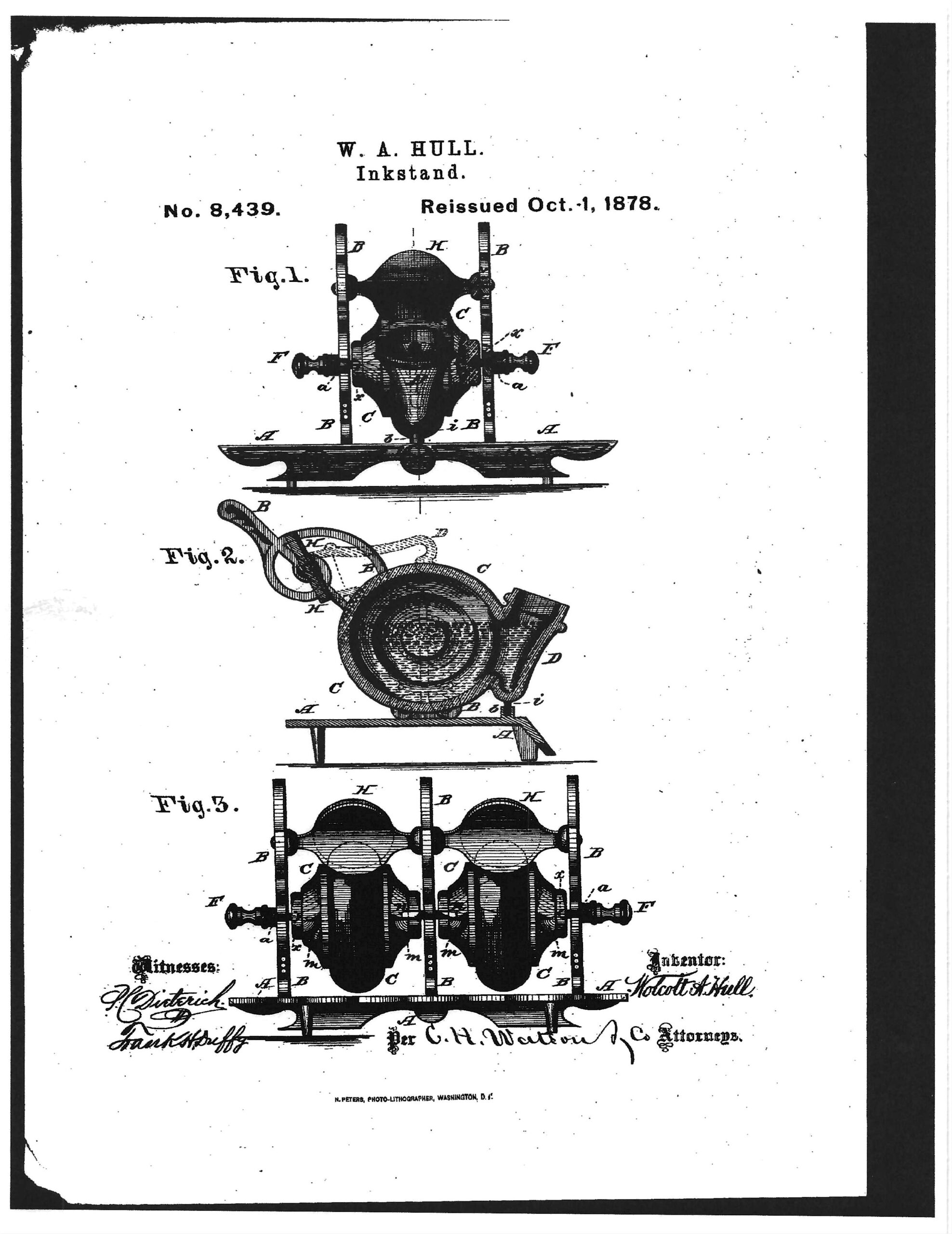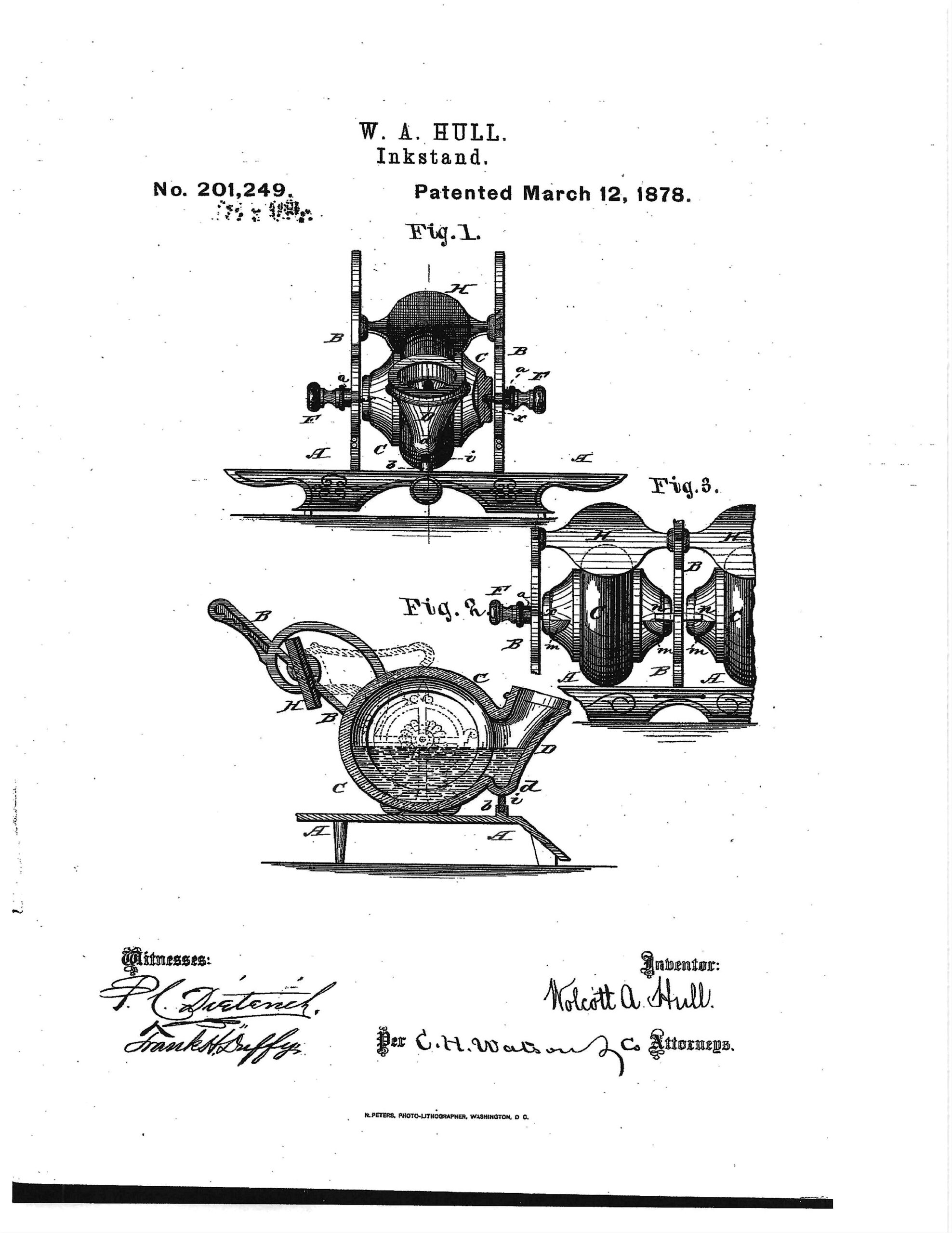Patents were granted to Wolcott A. Hull which was the “blueprint” for the double snail design and the engineering that made his inkstand so functional.