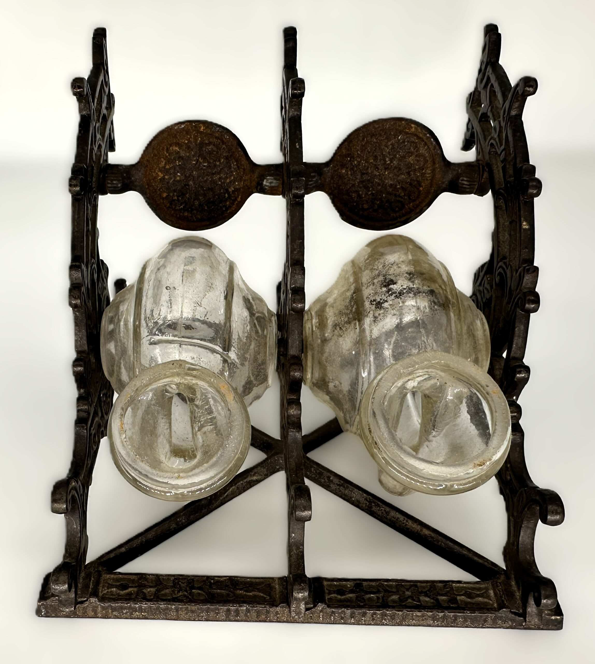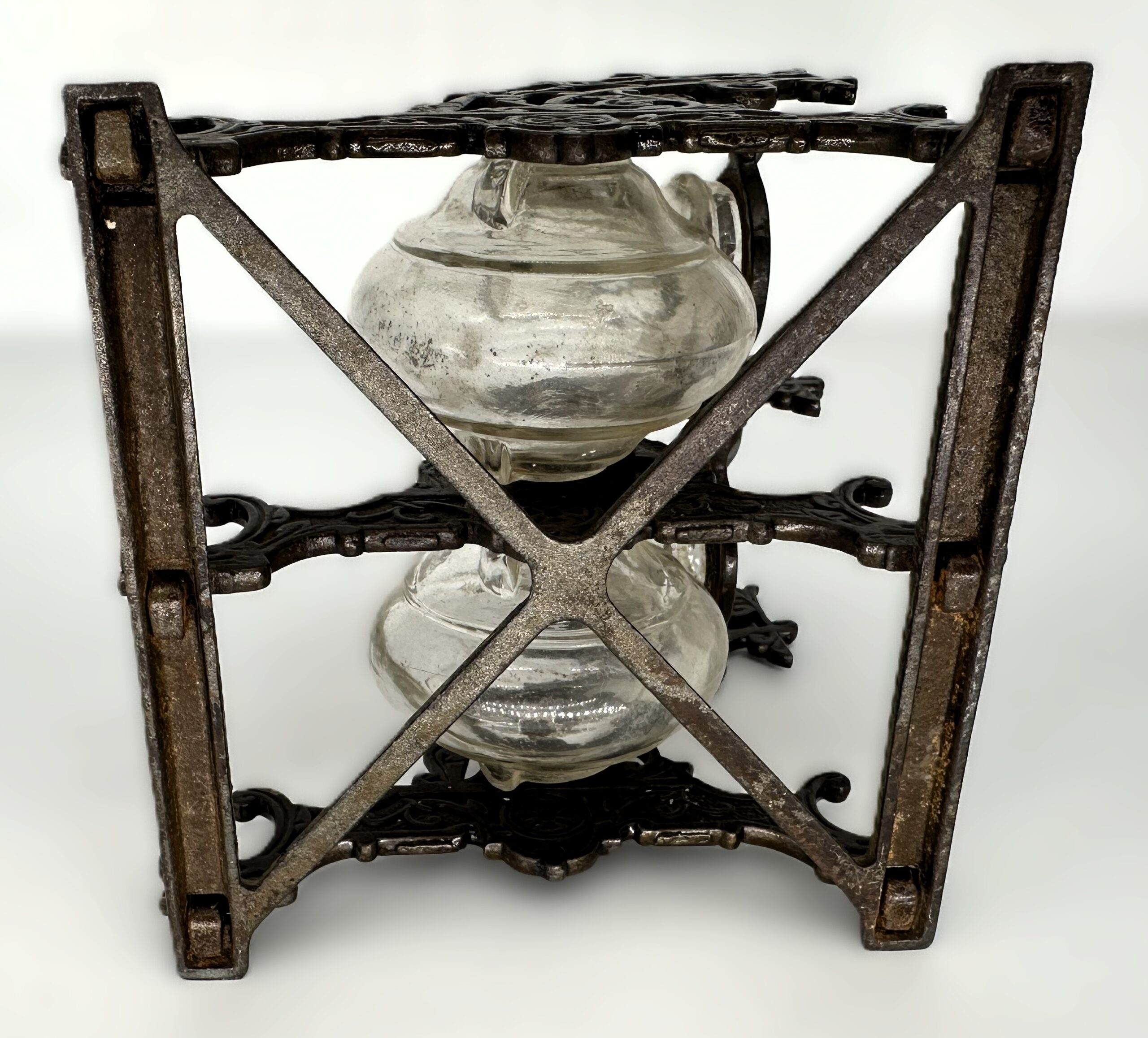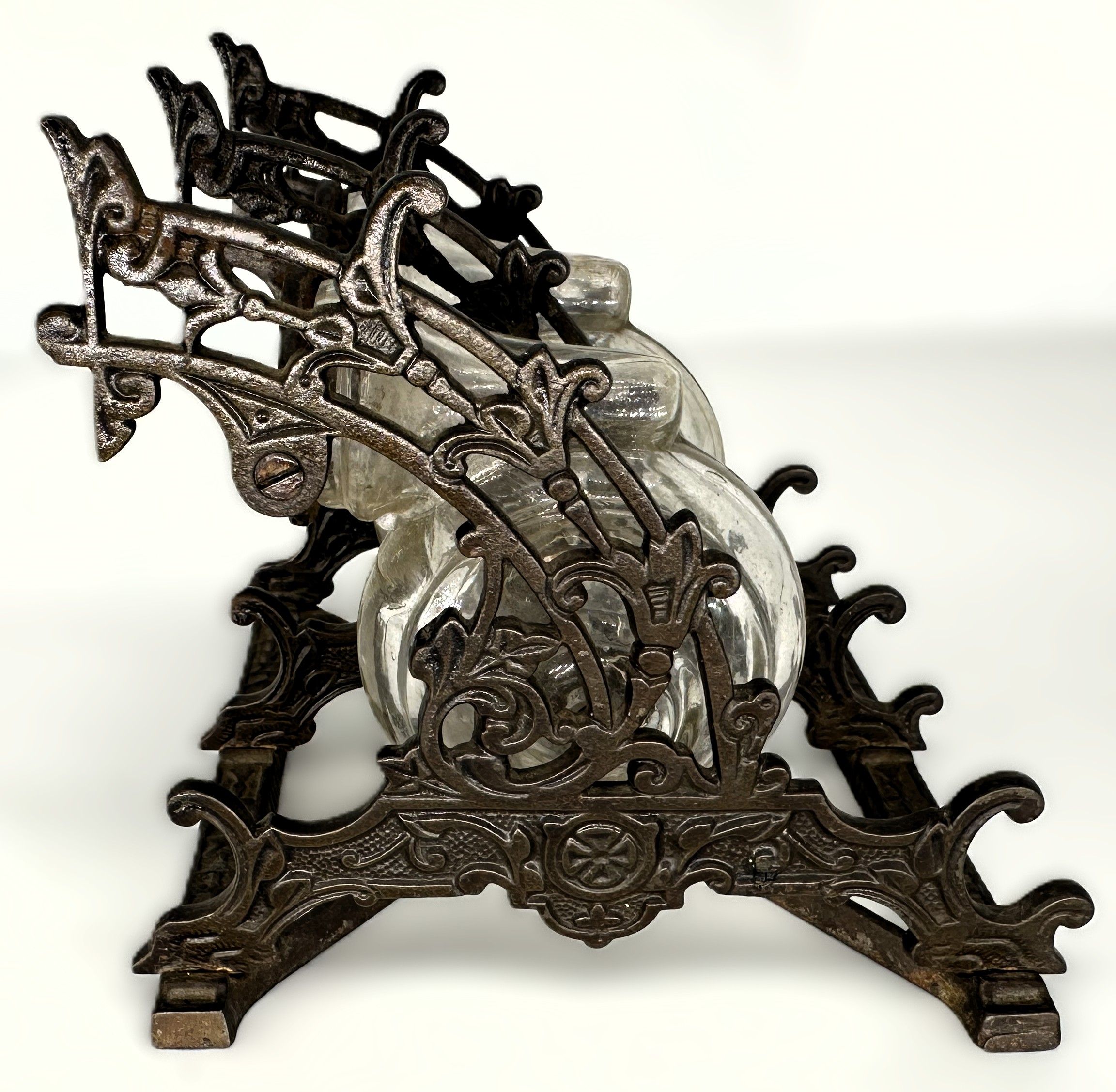 - The Revolving Action: The glass font is mounted onto the cast iron frame via two pivot points (screws or knobs) on its sides. This allows the bottle to rotate 180 degrees within the frame.