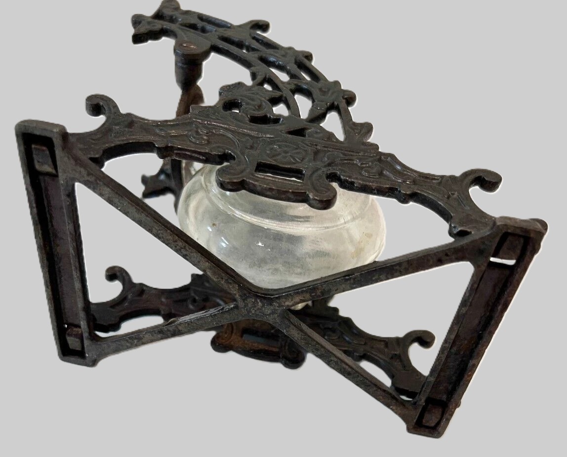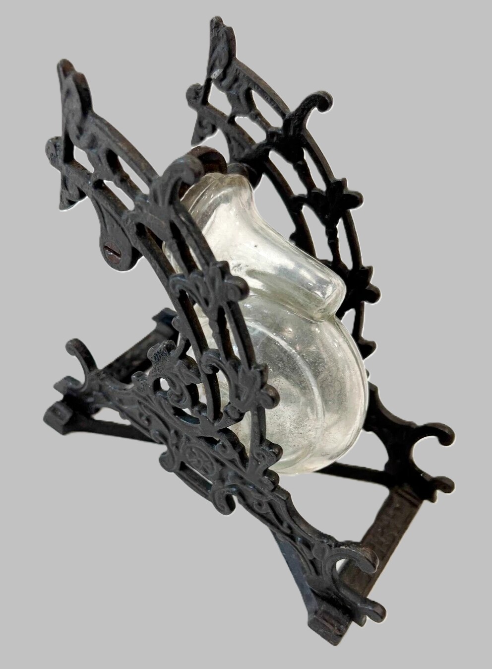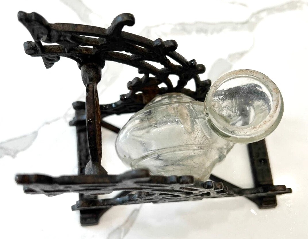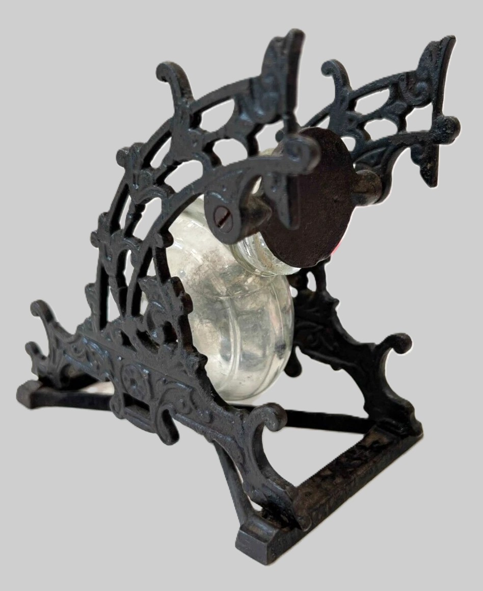 - Closing (The Seal): Integrated into the back of the cast iron frame is a stationary, flat metal disc called a “stopple plate”. When the inkwell is rotated back away from the user, the mouth of the glass snail seats firmly against this disc. This creates an airtight seal that prevents the ink from evaporating or drying out when not in use.