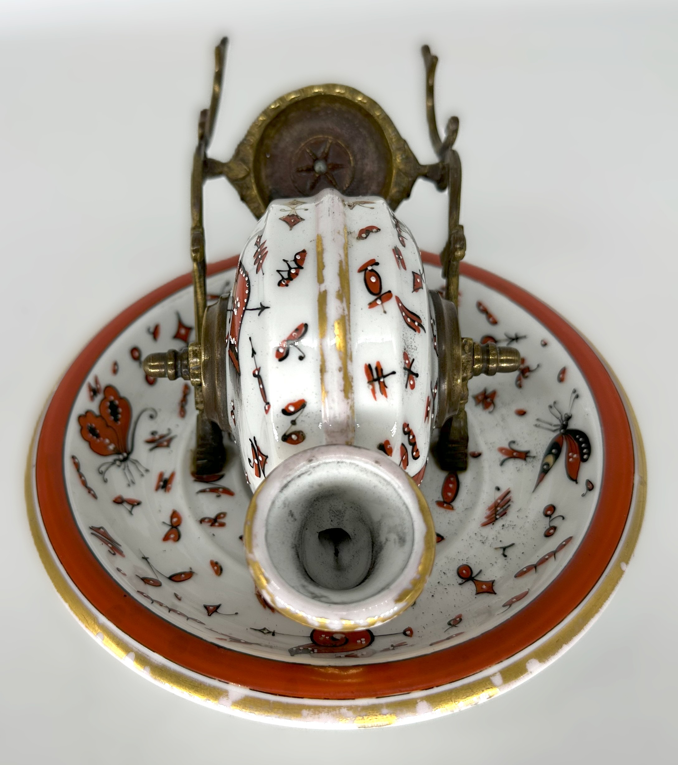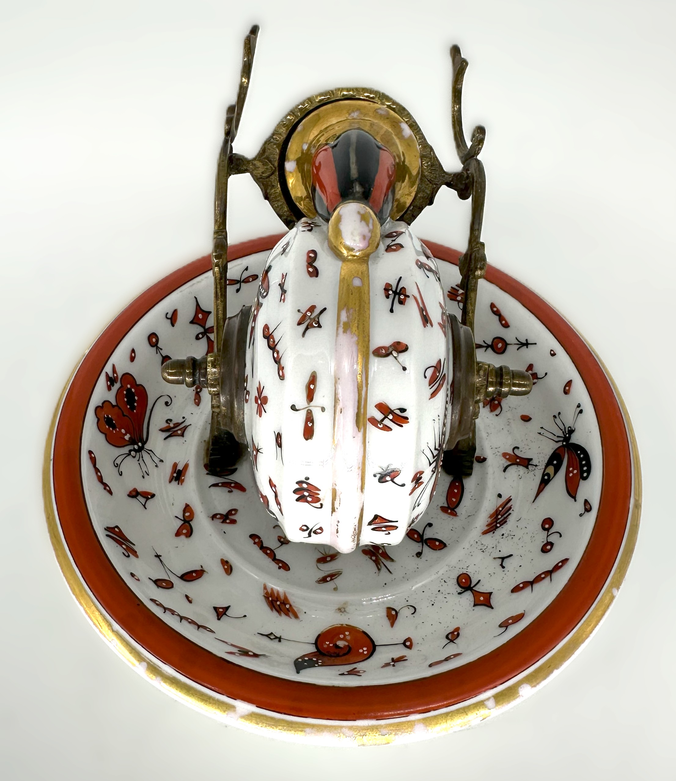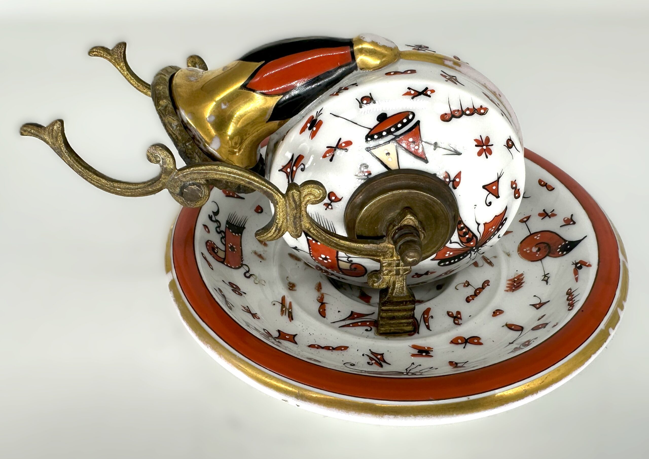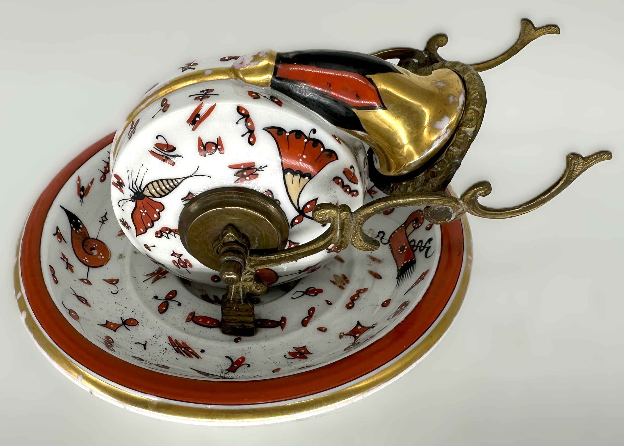 • Porcelain Snail Reservoir: Shaped like a stylized snail shell, the reservoir is decorated with hand-painted insects, butterflies, and abstract floral motifs in red, black, and gold on a white ground.