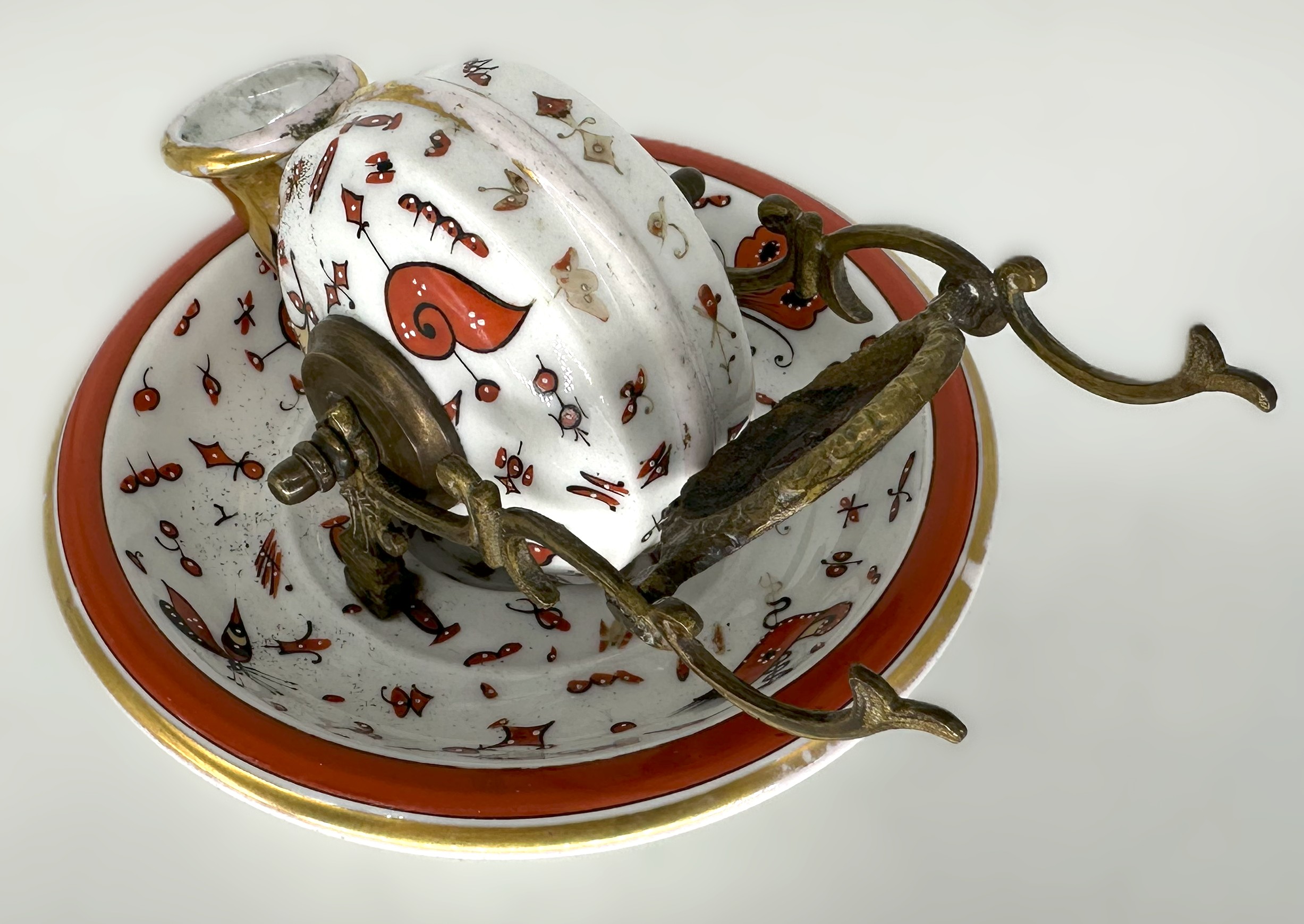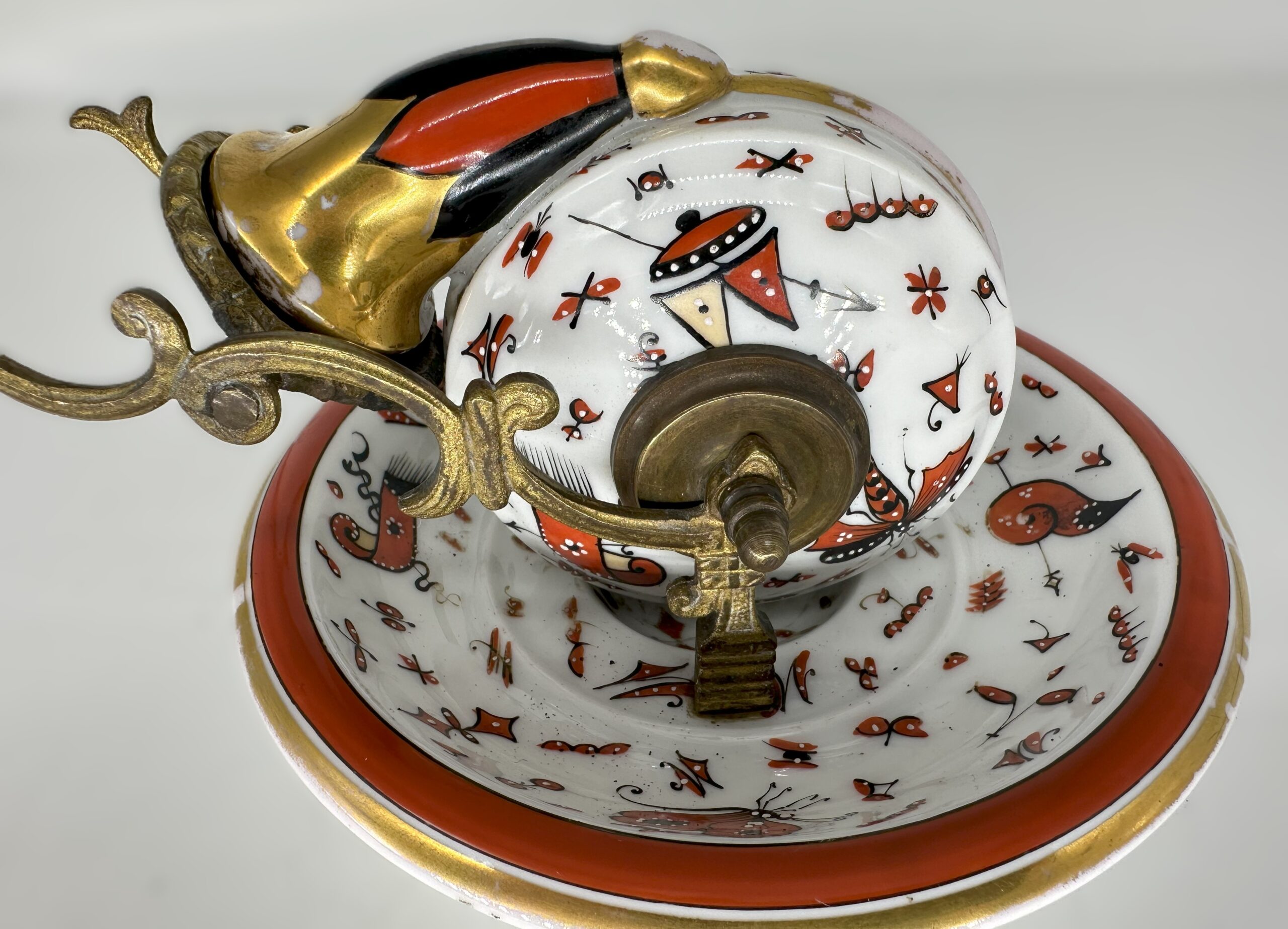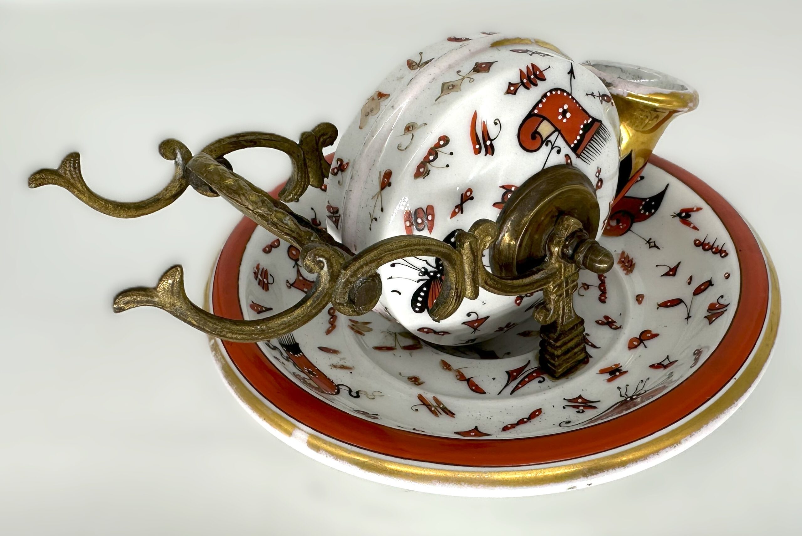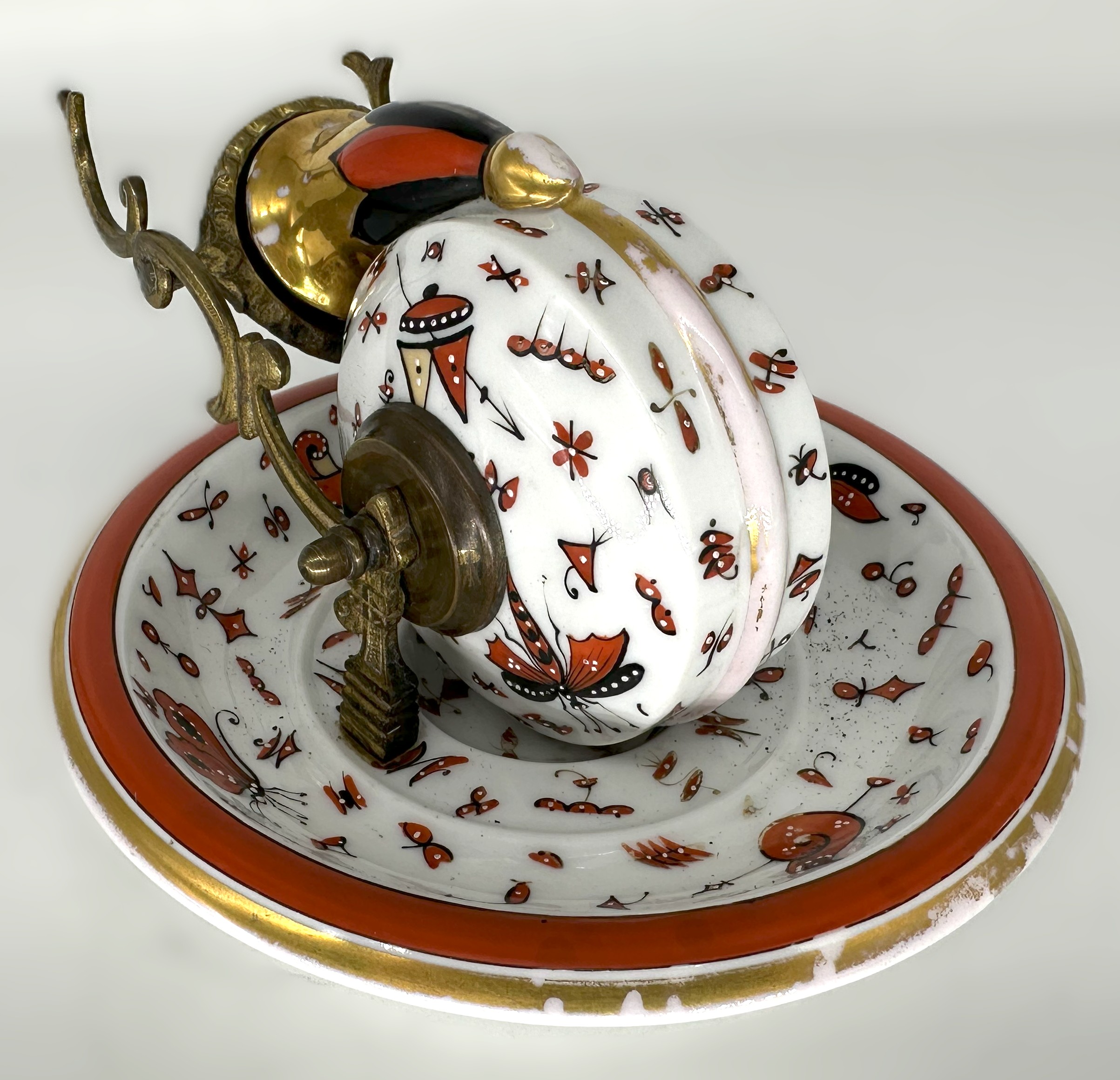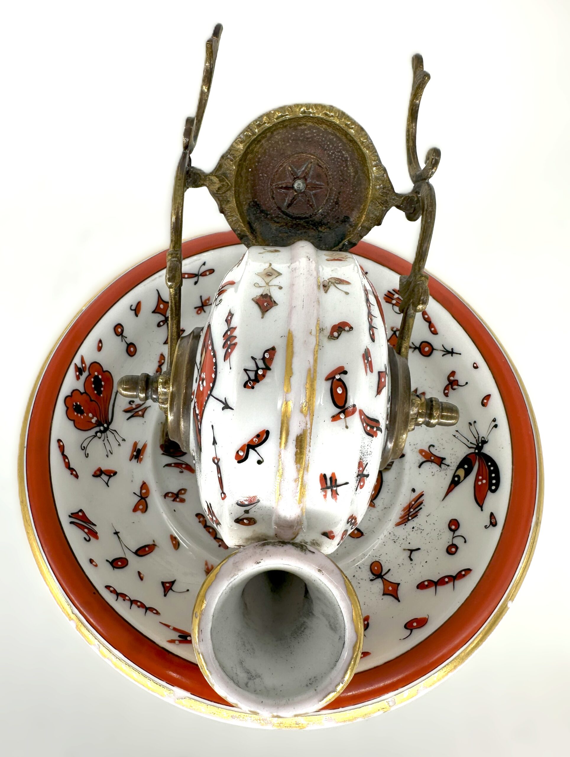 • Porcelain Snail Reservoir: Shaped like a stylized snail shell, the reservoir is decorated with hand-painted insects, butterflies, and abstract floral motifs in red, black, and gold on a white ground.