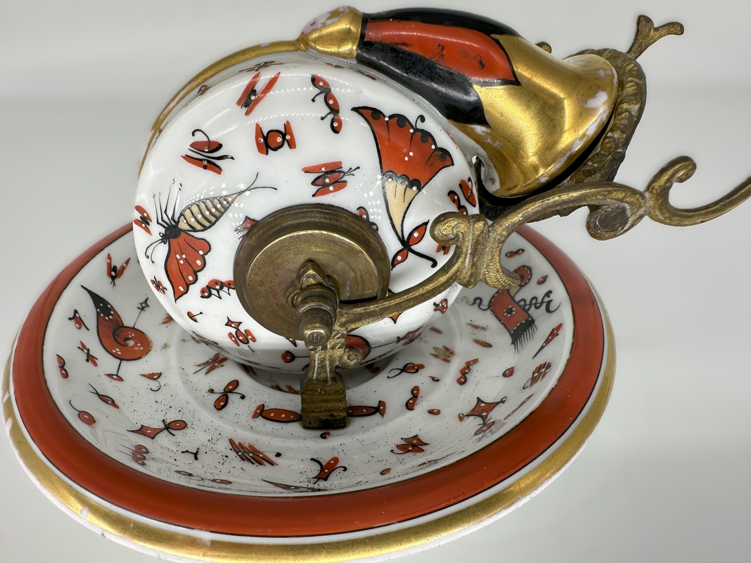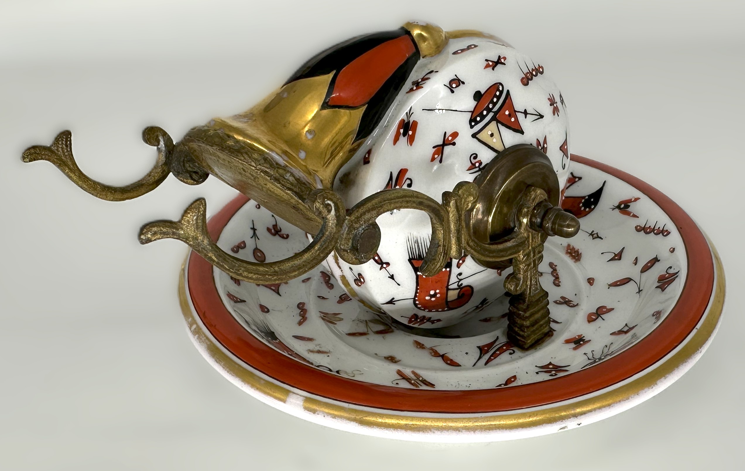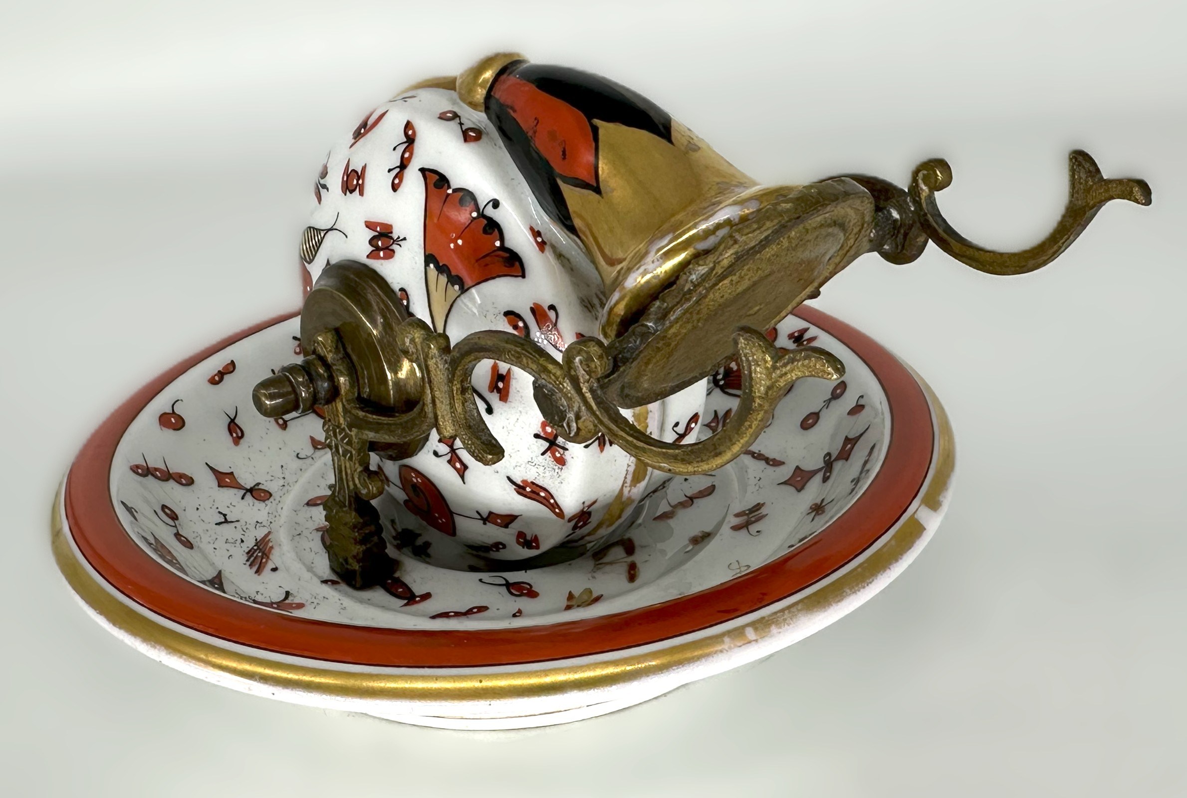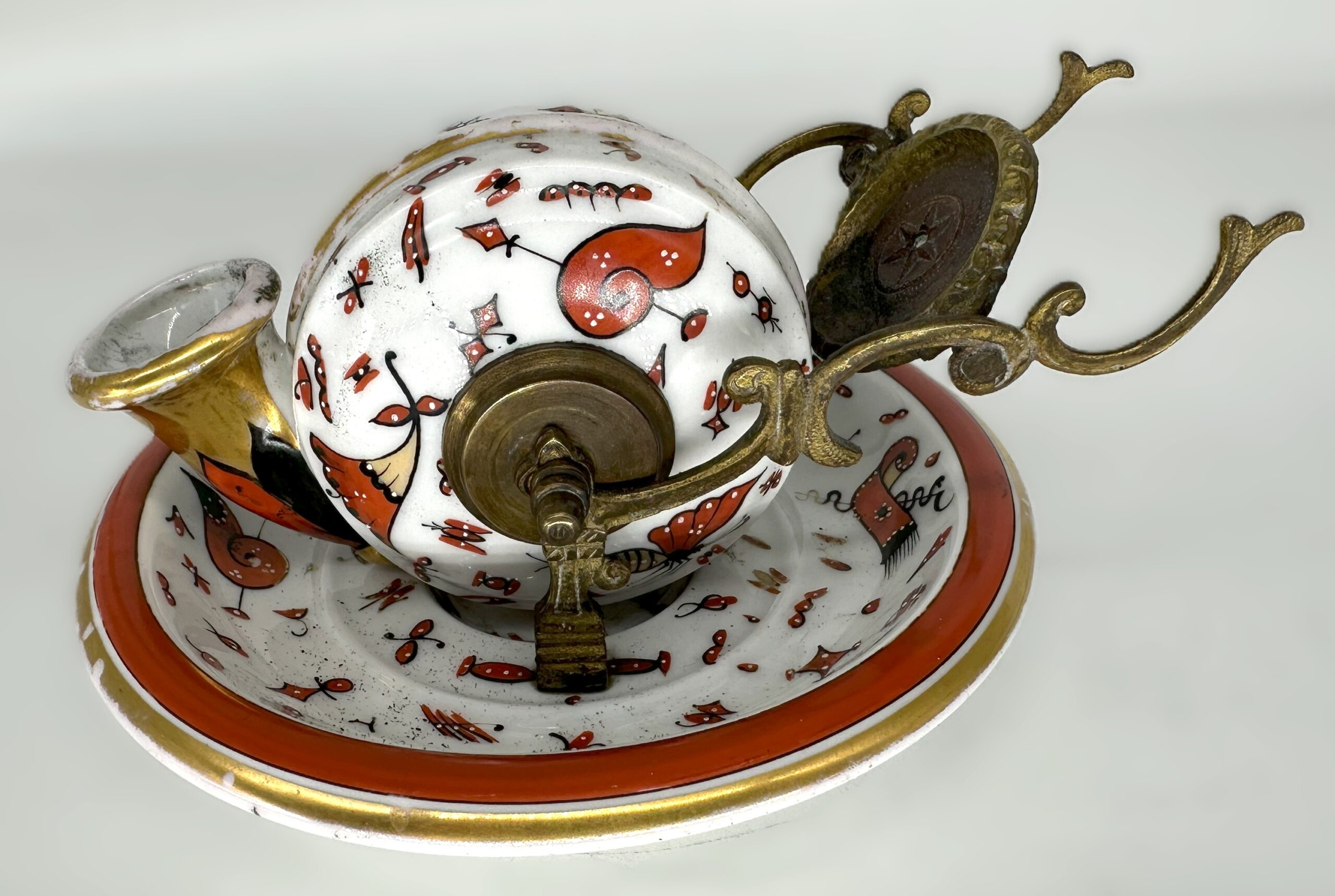 • Porcelain Snail Reservoir: Shaped like a stylized snail shell, the reservoir is decorated with hand-painted insects, butterflies, and abstract floral motifs in red, black, and gold on a white ground.