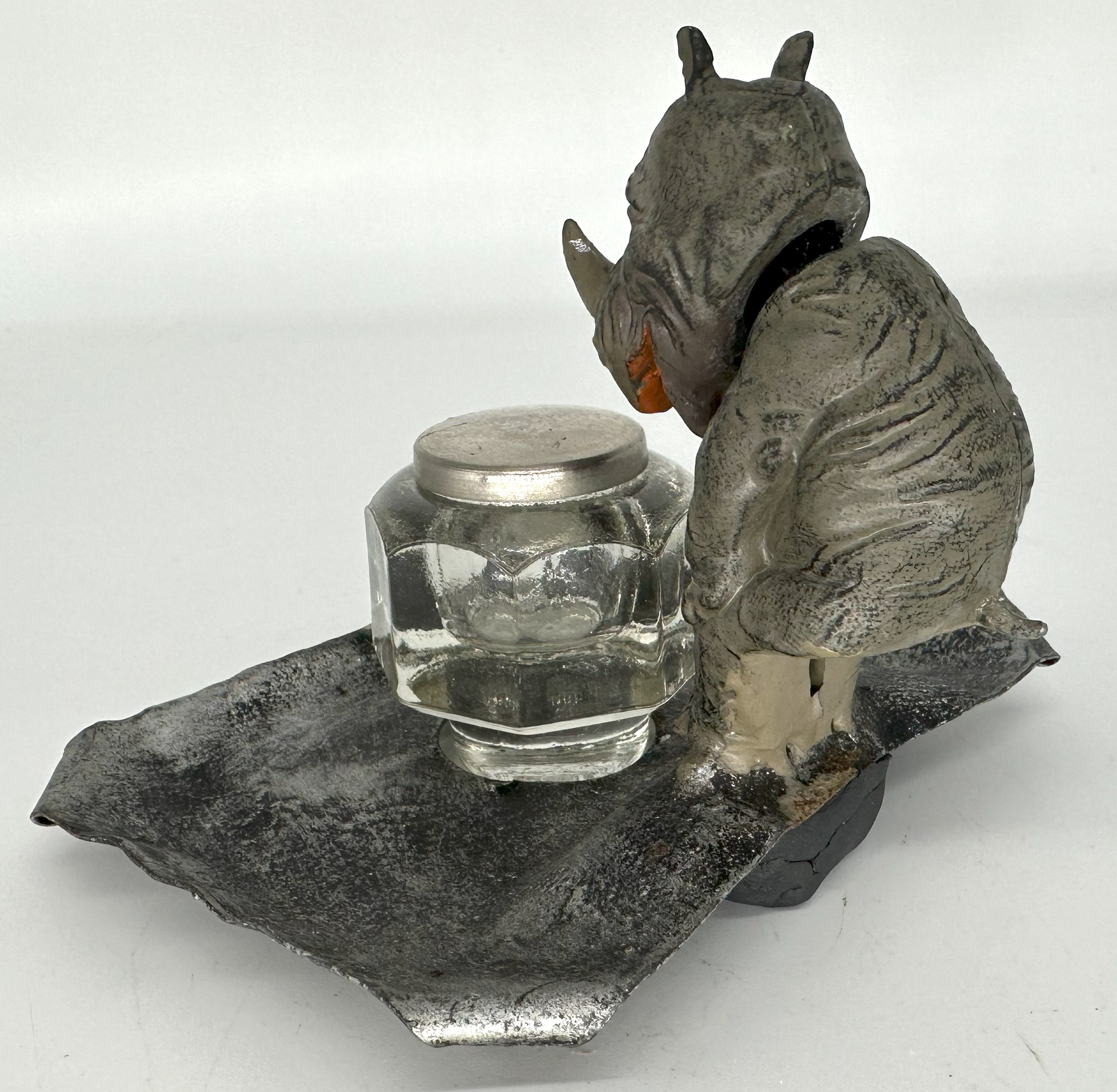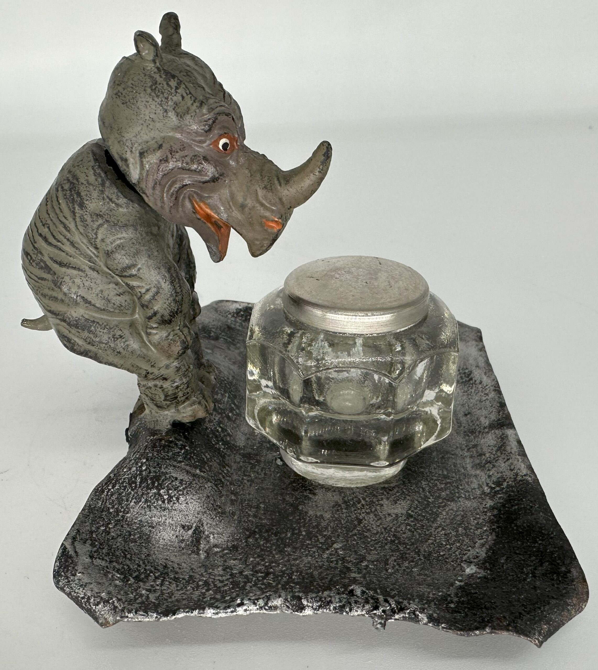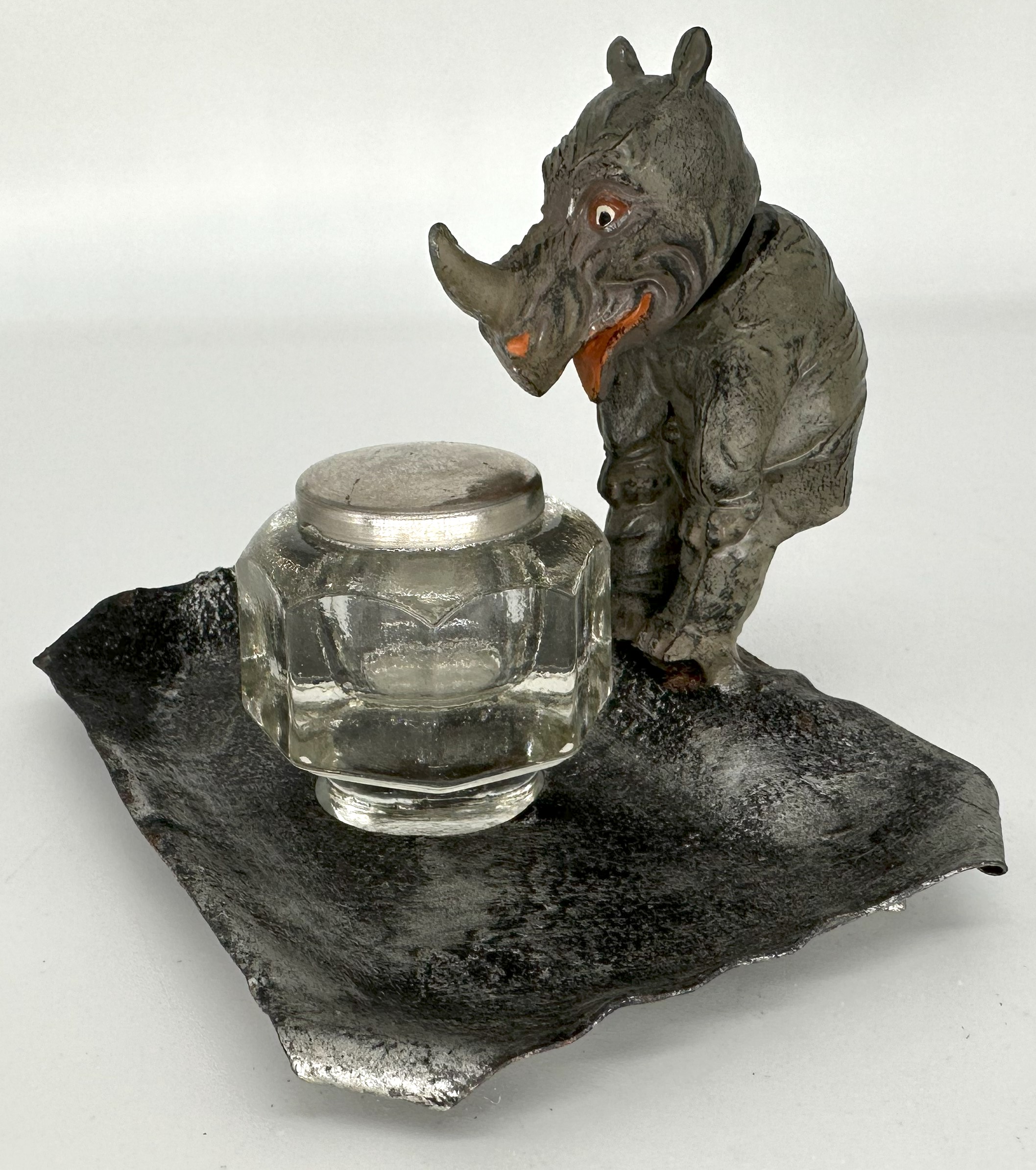 A friendly rhinoceros with a bobbling head watches over an inkwell.