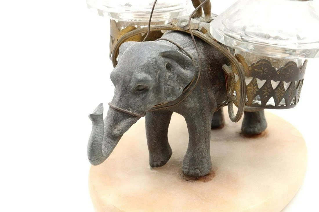 - Base: The elephant figure stands on a polished oval Alabaster base. Alabaster was a popular choice for the bases of figural desk sets in the late 19th century.