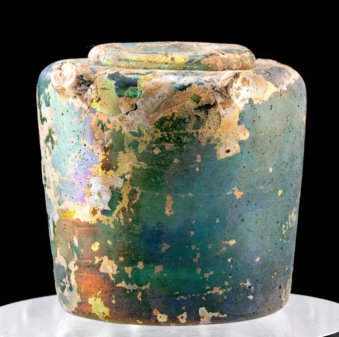 Roman ca. 100 to 350 CE. A wonderful glass inkwell in thick green glass. Circular form with 4 small lugs at the shoulder, raised glass rim emerging from the center. This glass has developed a most intense rainbow iridescence.