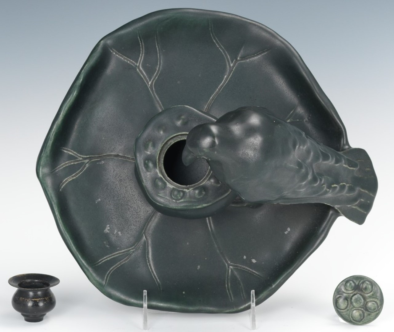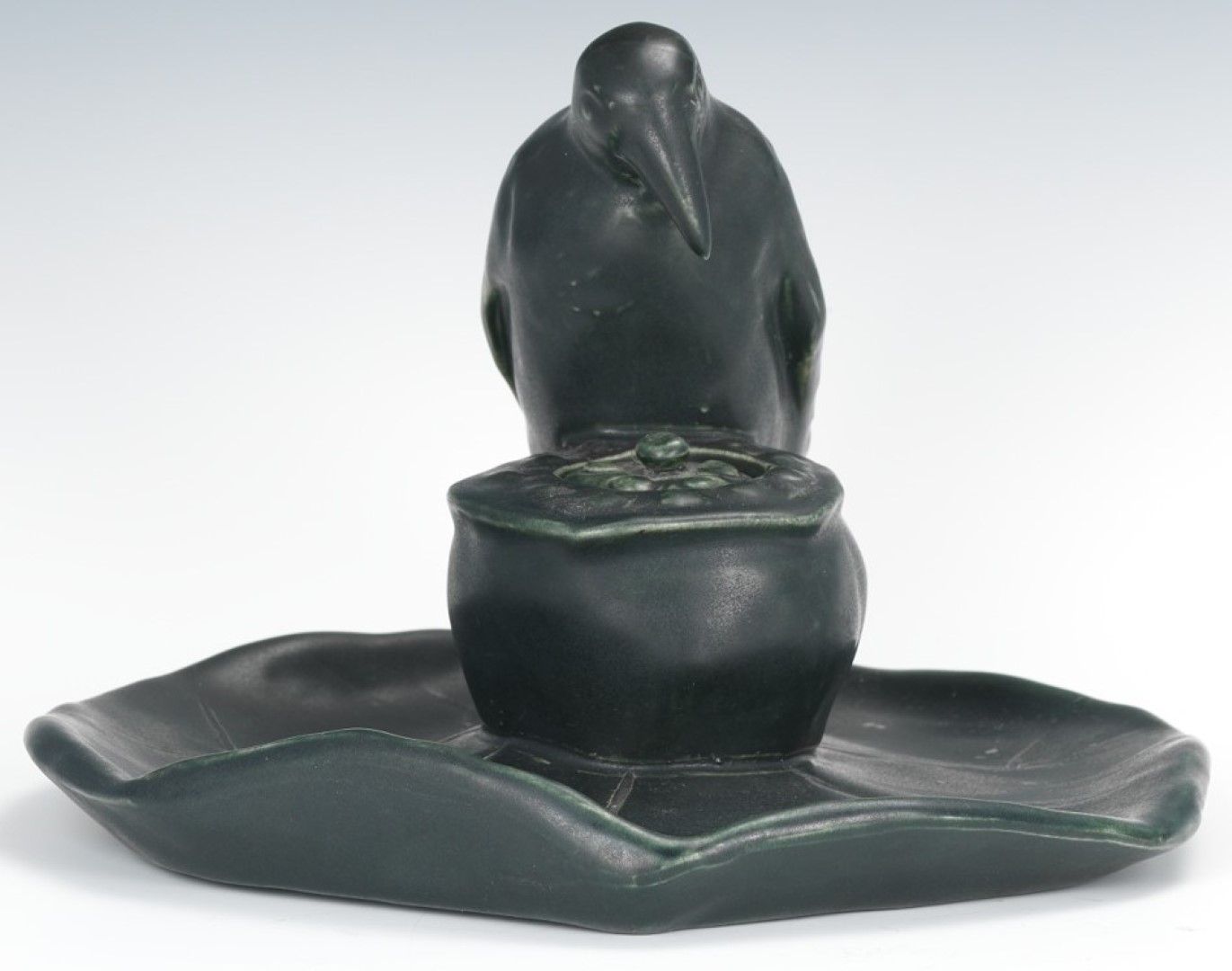 Rookwood figural inkwell with a large Rook standing on a lily pad with the inkwell shaped like a central pod, with metal insert, impressed logo mark on the underside and pattern number 998. Vellum glaze in dark gray green.