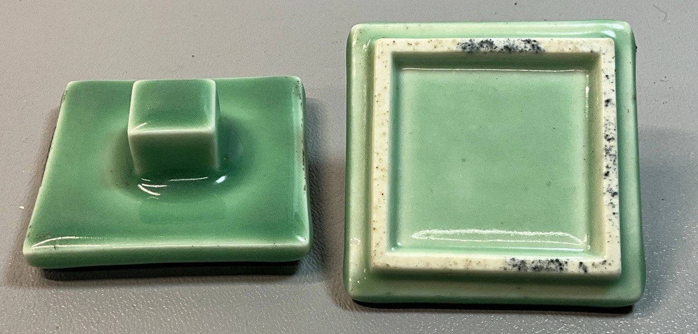 - Twin Wells: The top of the stand contains two circular receptacles for ink, each with a matching square, recessed lid featuring a block-style handle.